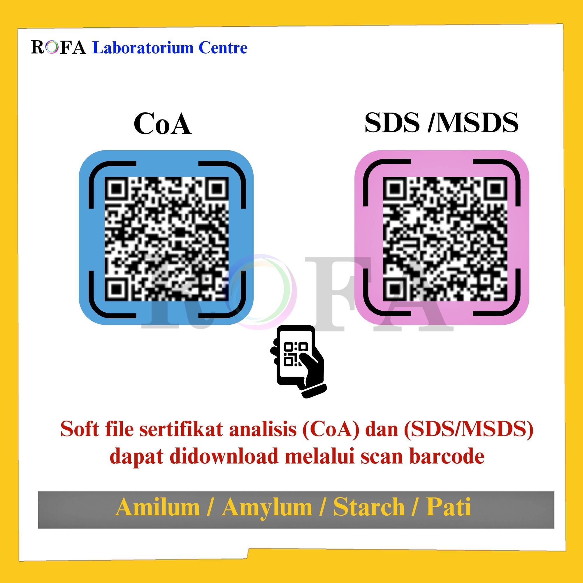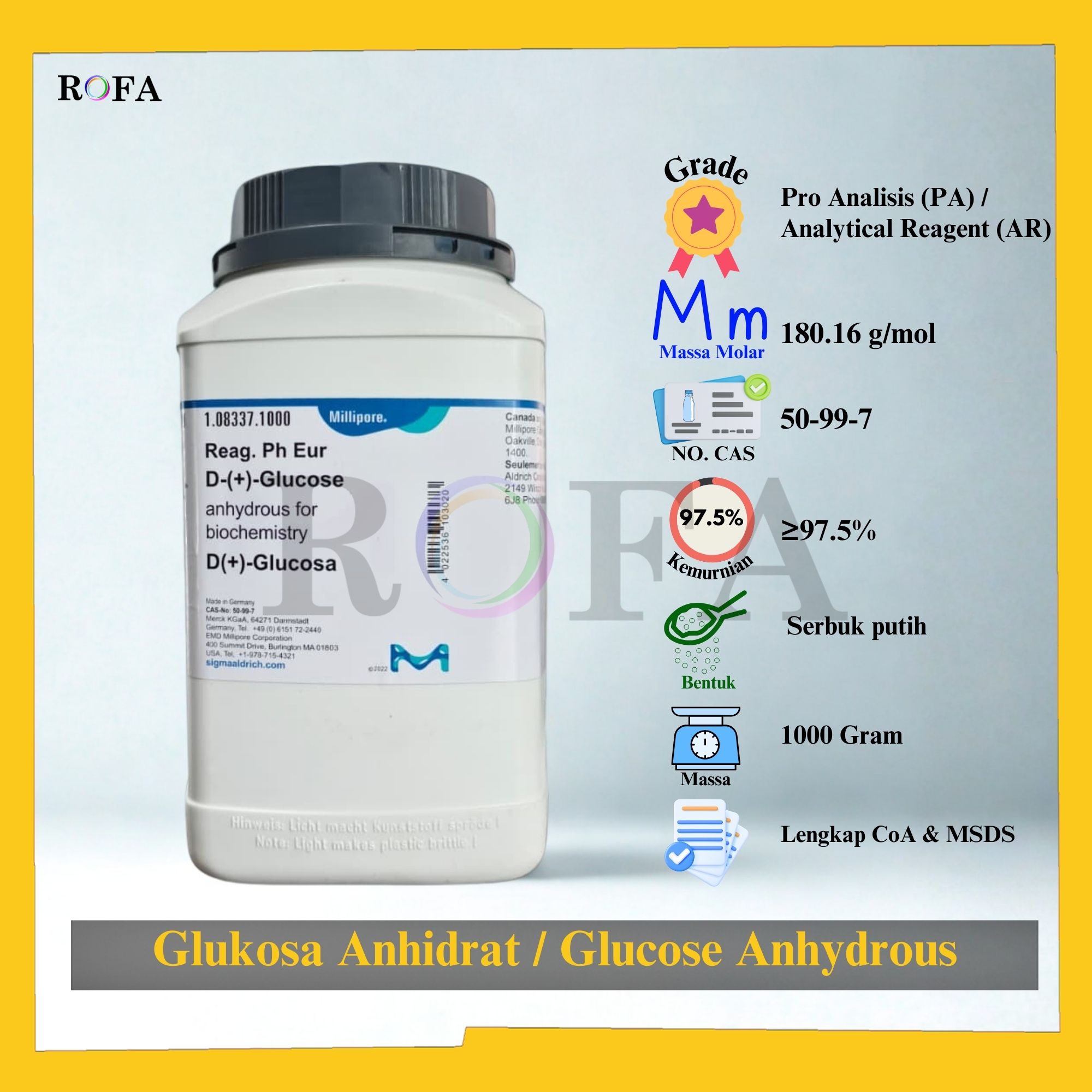 Lengkap dengan dokumen sertifikat analisis (CoA) dan MSDS / SDS (dikirim bersama barang atau bisa scan barcode).