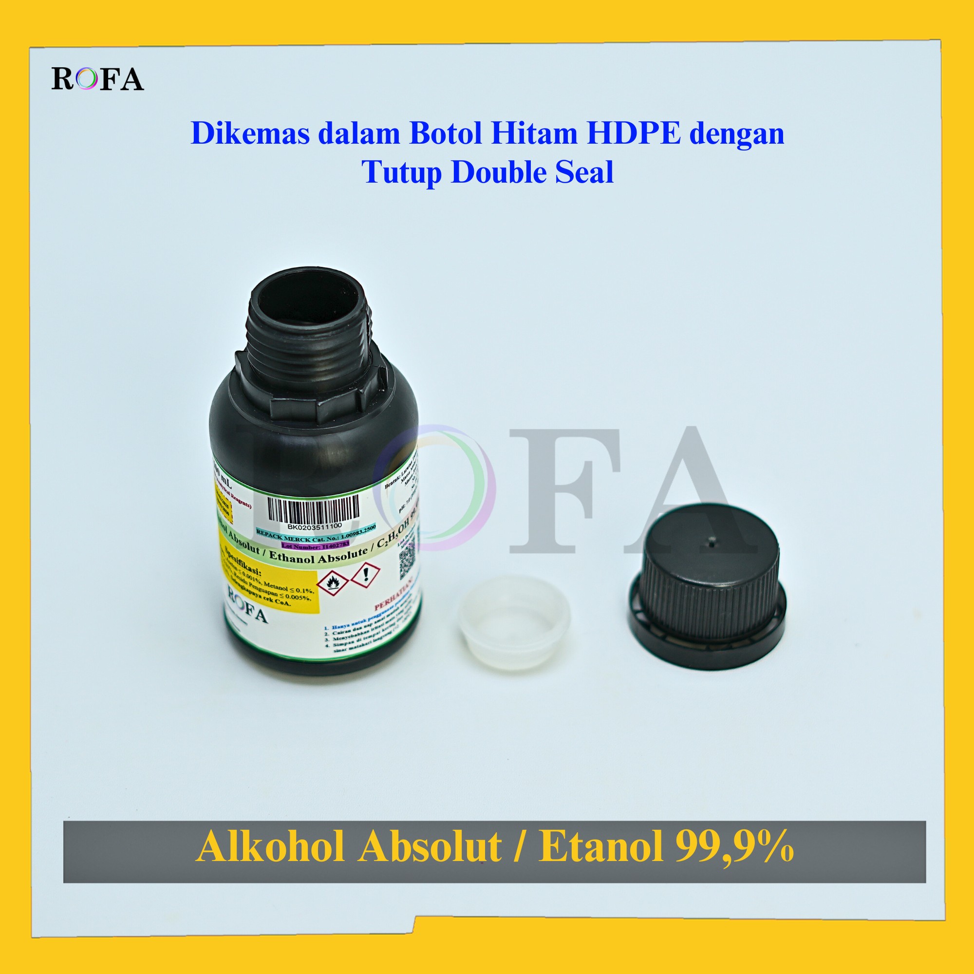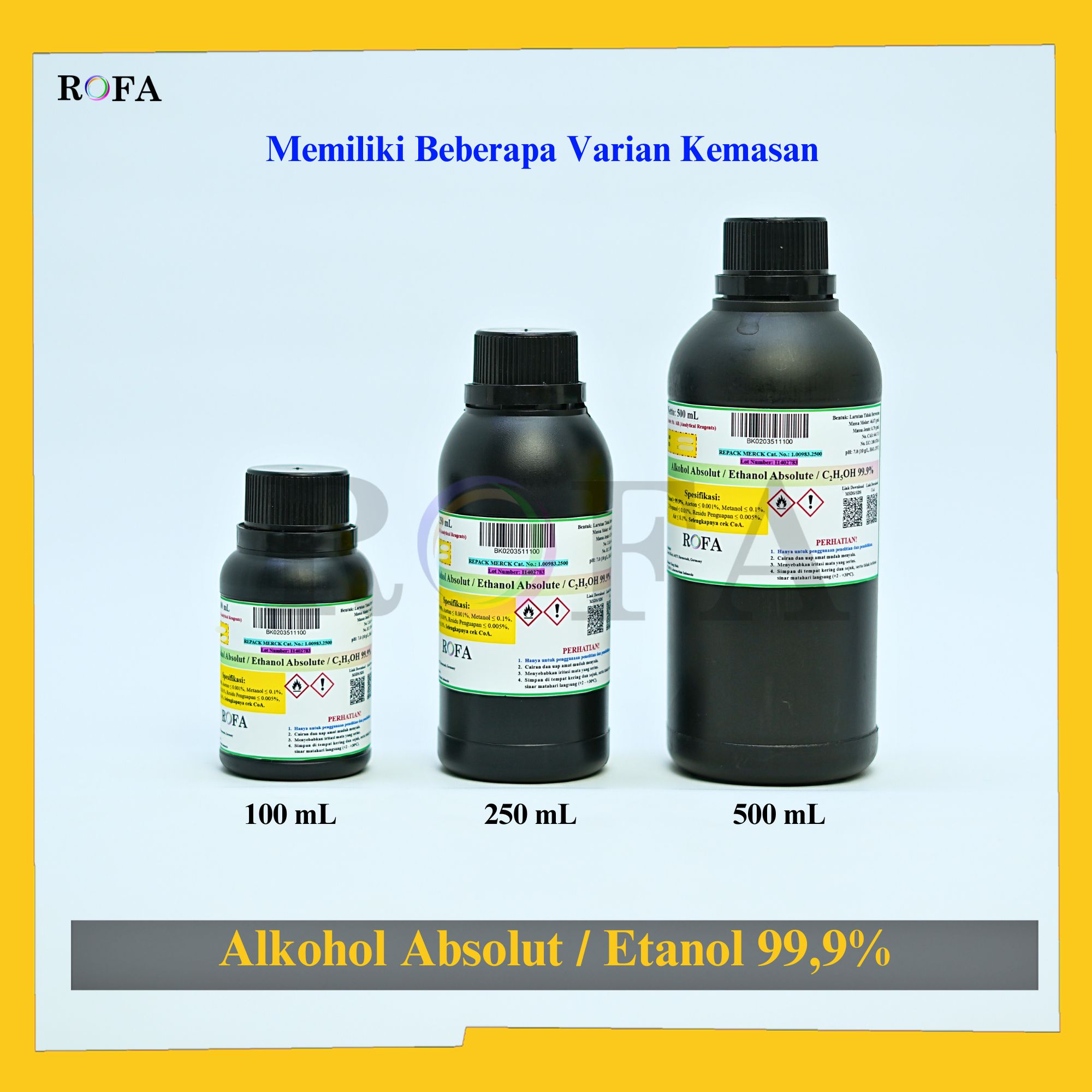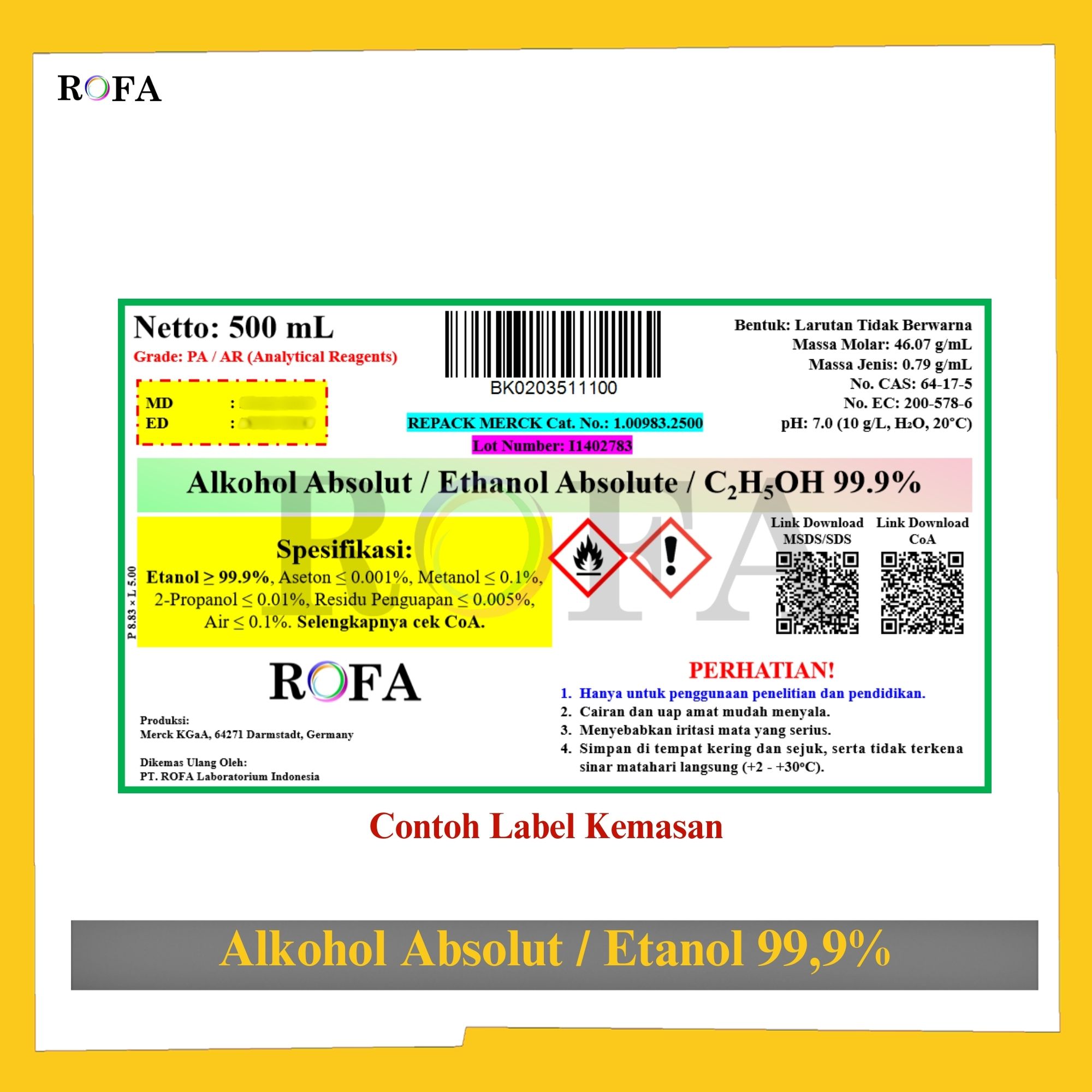 Nama Produk: MERCK Alkohol Absolut / Etanol / Ethanol / Etil Alkohol / Ethyl Alcohol / C2H5OH Pro Analisis Eceran 100 – 500 mL Merek / Brand: Merck, Jerman Catalogue Number: 1.00983.2500 Status: Repack (kemas...