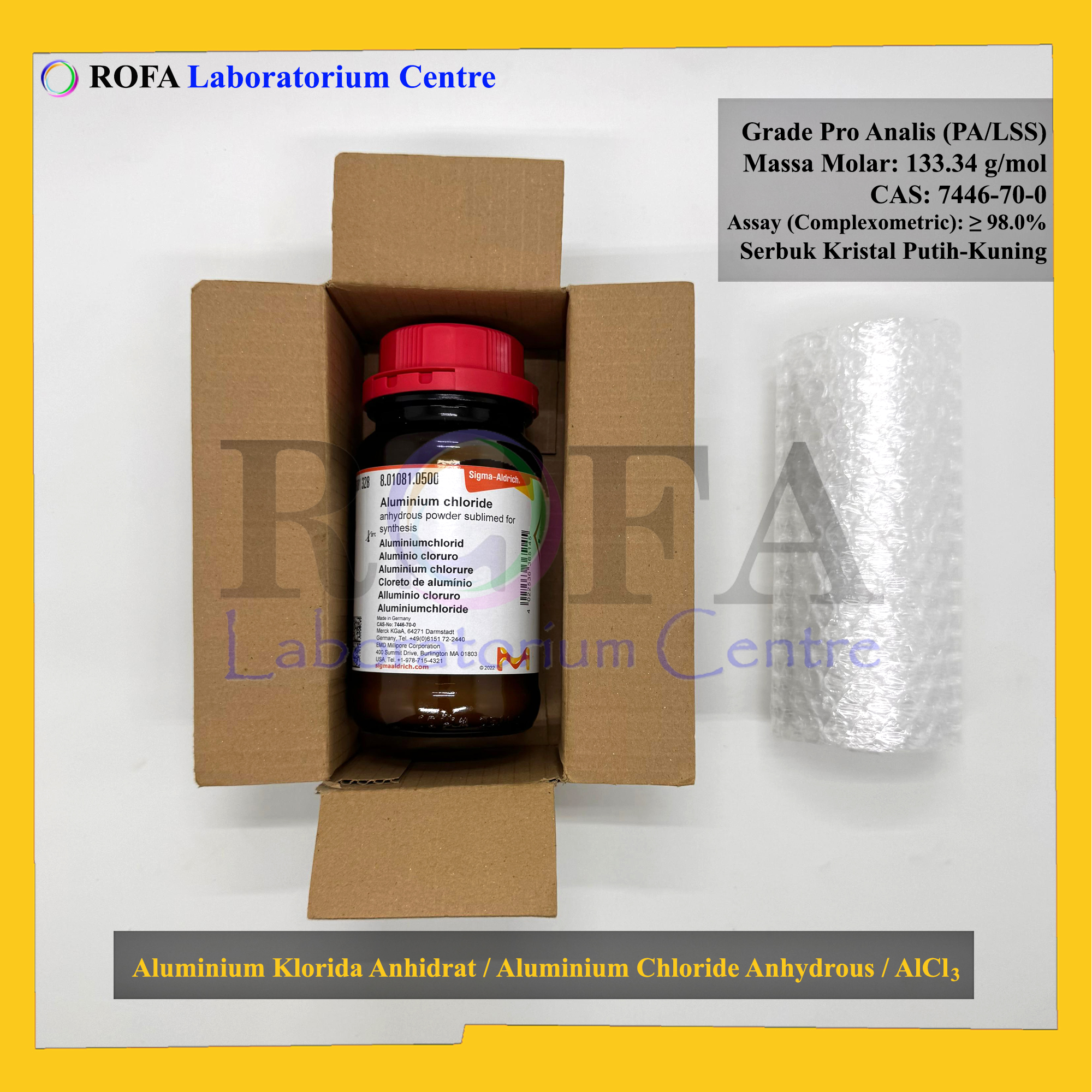 Nama Produk: MERCK Aluminium Klorida Anhidrat / Aluminium Chloride Anhydrous / AlCl3 Pro Analisis 500 – 1000 Gram