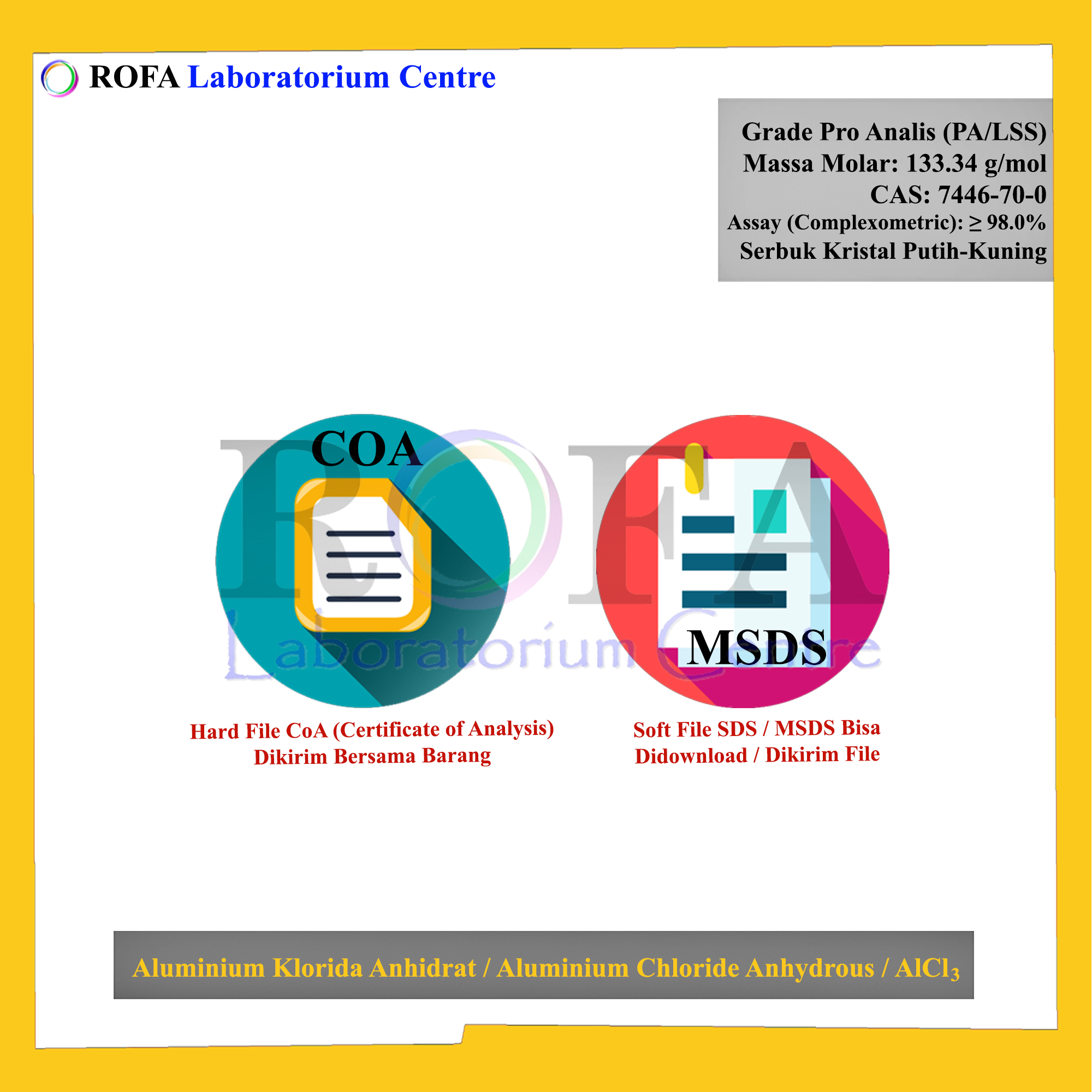 Lengkap dengan dokumen sertifikat analisis (CoA) dan MSDS / SDS (dikirim bersama barang atau bisa scan barcode).