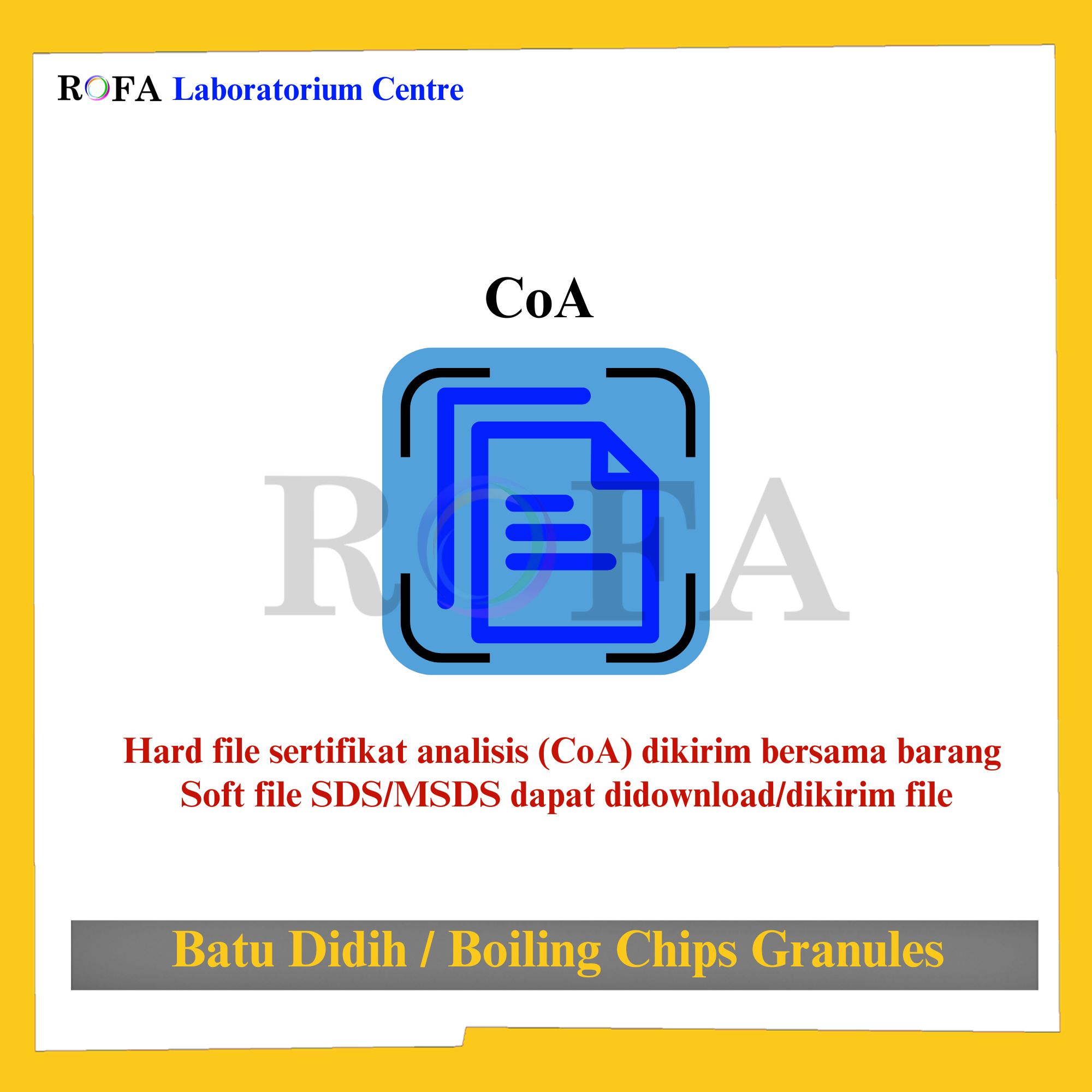 Lengkap dengan dokumen sertifikat analisis (CoA) dan MSDS / SDS (dikirim bersama barang atau bisa scan barcode).