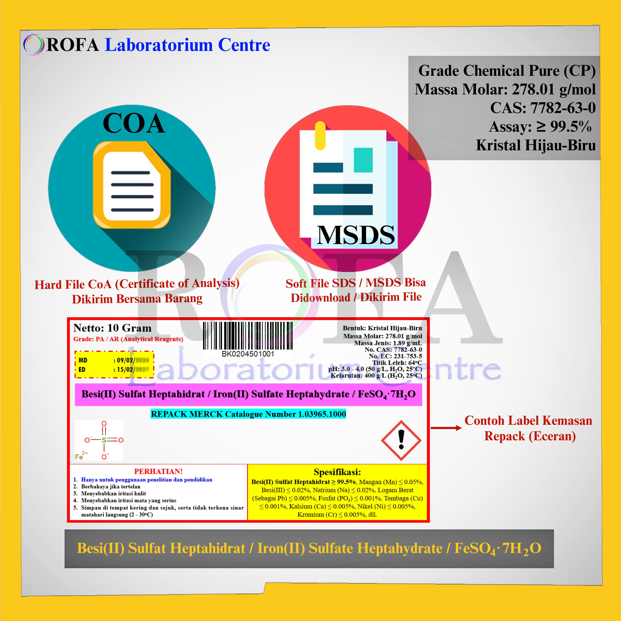 Nama Produk: MERCK Besi(II) Sulfat Heptahidrat / Iron(II) Sulfate Heptahydrate / FeSO4.7H2O Pro Analisis Eceran 1 Gram