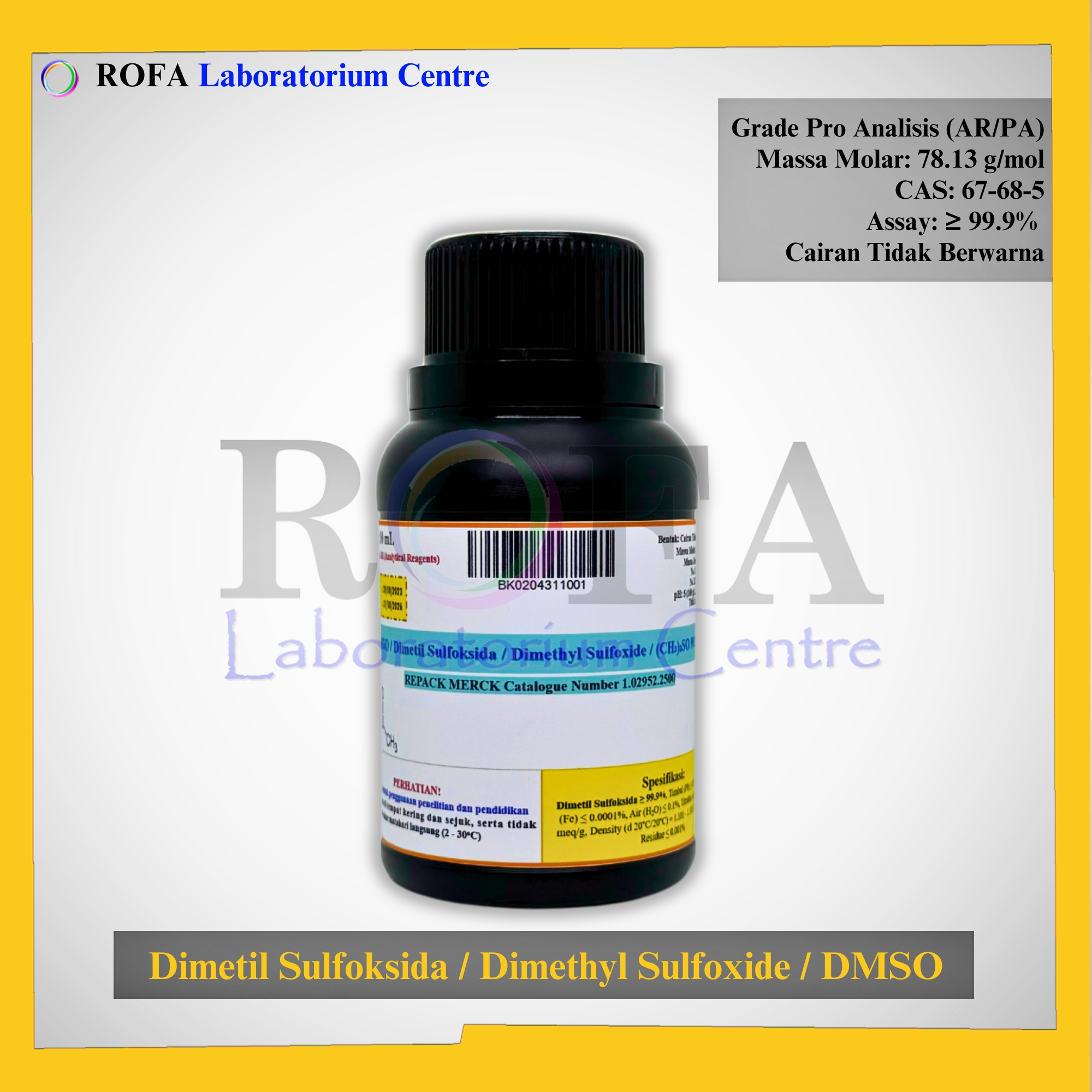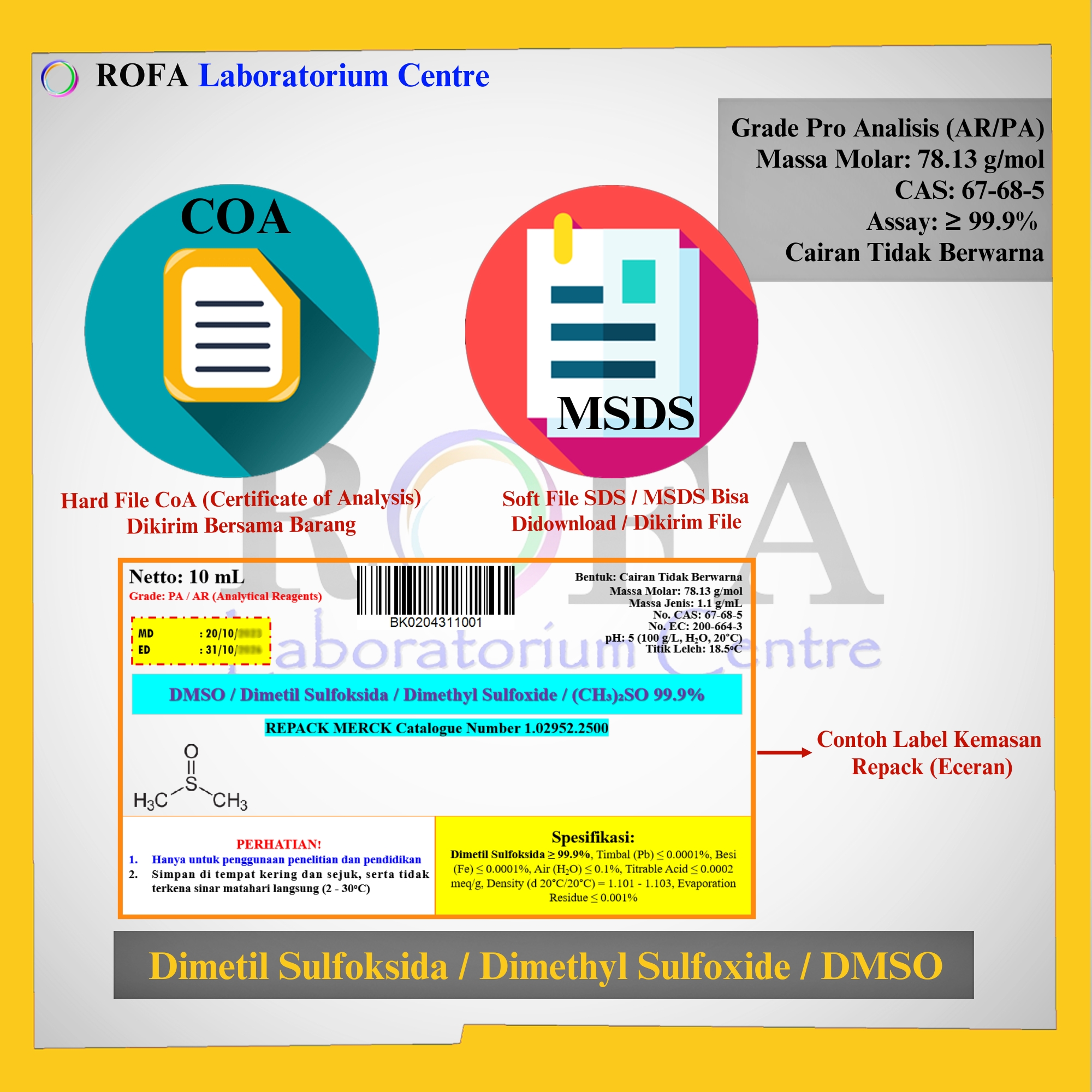 Nama Produk: MERCK DMSO / Dimetil Sulfoksida / Dimethyl Sulfoxide / (CH3)3SO 99.9% Pro Analisis Eceran 10 – 100 mL Catalogue Number: 1.02952.2500 Status: Repack (Kemas Ulang / Eceran) Lengkap dengan dokumen sertifikat analisis (CoA)...