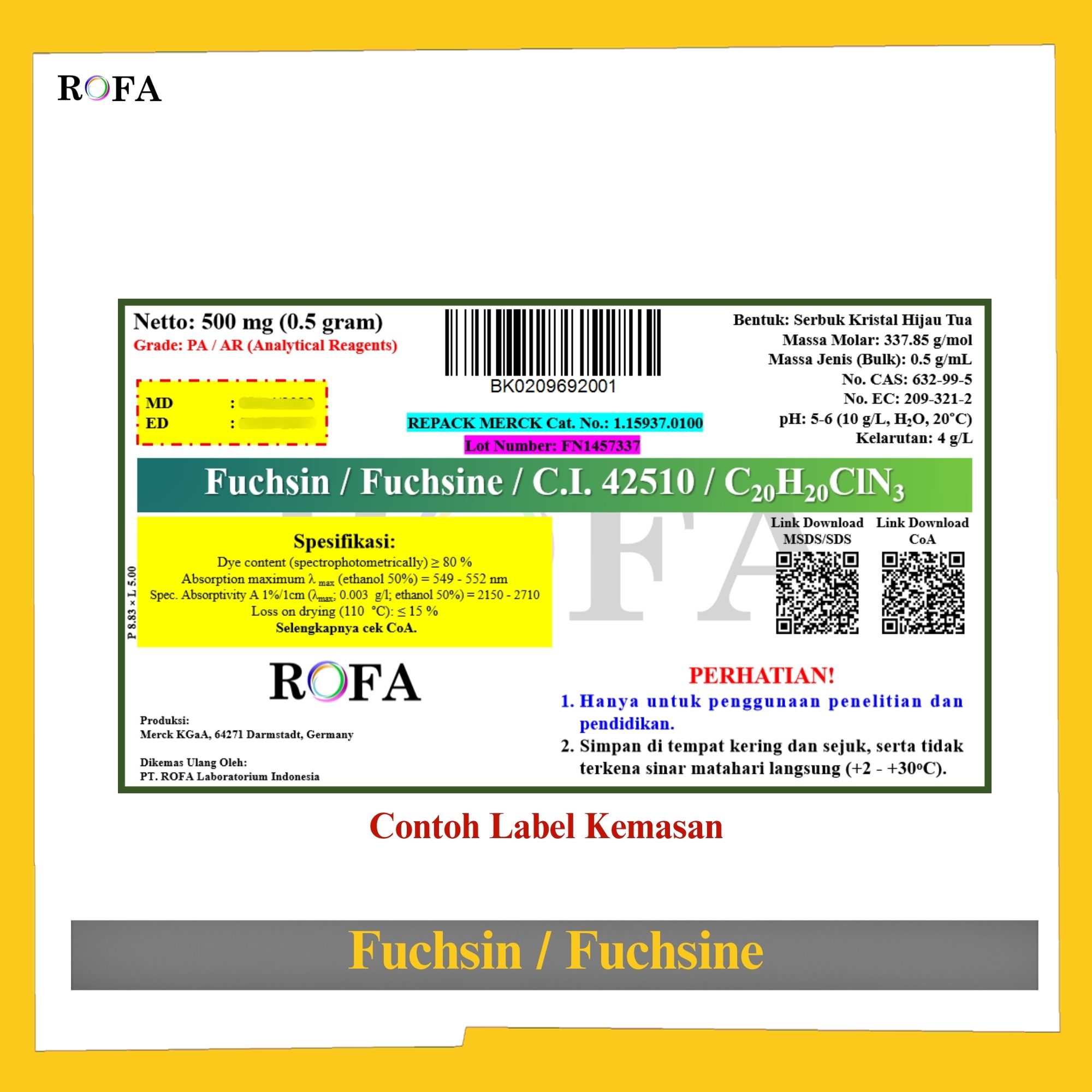 Lengkap dengan dokumen sertifikat analisis (CoA) dan MSDS / SDS (dikirim bersama barang atau bisa scan barcode).