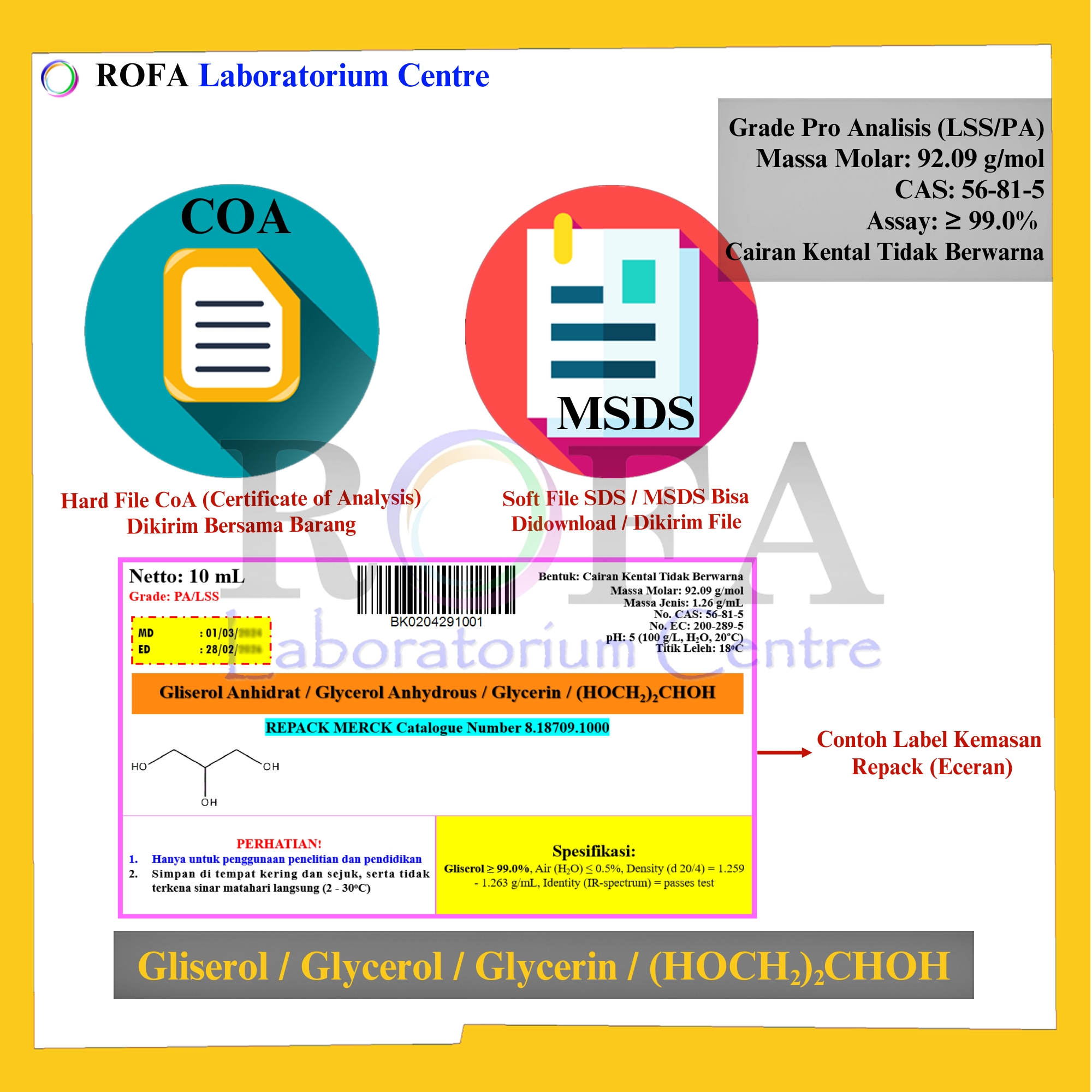 Lengkap dengan dokumen sertifikat analisis (CoA) dan MSDS / SDS (dikirim bersama barang atau bisa scan barcode).