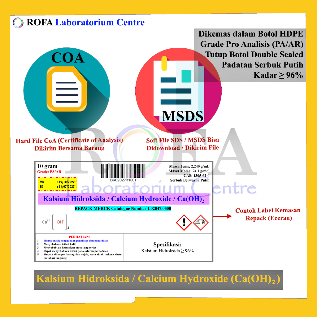 Lengkap dengan dokumen sertifikat analisis (CoA) dan MSDS / SDS (dikirim bersama barang atau bisa scan barcode).