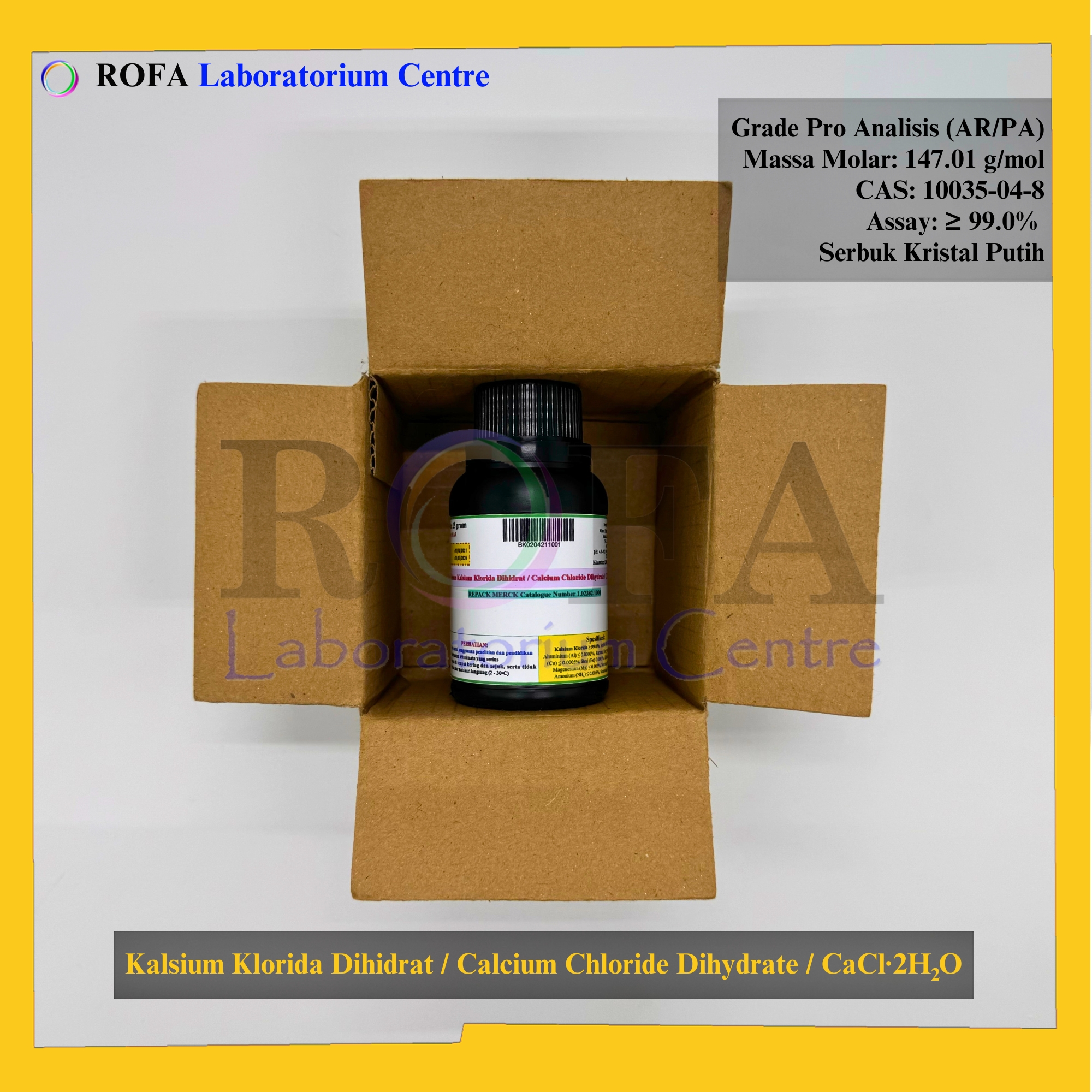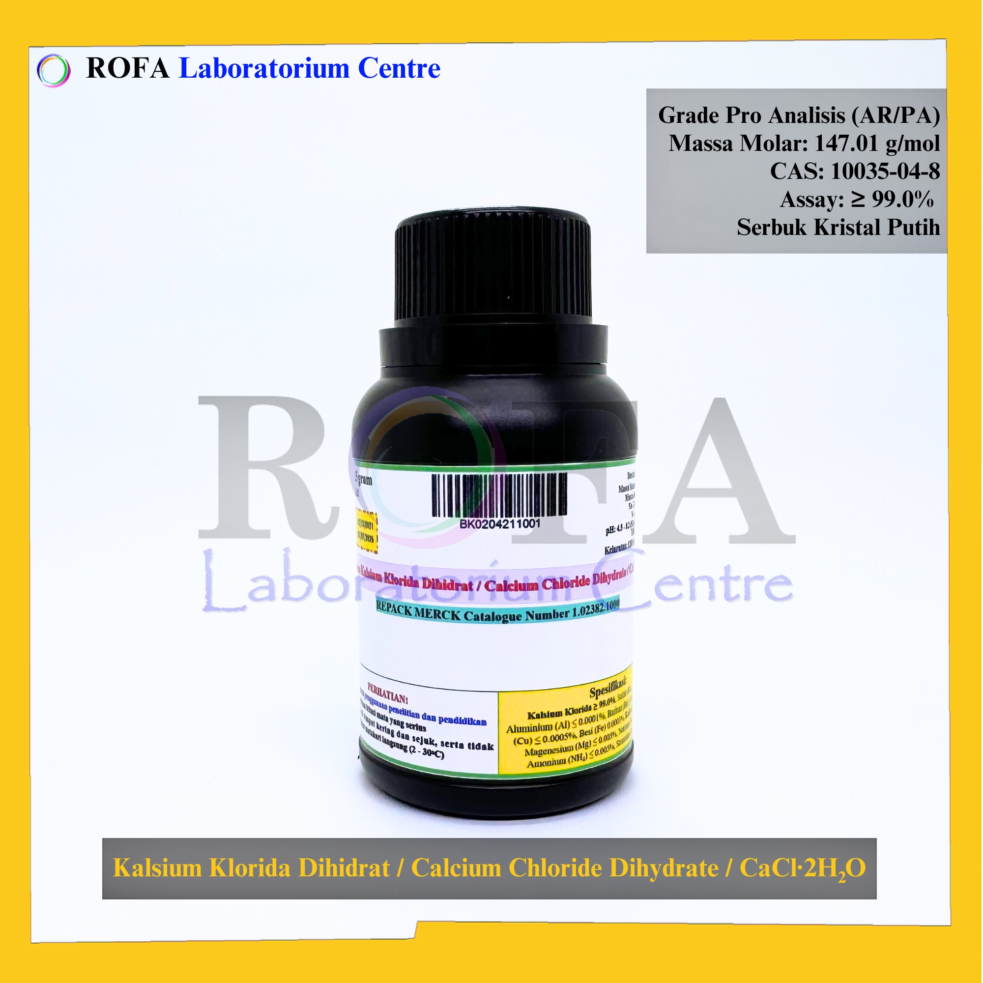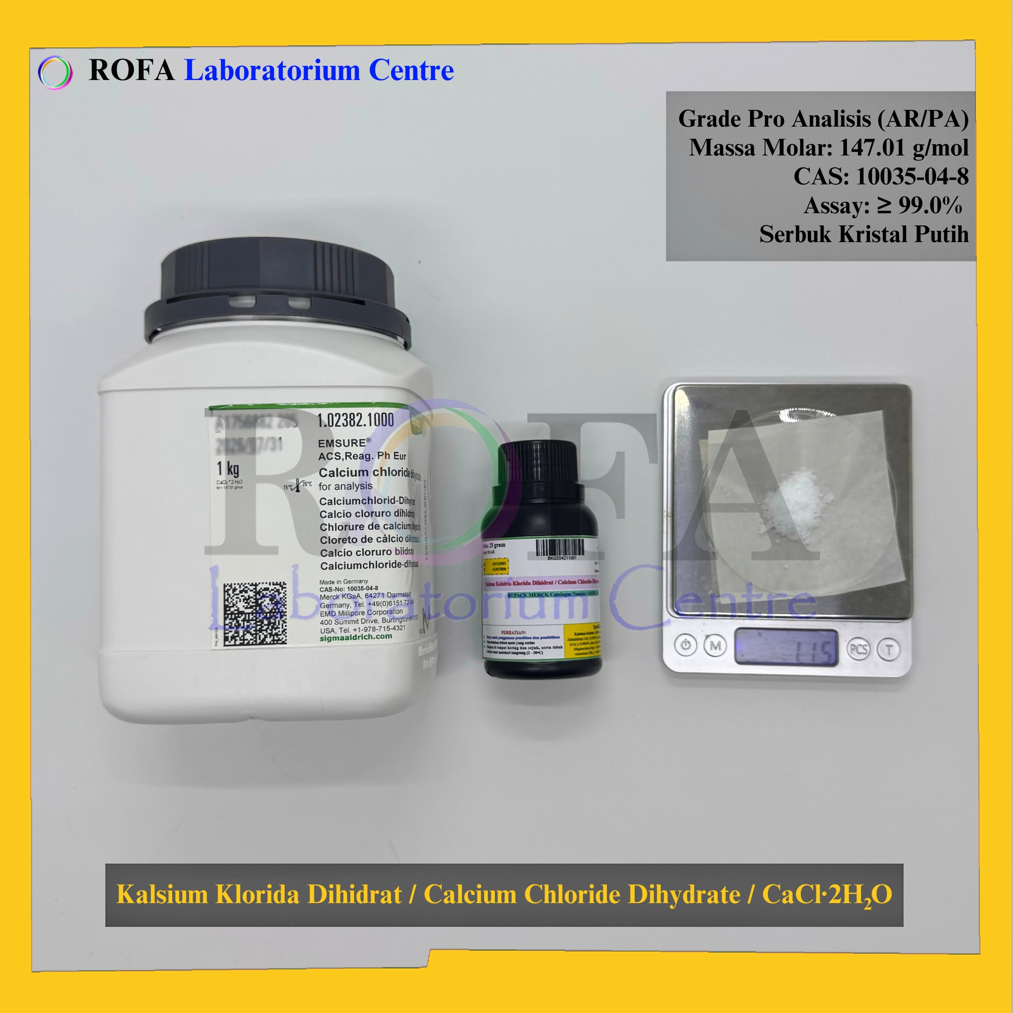Nama Produk: MERCK Kalsium Klorida Dihidrat / Calcium Chloride Dihydrate / CaCl2.2H2O Pro Analisis Eceran 1 Gram