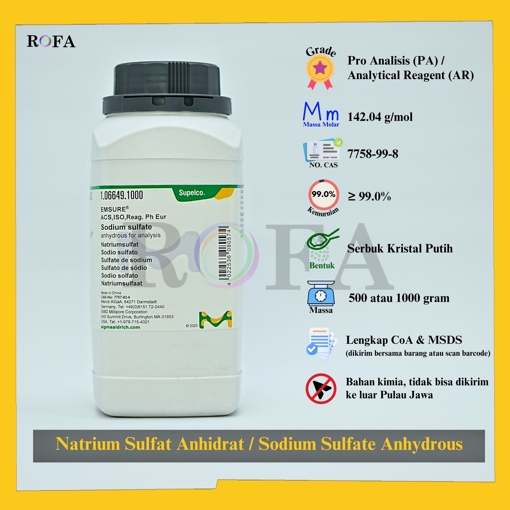 Nama Produk: MERCK Kalsium Oksida / Calcium Oxide / CaO 3 – 20 mm 95% Pro Analisis 1000 Gram Merek / Brand: Merck, Jerman Catalogue Number: 1.02109.1000 Status: Original Pack (Kemasan Asli) Lengkap dengan dokumen...