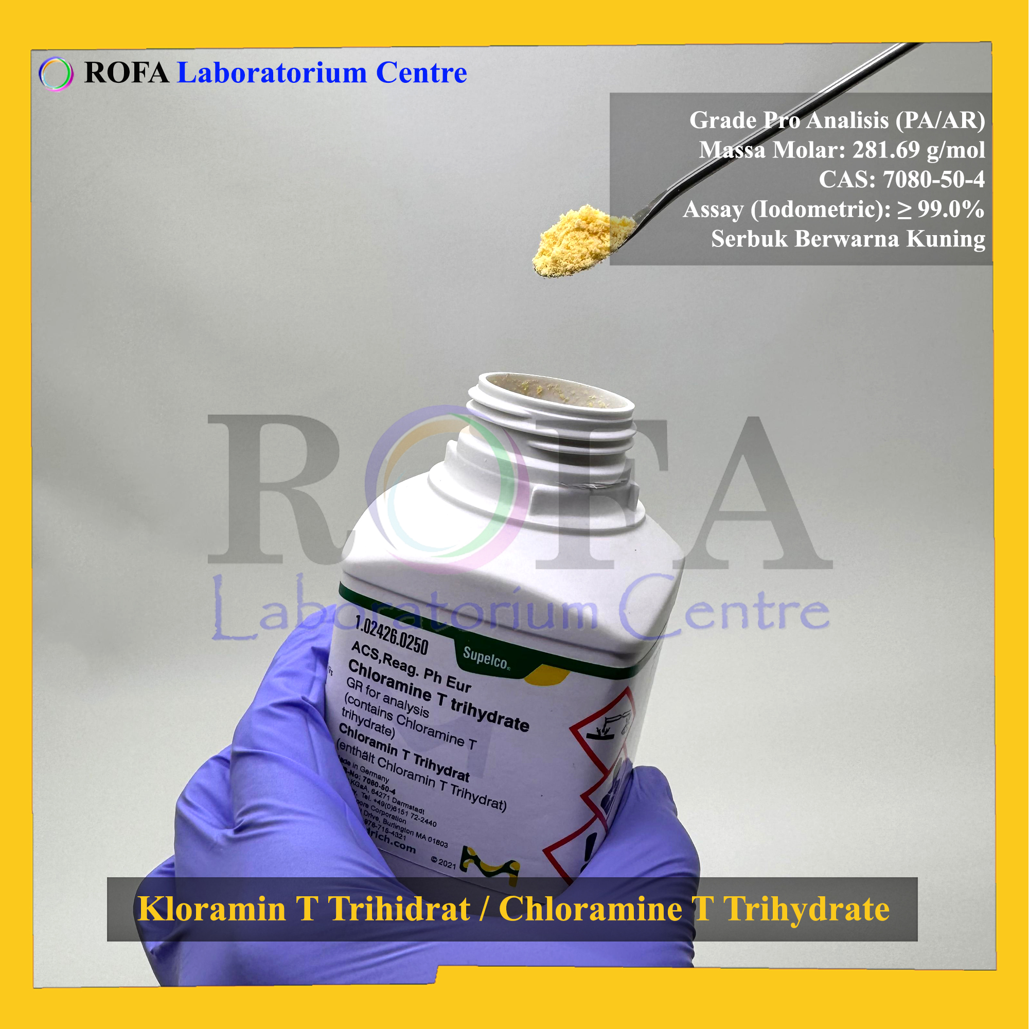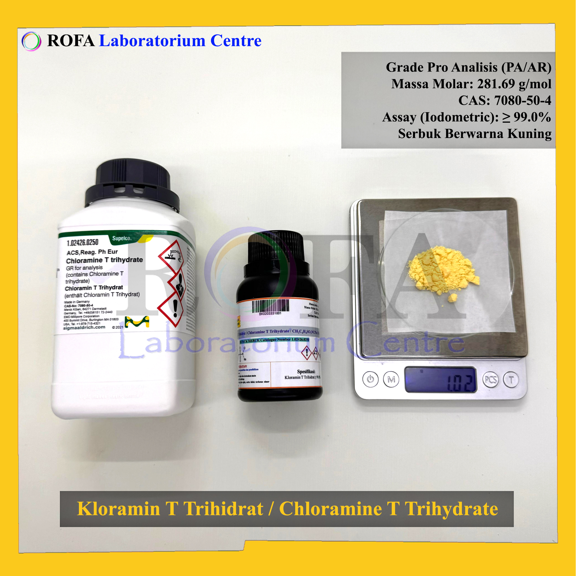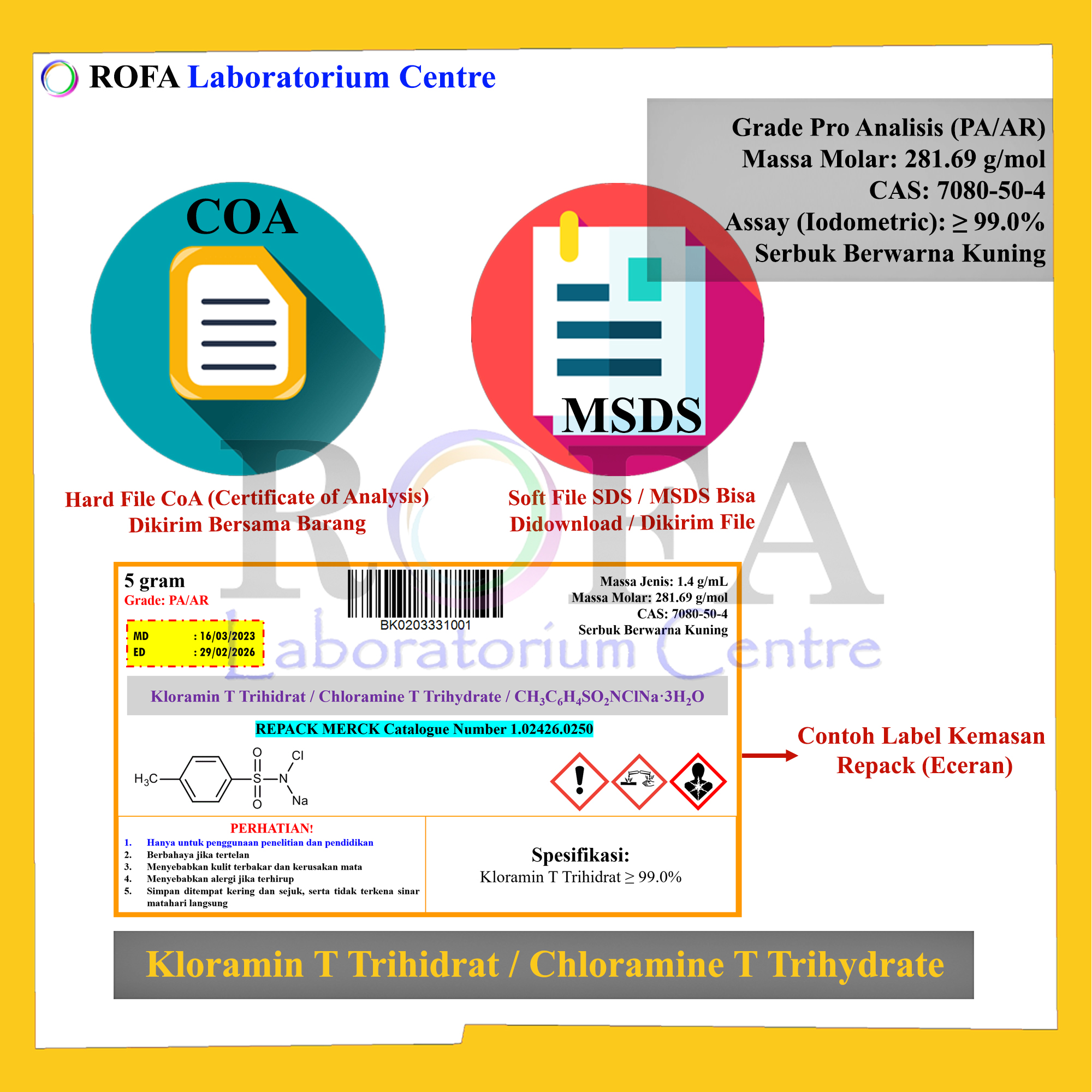 Nama Produk: MERCK Kloramin T Trihidrat / Chloramine T Trihydrate / CH3C6H4SO2NClNa·3H2O Pro Analisis Eceran 1 Gram