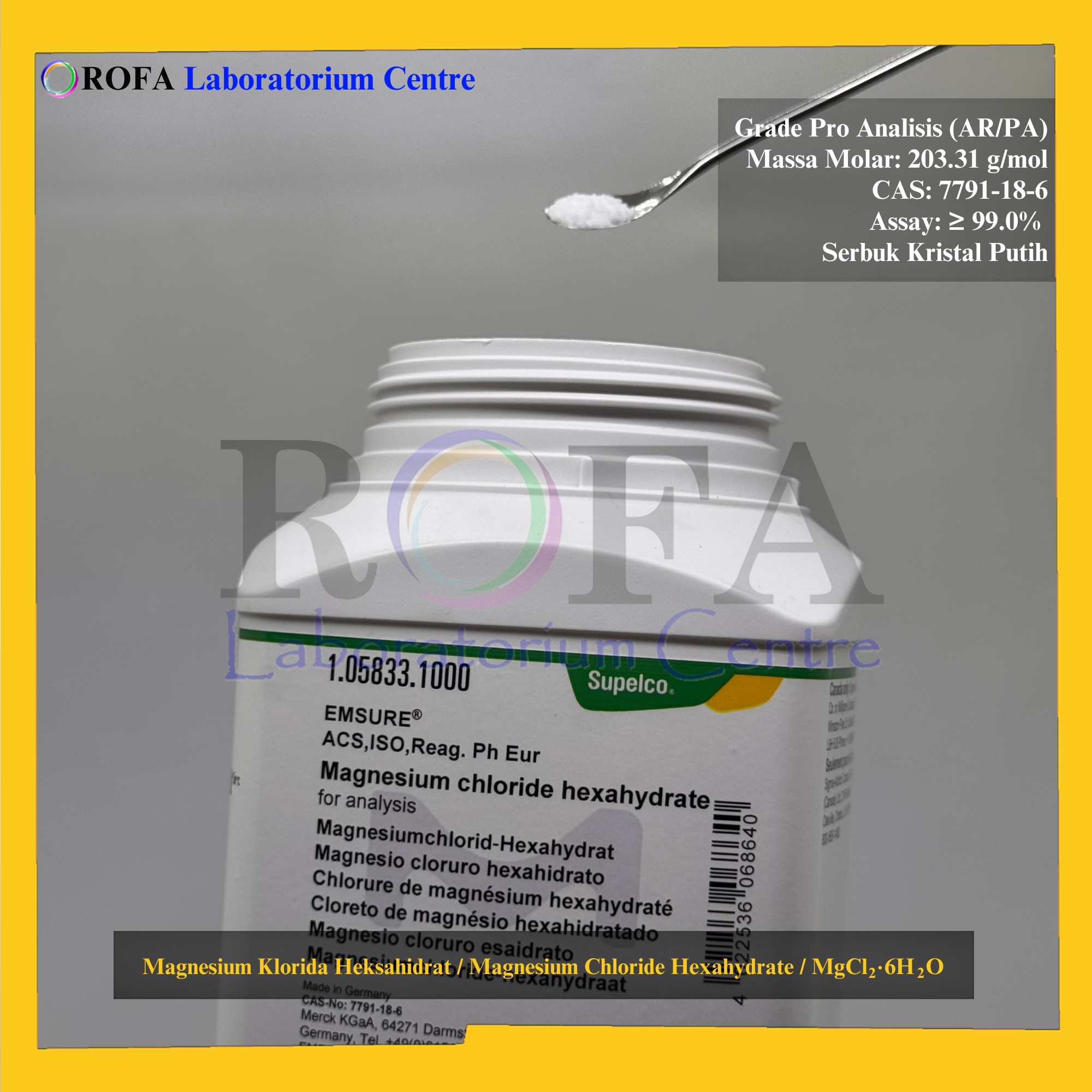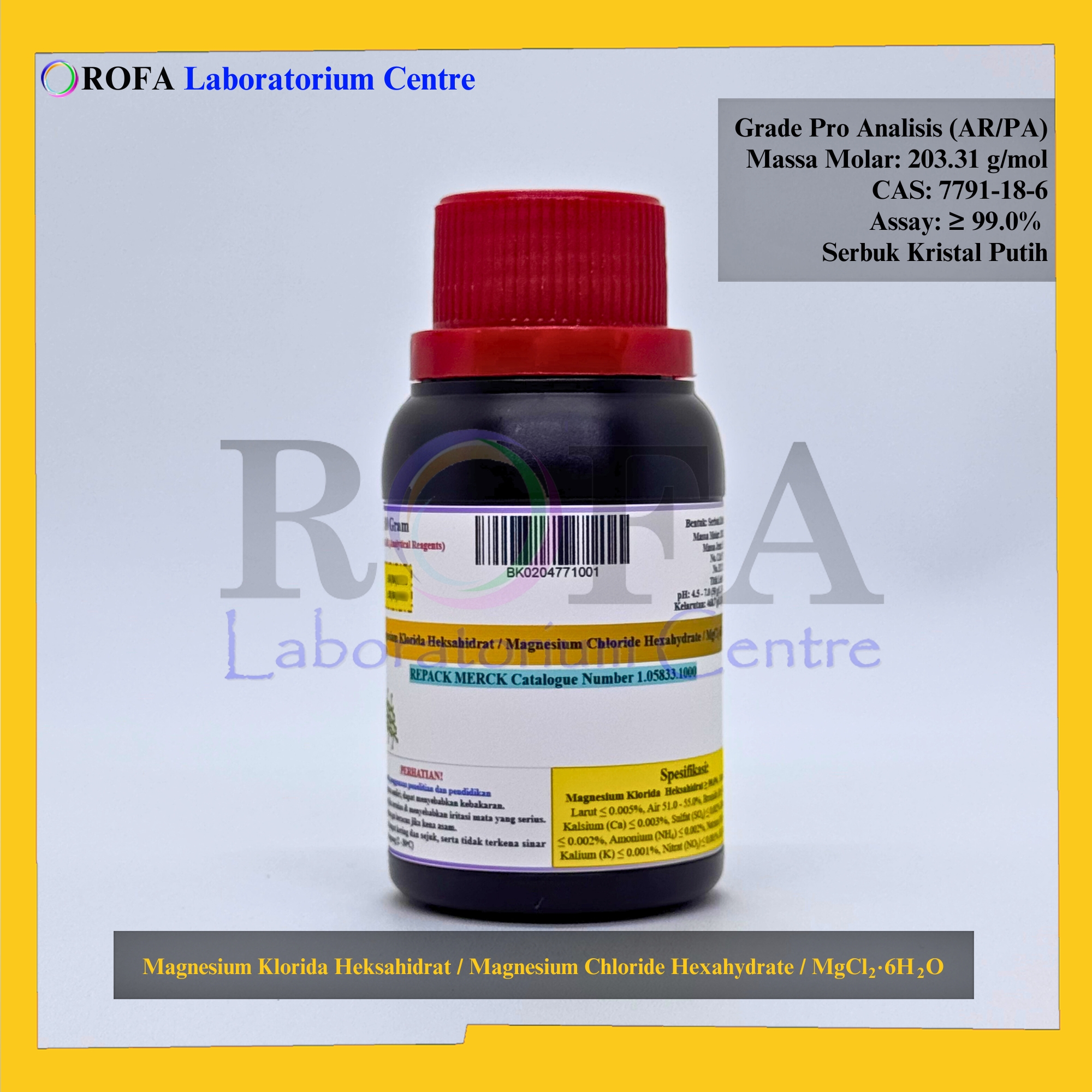 Nama Produk: Merck Magnesium Klorida Heksahidrat / Magnesium Chloride Hexahydrate / MgCl2.6H2O Pro Analisis Eceran 1 Gram