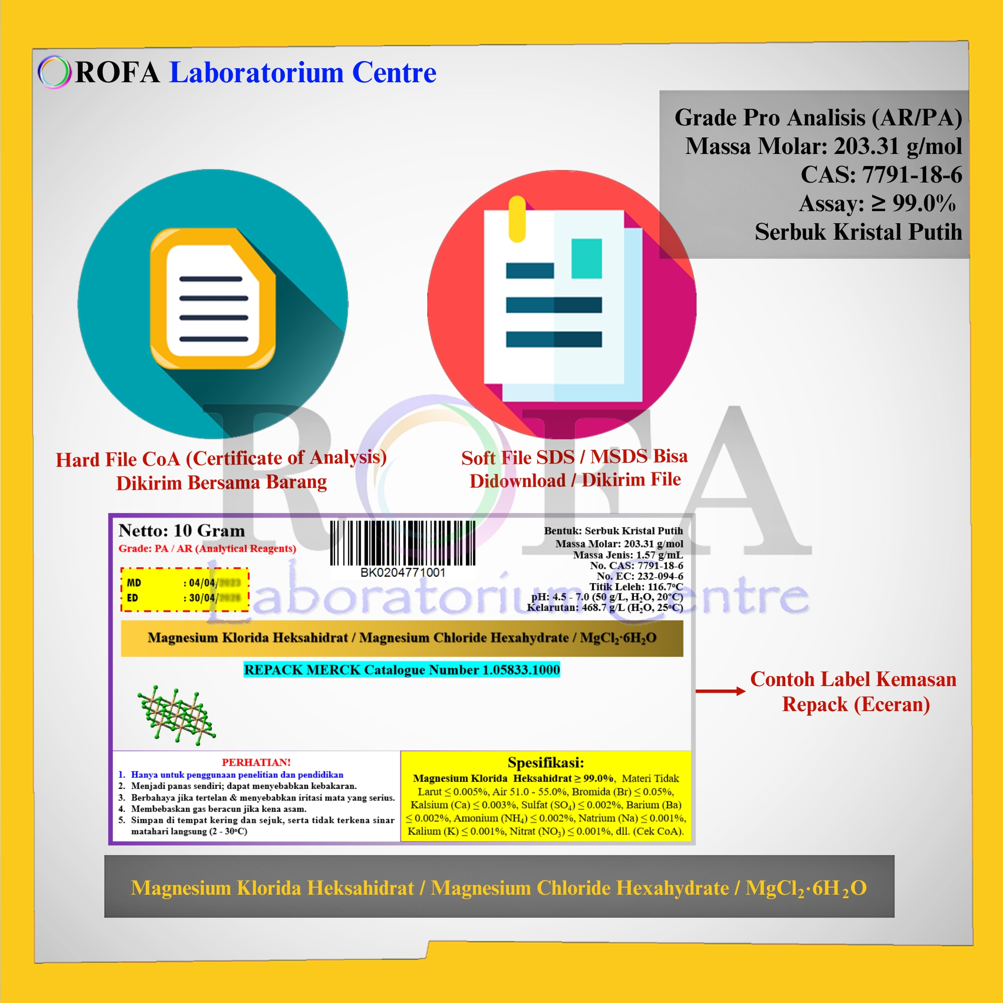 Lengkap dengan dokumen sertifikat analisis (CoA) dan MSDS / SDS (dikirim bersama barang atau bisa scan barcode).