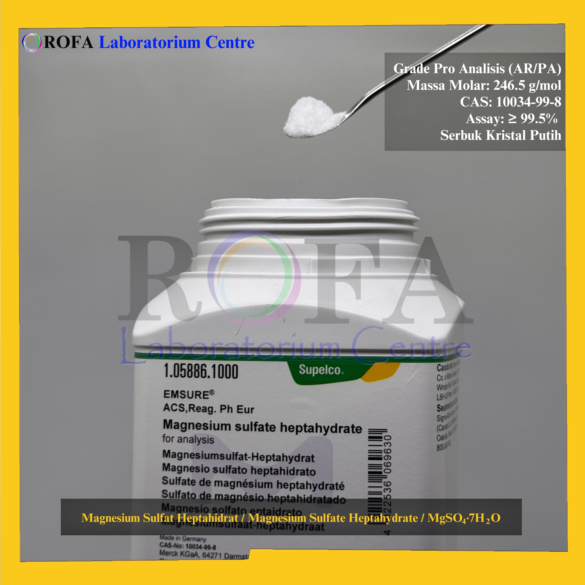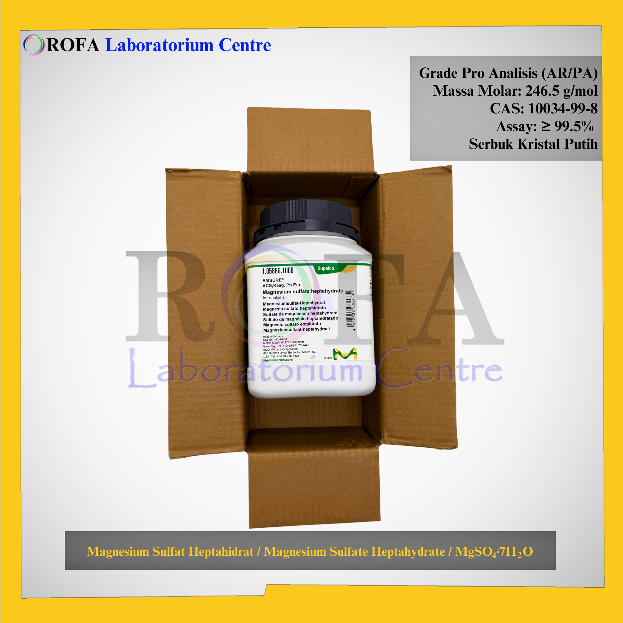 Nama Produk: Merck Magnesium Sulfat Heptahidrat / Magnesium Sulfate Heptahydrate / MgSO4.7H2O Pro Analisis 500 – 1000 Gram