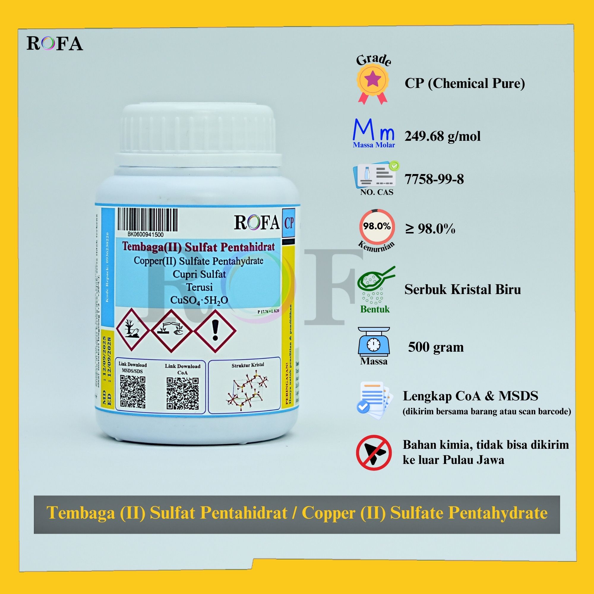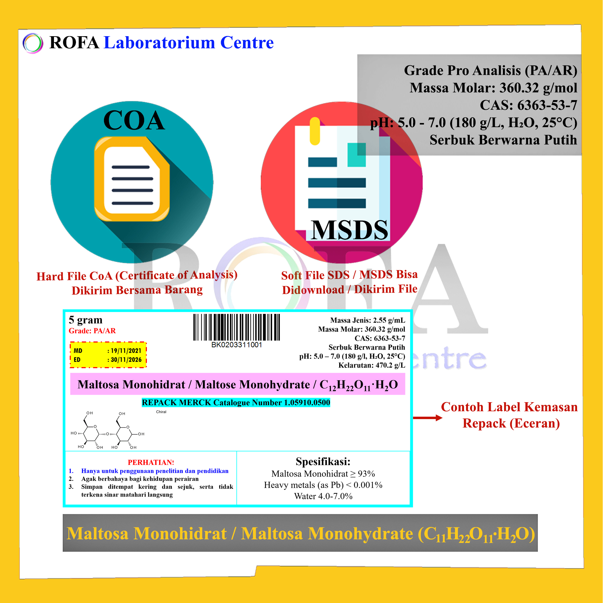 Nama Produk: Merck Maltosa Monohidrat / Maltose Monohydrate / C12H22O11·H2O Pro Analisis 500 Gram Merek / Brand: Merck, Jerman Catalogue Number: 1.05910.0500 Status: Original Pack (Kemasan Asli) Lengkap dengan dokumen sertifikat analisis (CoA) dan MSDS...