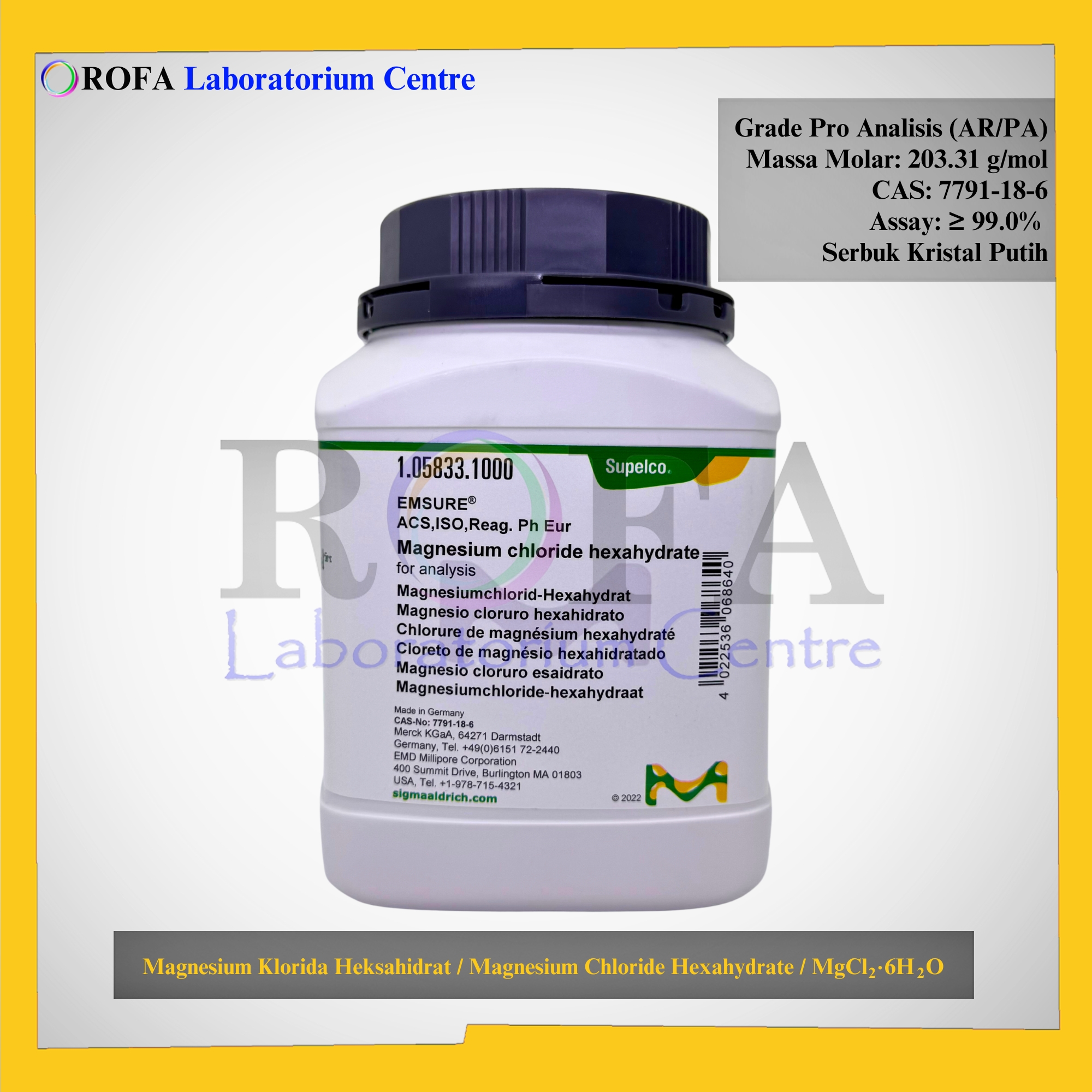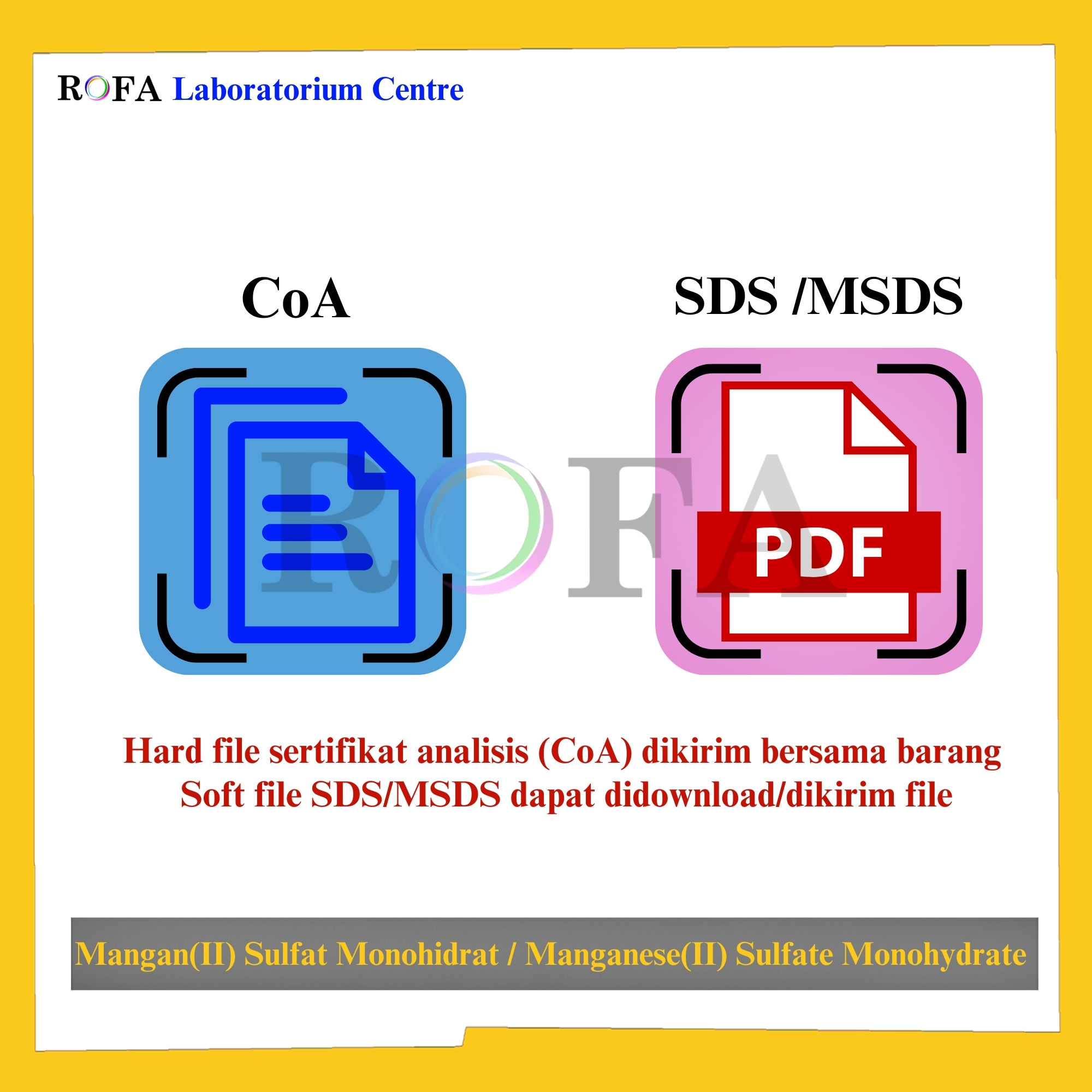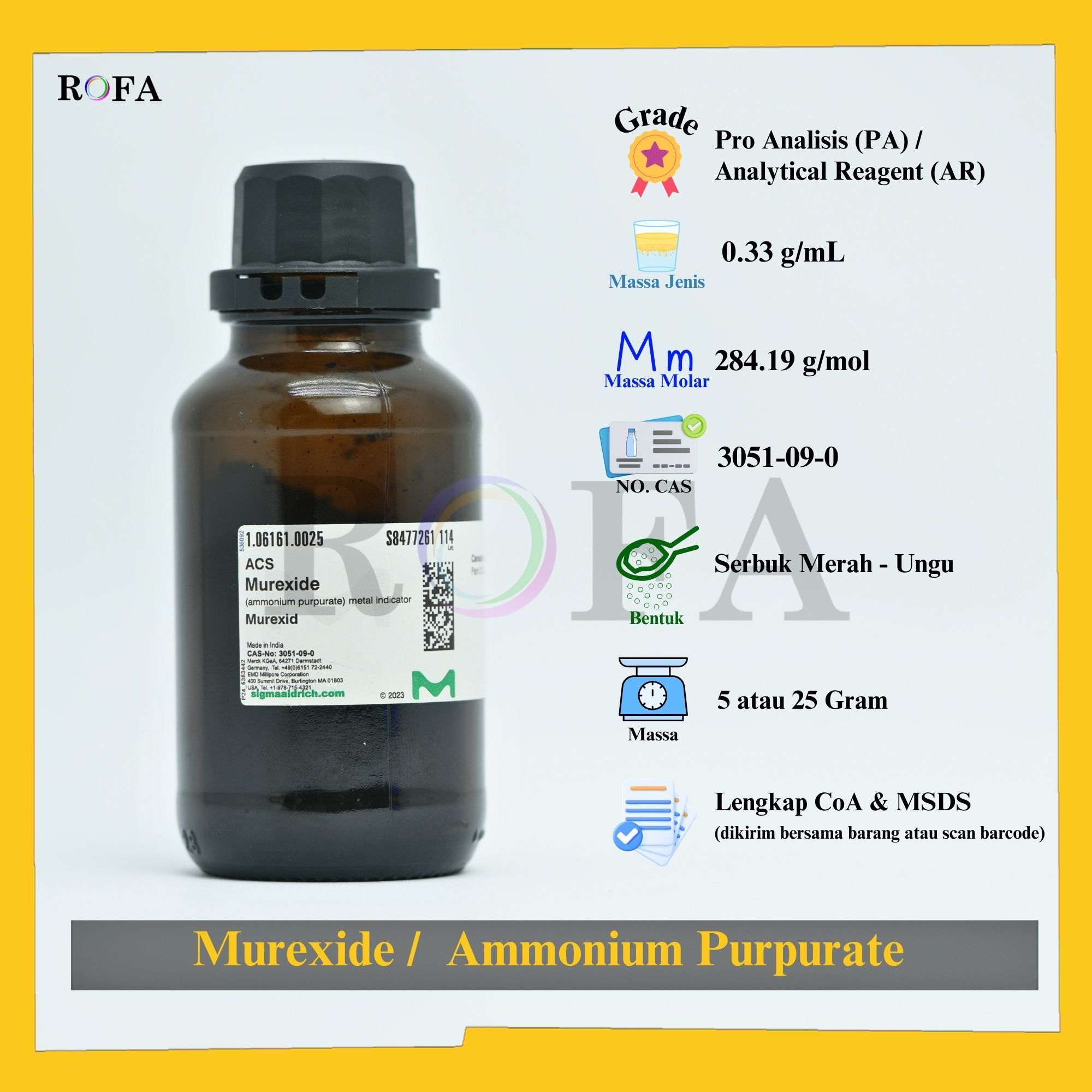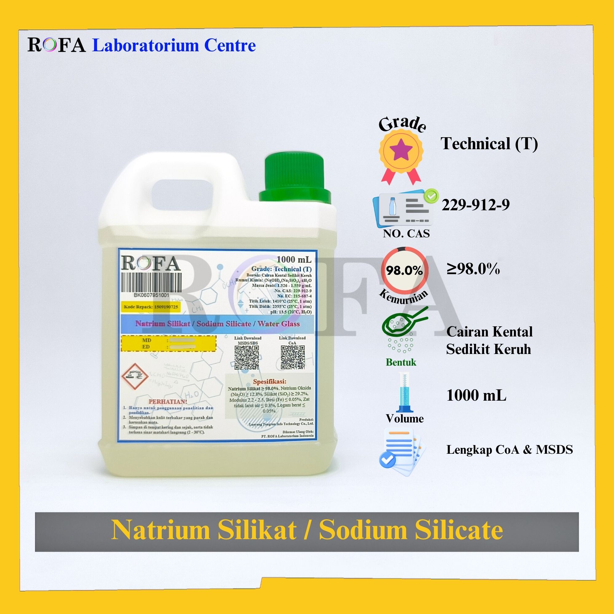 Lengkap dengan dokumen sertifikat analisis (CoA) dan MSDS / SDS (dikirim bersama barang atau bisa scan barcode).