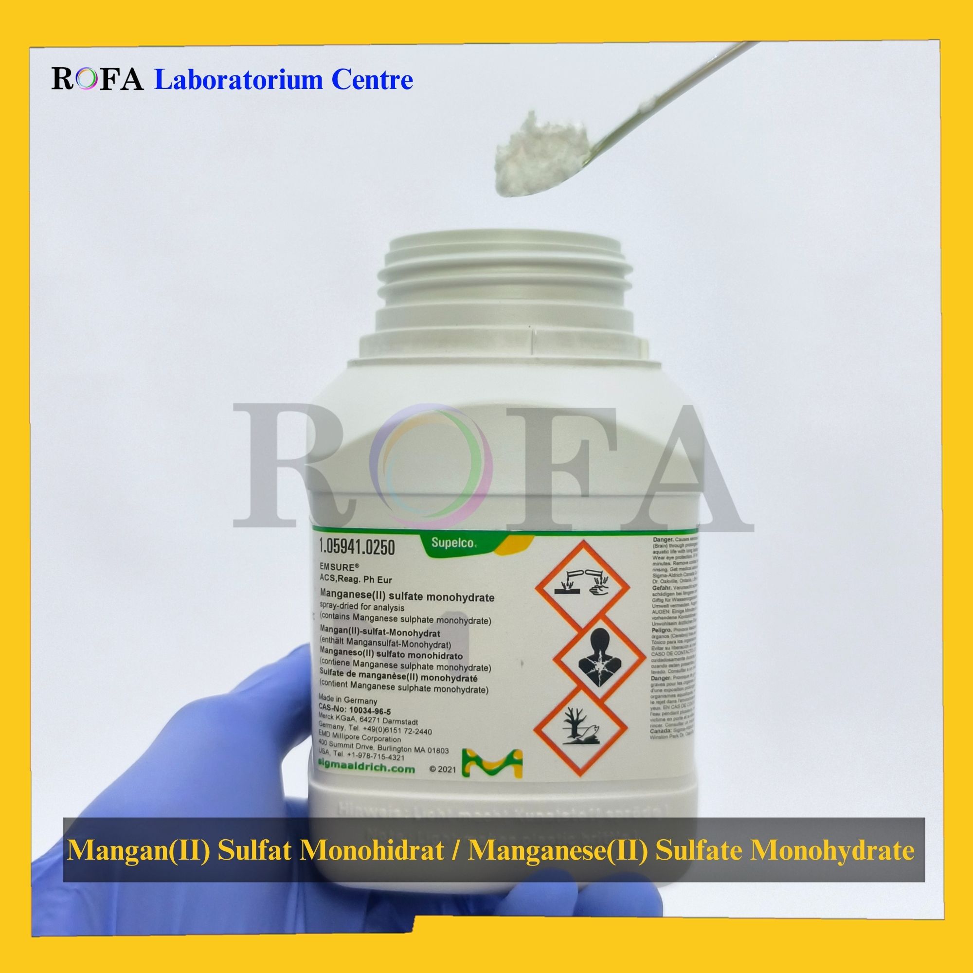 Nama Produk: Merck Mangan(II) Sulfat Monohidrat / Manganese(II) Sulfate Monohydrate / MnSO4.H2O Pro Analisis 250 Gram Merek / Brand: Merck, Jerman Catalogue Number: 1.05941.0250 Status: Original Pack (Kemasan Asli) Lengkap dengan dokumen sertifikat analisis (CoA)...
