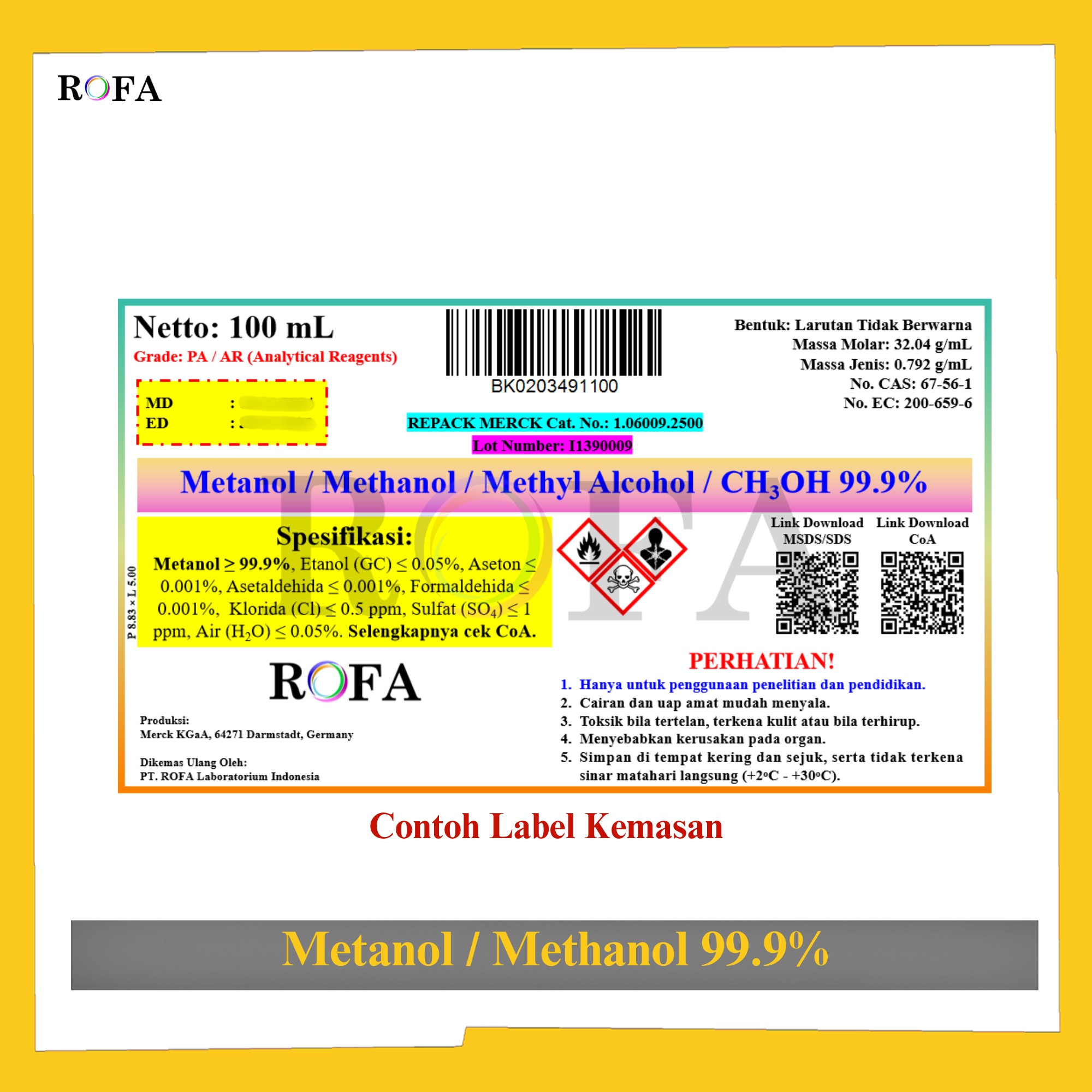 Nama Produk: Merck Metanol / Methanol / Metil Alkohol / CH3OH 99,9% Pro Analisis Eceran 100 – 500 mL Merek / Brand: Merck, Jerman Catalogue Number: 1.06009.2500 Status: Repack (Kemas Ulang / Eceran) Lengkap dengan...