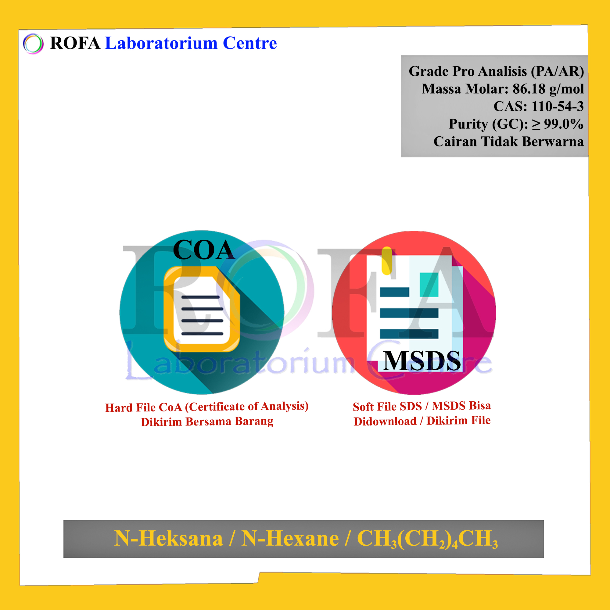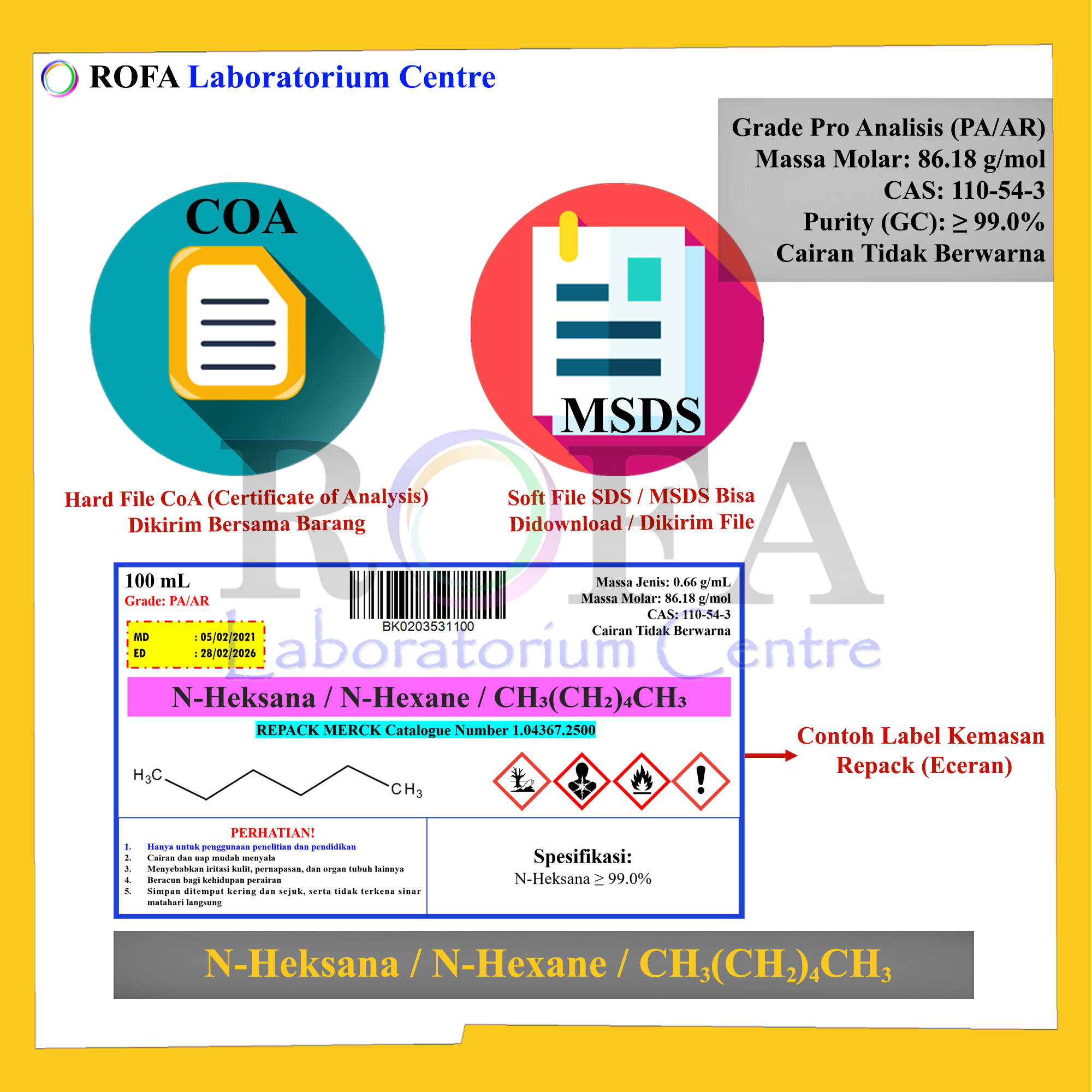 Lengkap dengan dokumen sertifikat analisis (CoA) dan MSDS / SDS (dikirim bersama barang atau bisa scan barcode).