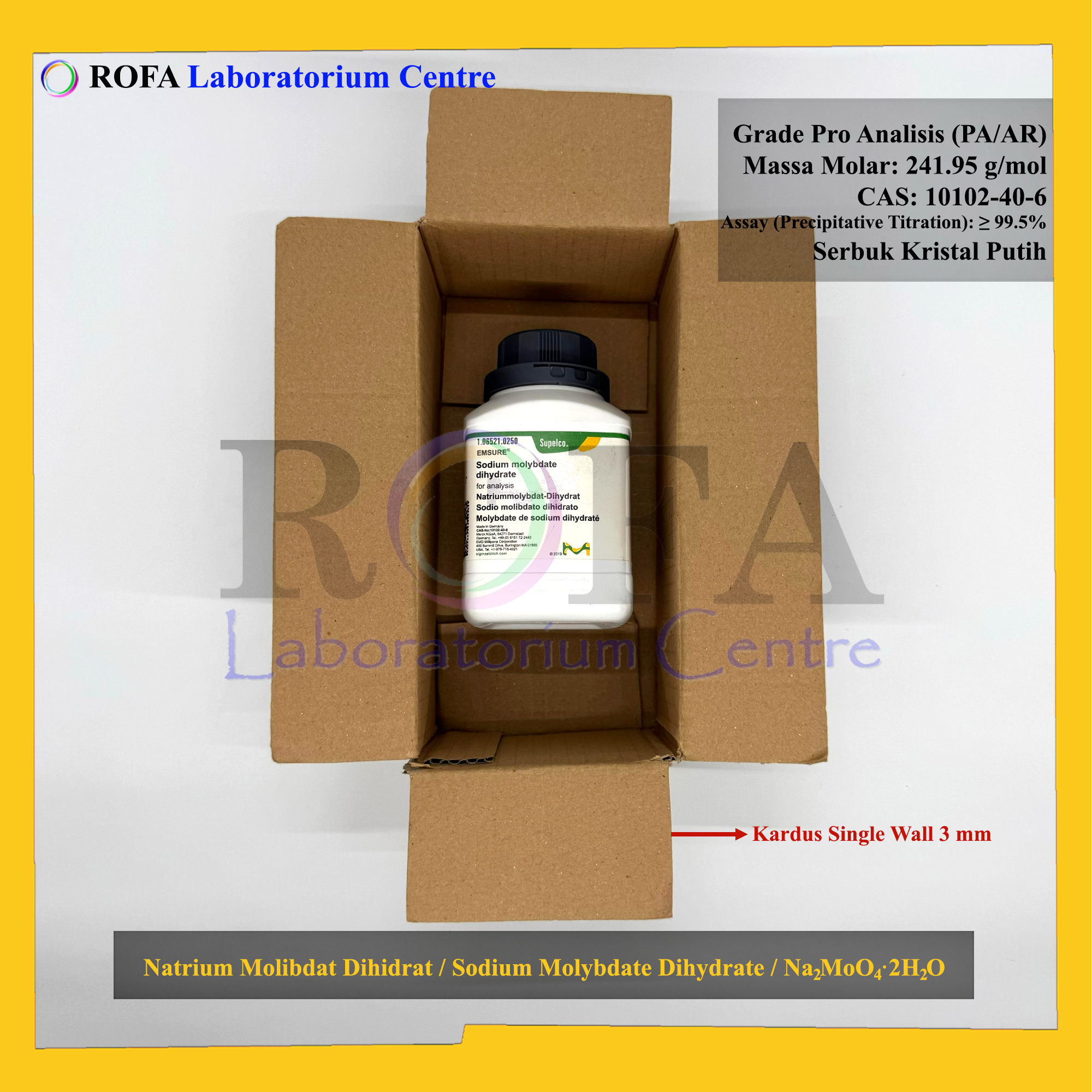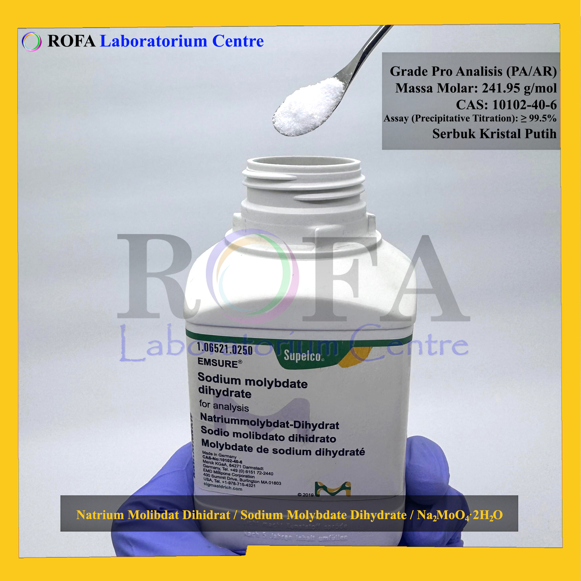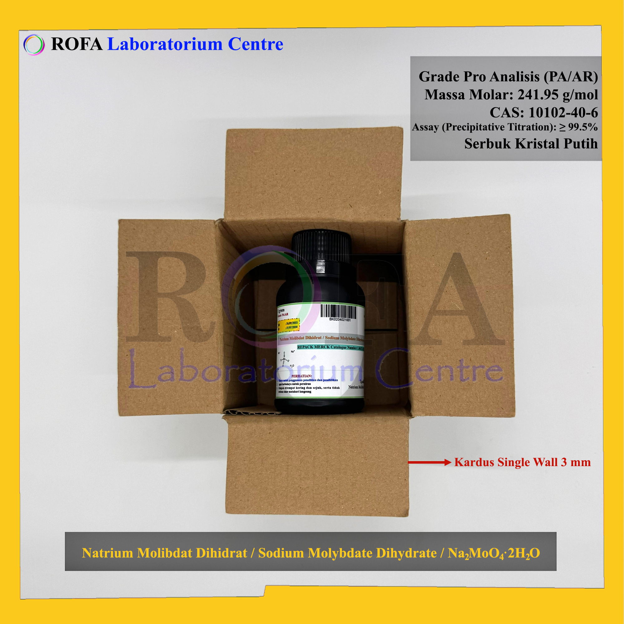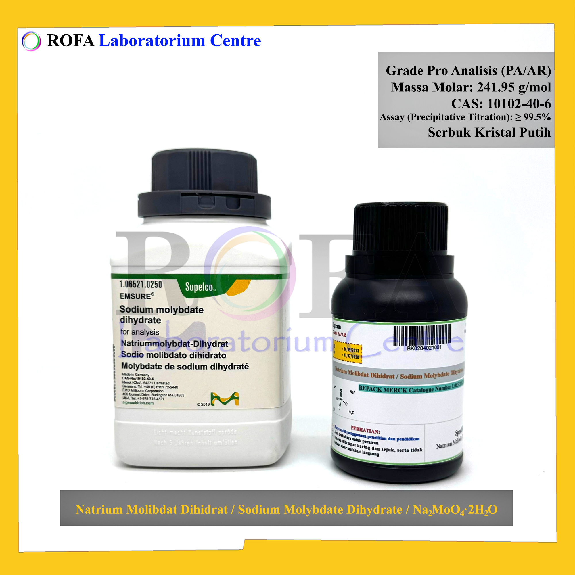 Nama Produk: Merck Natrium Molibdat Dihidrat / Sodium Molybdate Dihydrate / Na2MoO4·2H2O Pro Analisis Eceran 1 Gram
