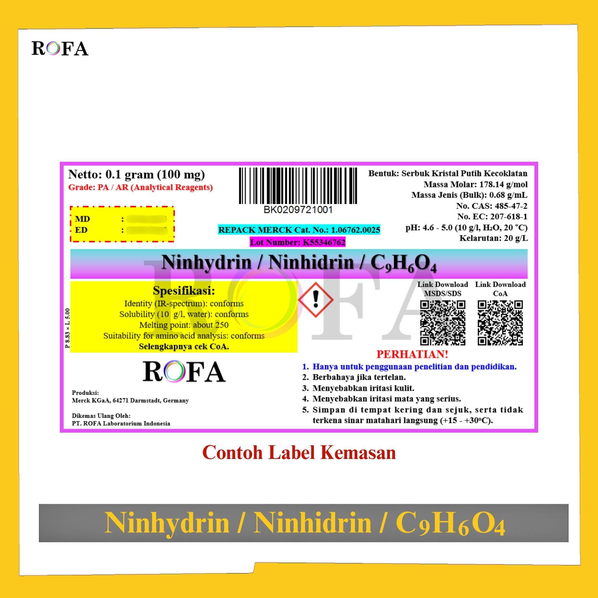 Nama Produk: MERCK Ninhydrin / Ninhidrin / C9H6O4 Pro Analisis 0.1 – 100 Gram Merek / Brand: Merck, Jerman Catalogue Number: 1.06762.0010 atau 1.06762.0100 Status: Repack (Kemas Ulang / Eceran) atau Original Pack (Kemasan Asli)...