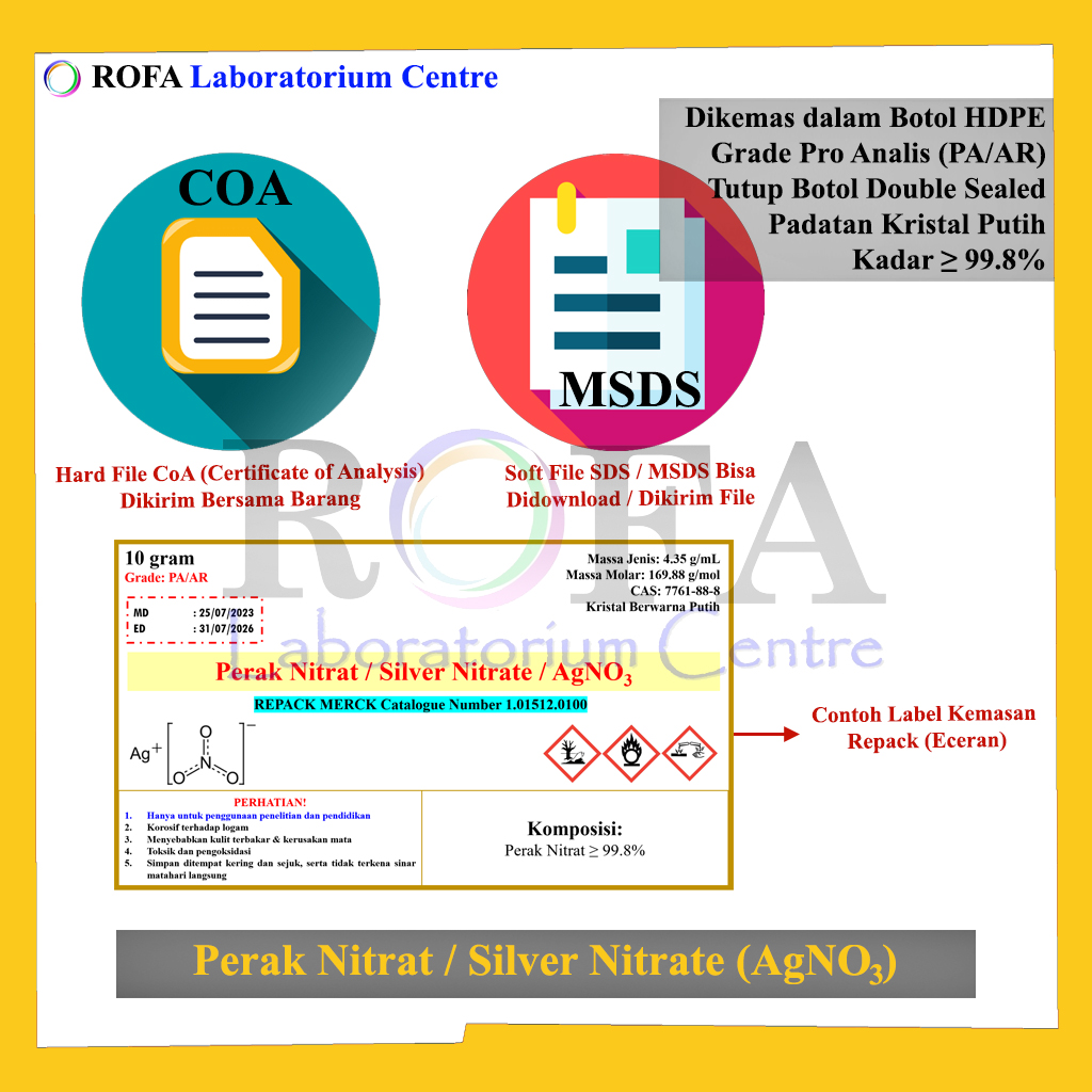 Lengkap dengan dokumen sertifikat analisis (CoA) dan MSDS / SDS (dikirim bersama barang atau bisa scan barcode).
