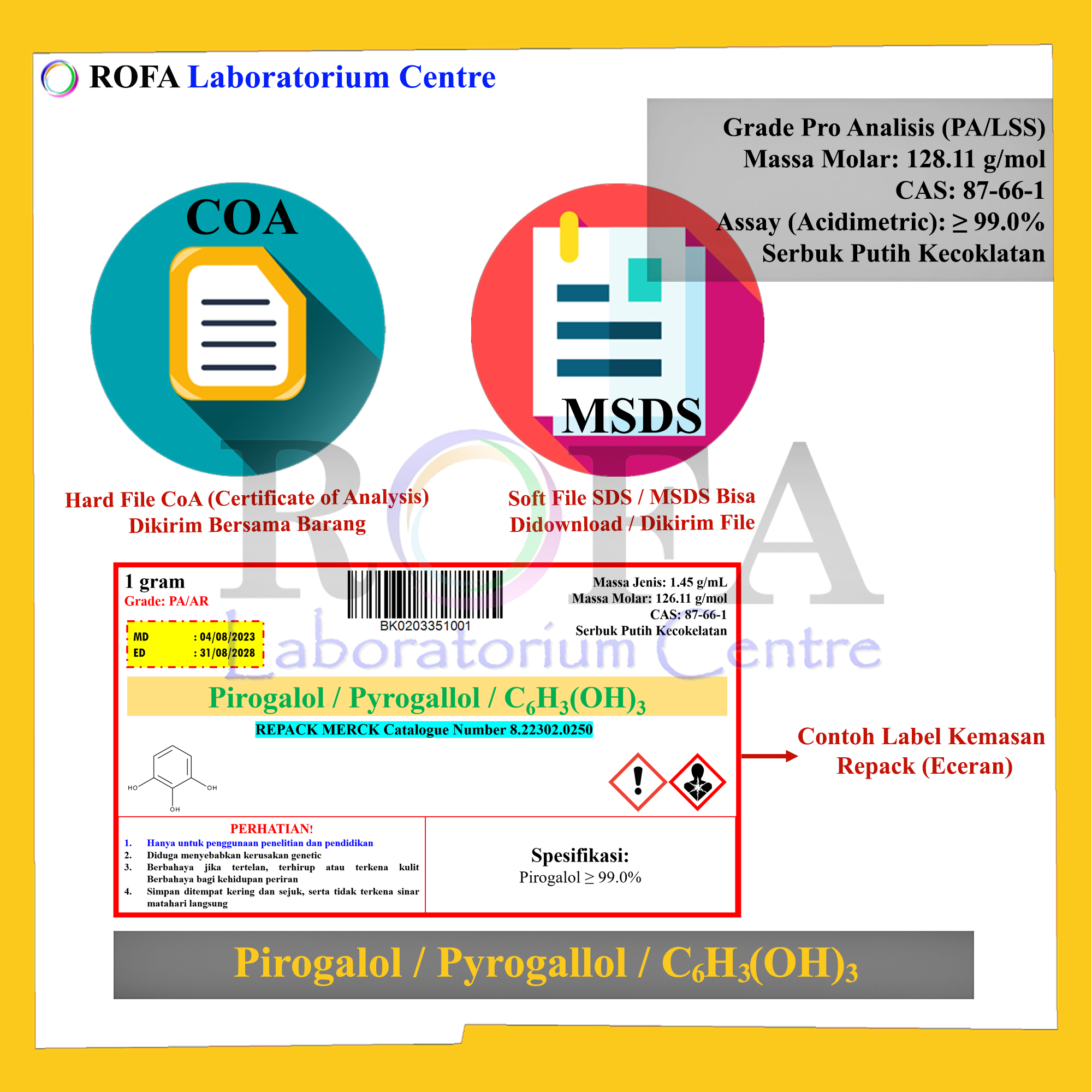 Lengkap dengan dokumen sertifikat analisis (CoA) dan MSDS / SDS (dikirim bersama barang atau bisa scan barcode).