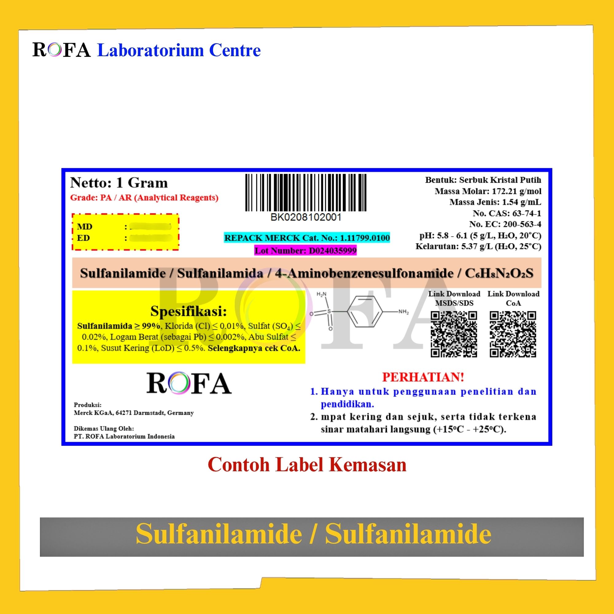 Nama Produk: Merck Sulfanilamide / Sulfanilamida / 4-Aminobenzenesulfonamide Pro Analisis 0.1 – 100 Gram Merek / Brand: Merck, Jerman Catalogue Number: 1.11799.0100 Status: Repack (Eceran / Kemas Ulang) atau Original Pack (Kemasan Asli) Lengkap dengan...