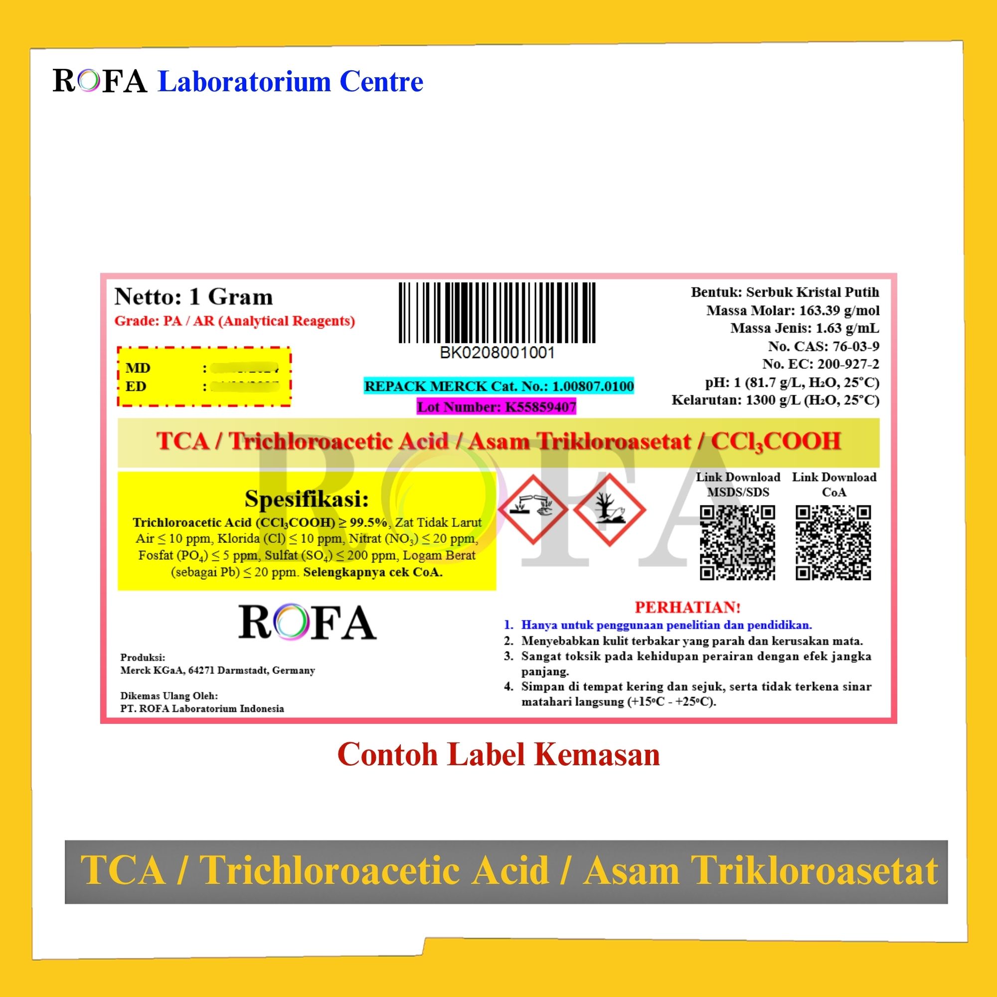 Lengkap dengan dokumen sertifikat analisis (CoA) dan MSDS / SDS (dikirim bersama barang).
