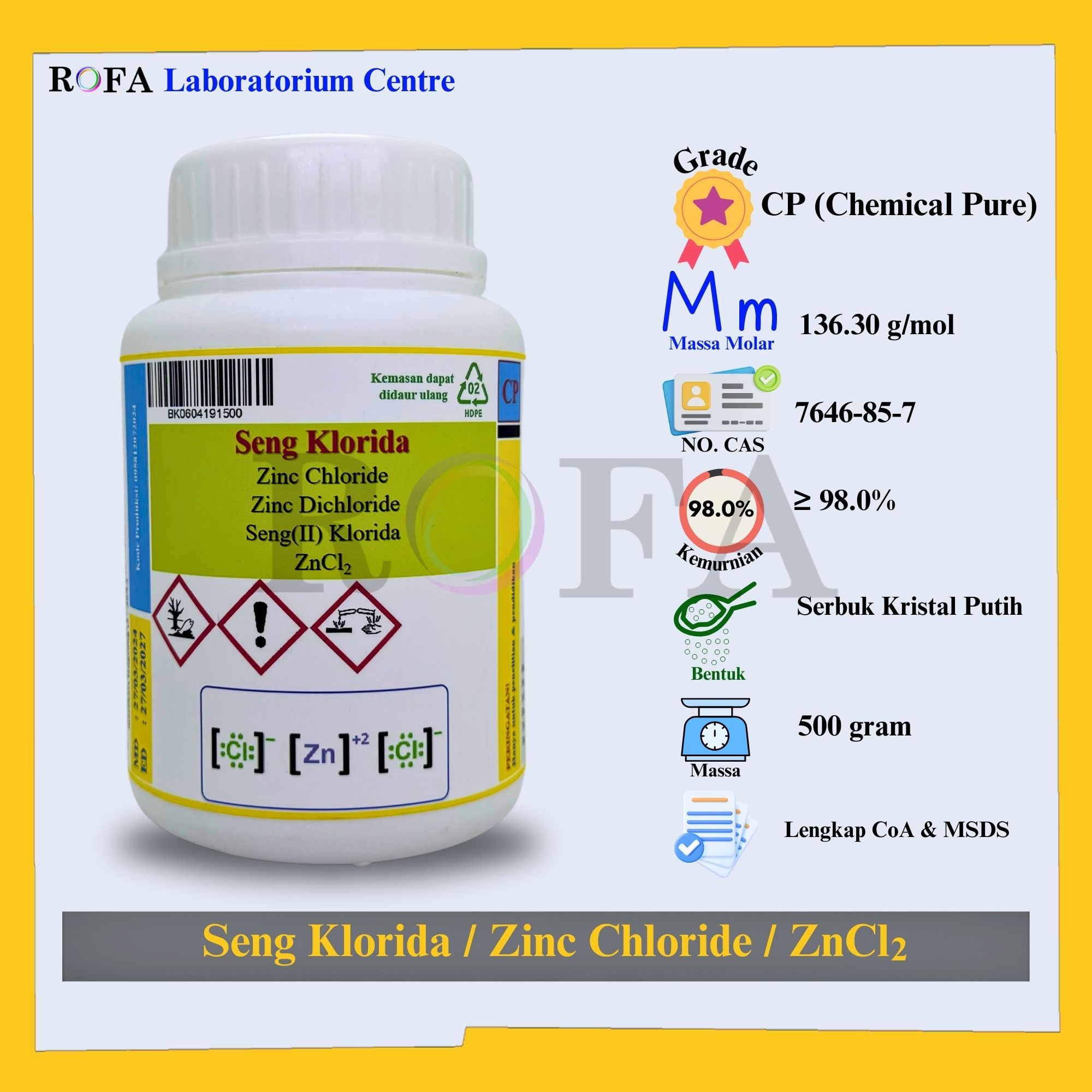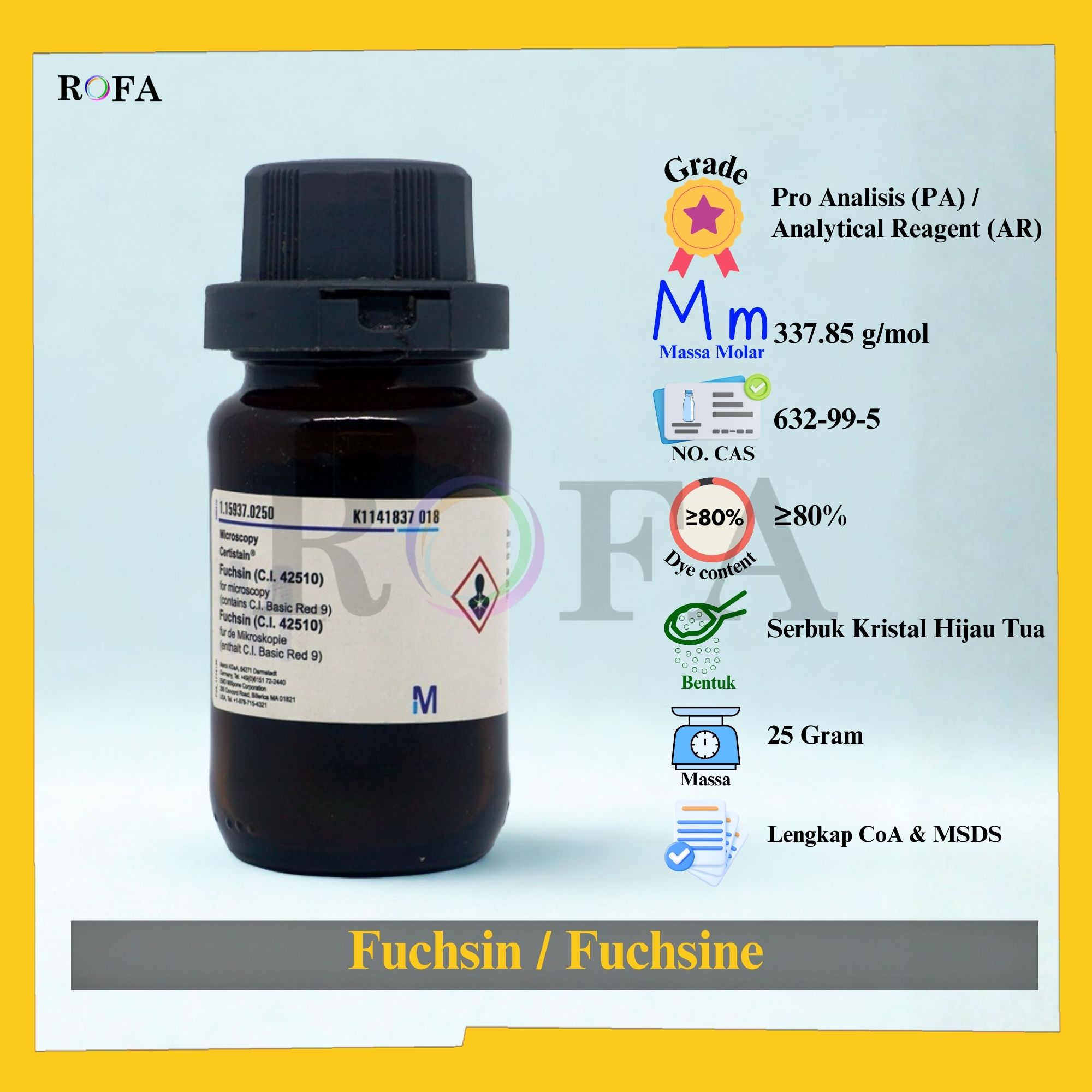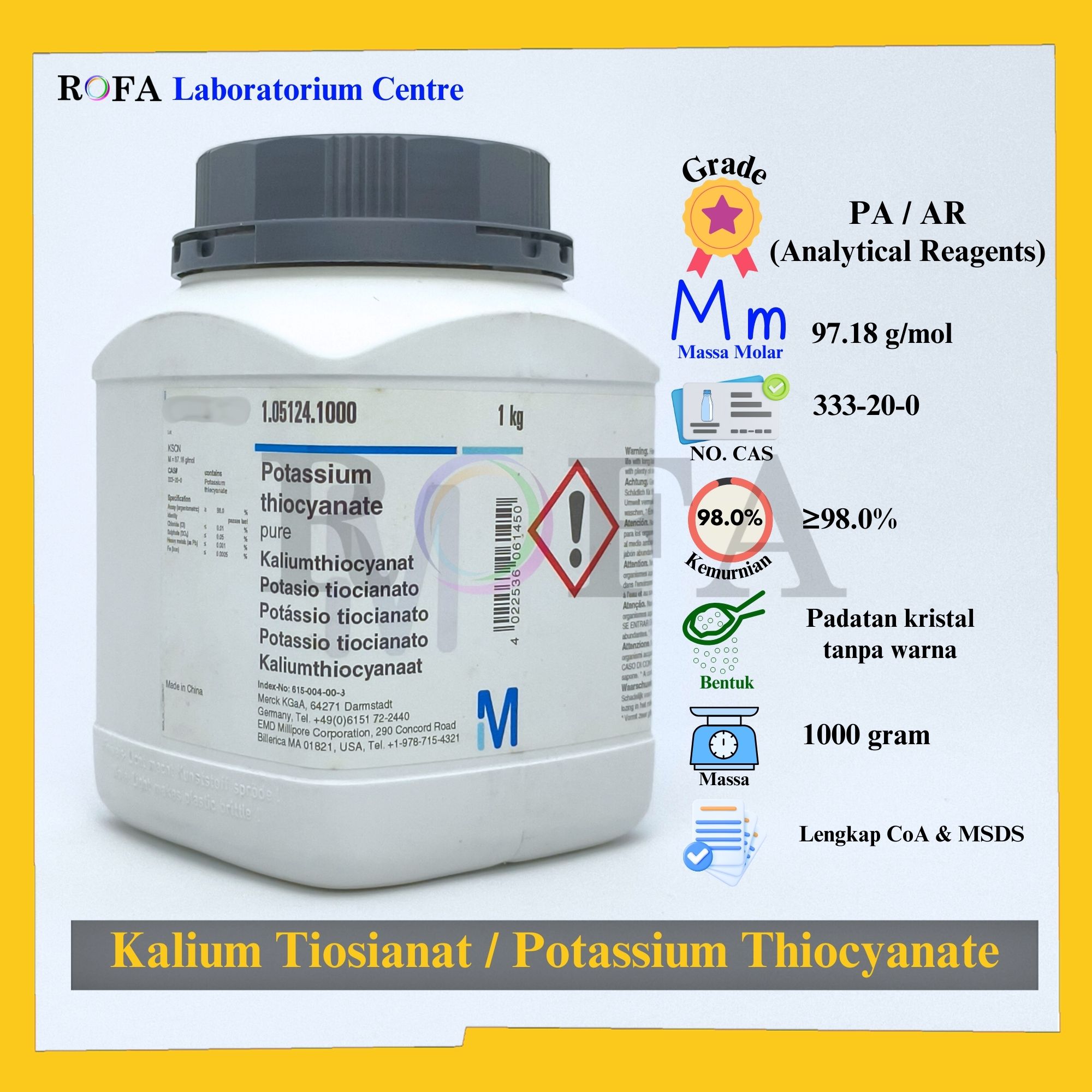 Lengkap dengan dokumen sertifikat analisis (CoA) dan MSDS / SDS (dikirim bersama barang atau bisa scan barcode).