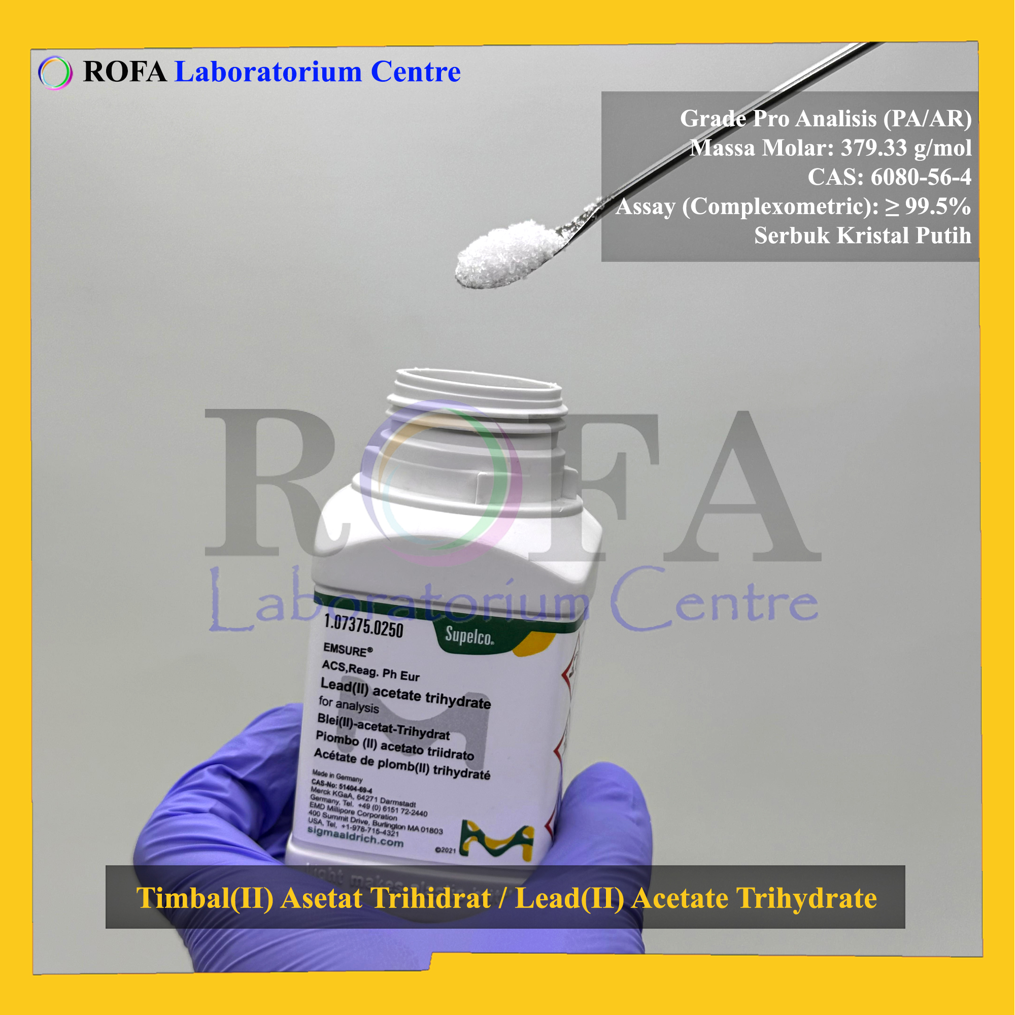 Nama Produk: Merck Timbal(II) Asetat Trihidrat / Lead(II) Acetate Trihydrate / Pb(CH3COO)2.3H2O Pro Analisis Eceran 1 Gram