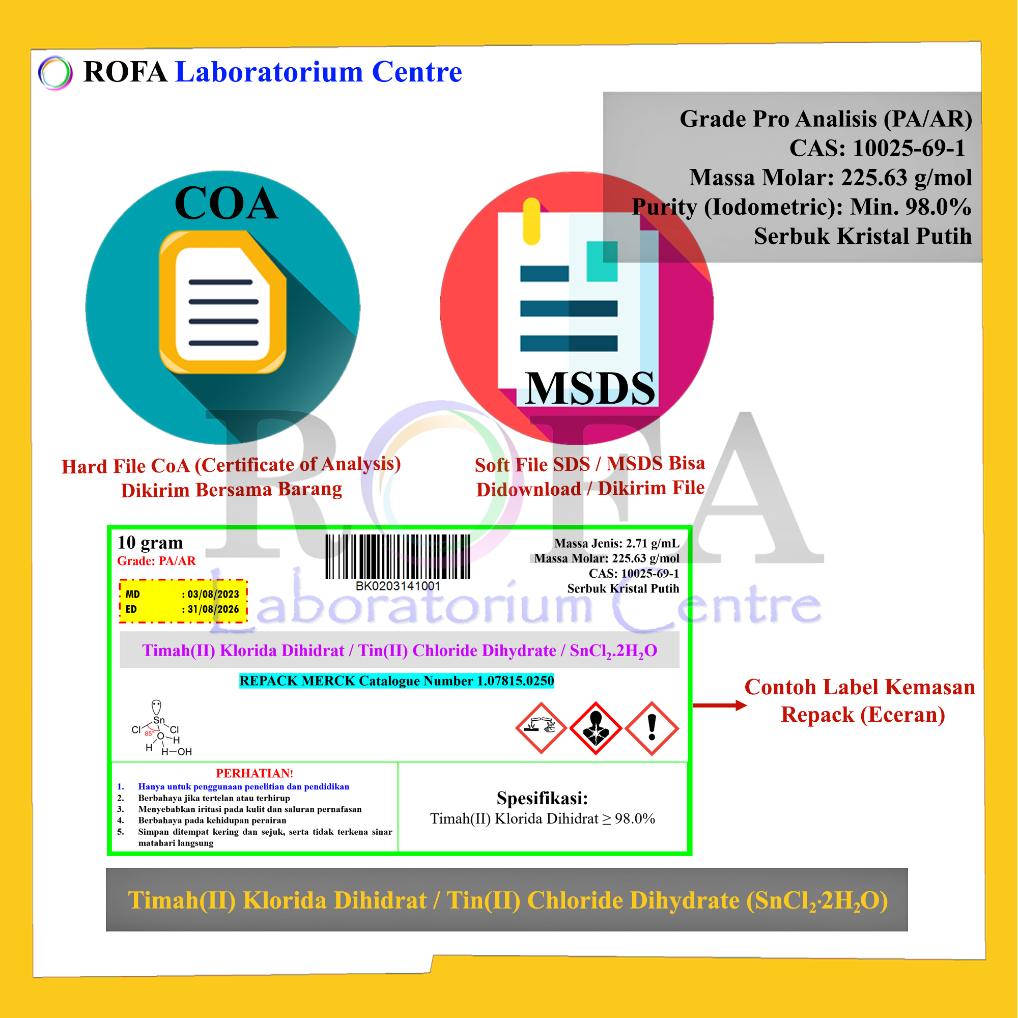 Nama Produk: Merck Tin(II) Chloride Dihydrate / Timah(II) Klorida Dihidrat / Stannous Chloride Dihydrate / SnCl2.2H2O Pro Analisis Eceran 1 Gram