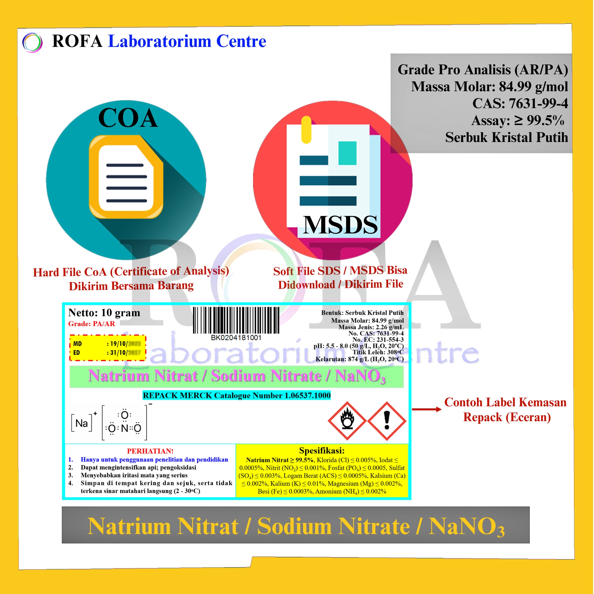 Lengkap dengan dokumen sertifikat analisis (CoA) dan MSDS / SDS (dikirim bersama barang atau bisa scan barcode).