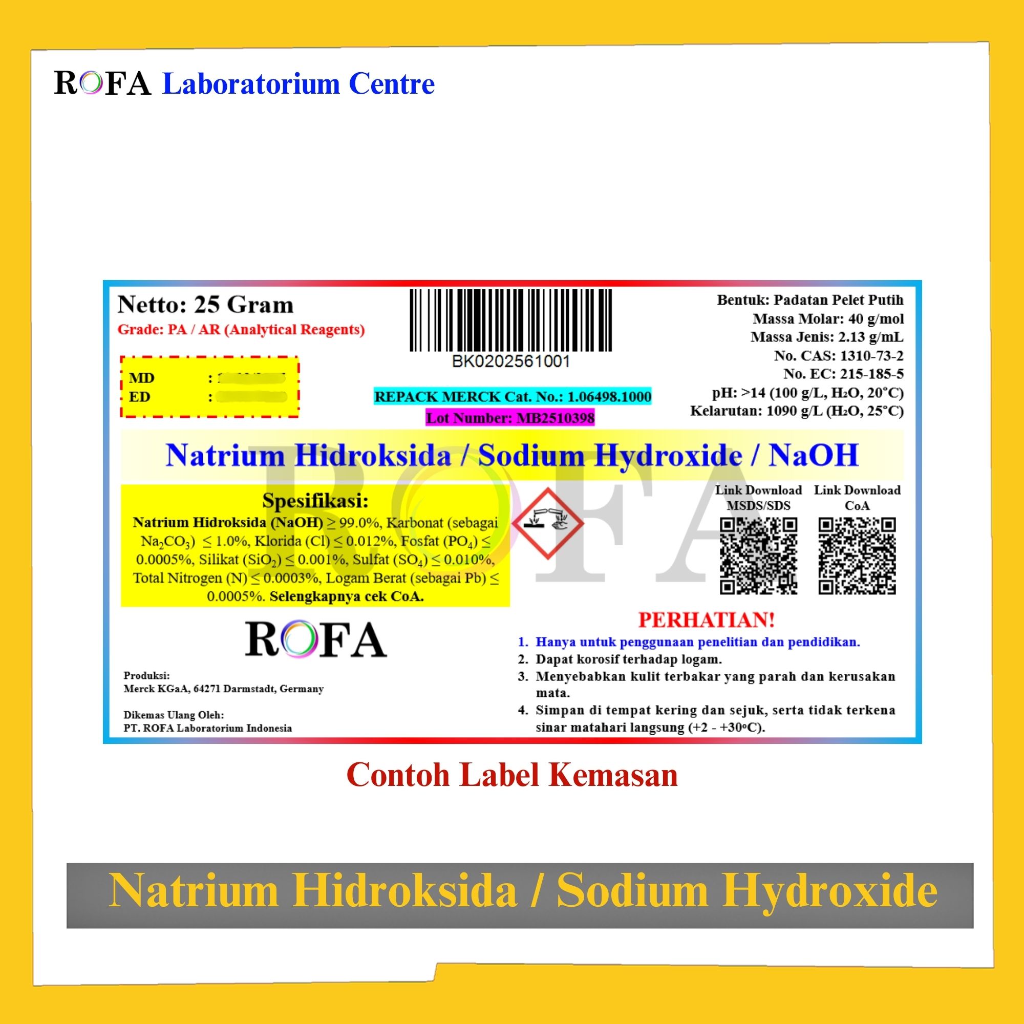 Lengkap dengan dokumen sertifikat analisis (CoA) dan MSDS / SDS (dikirim bersama barang atau bisa scan barcode).