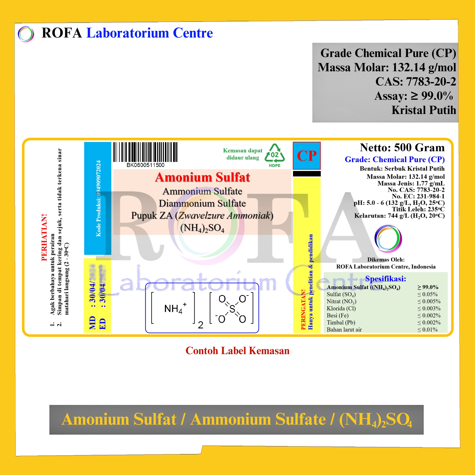 - Bentuk: Serbuk kristal putih