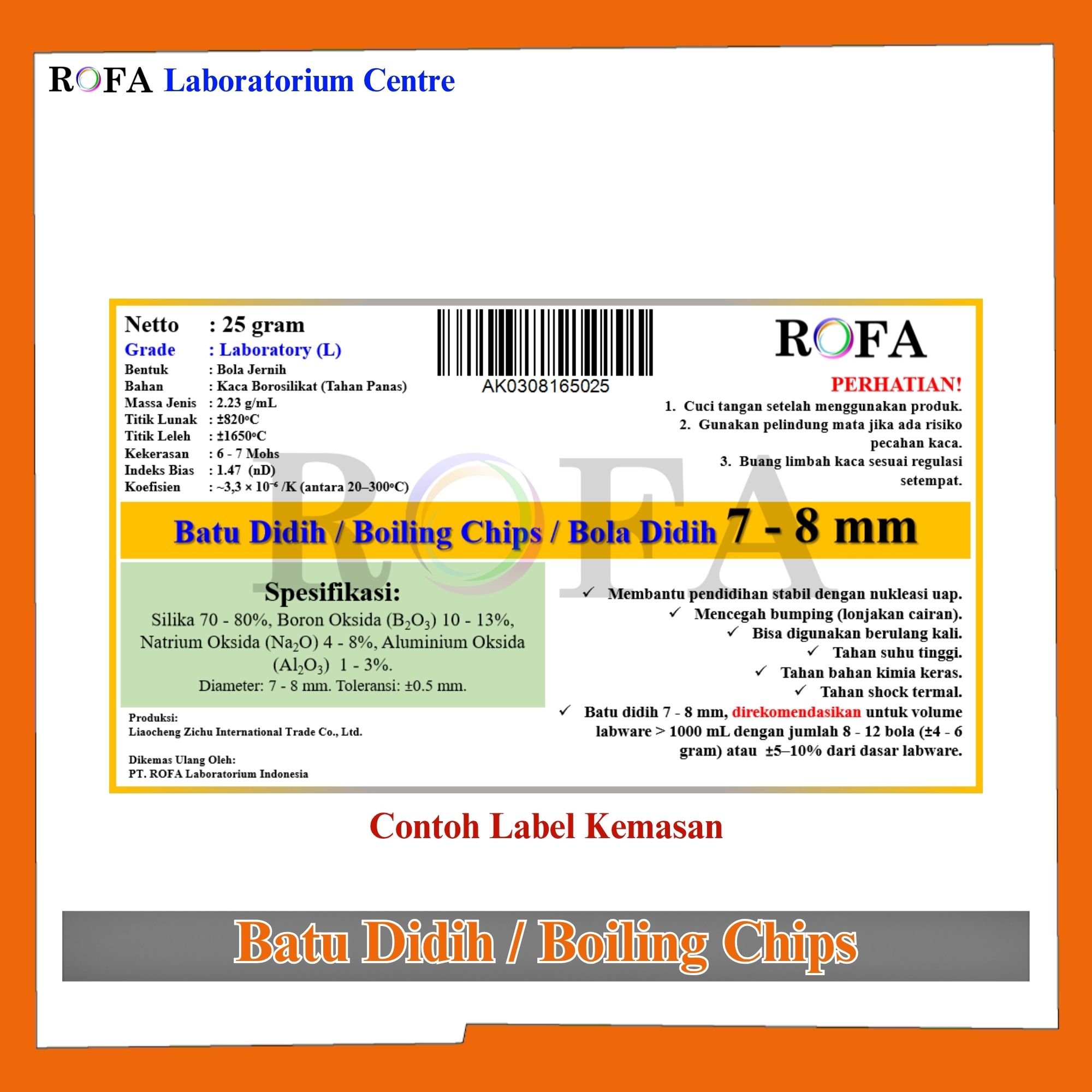 Nama Produk: Batu Didih / Bola Didih / Boiling Chips / Glass Beads / Boiling Balls 25 Gram 3 – 8 mm Merek / Brand: ROFA SPESIFIKASI: Netto: 25 gram Grade: Laboratory (L) Bentuk: Bola...