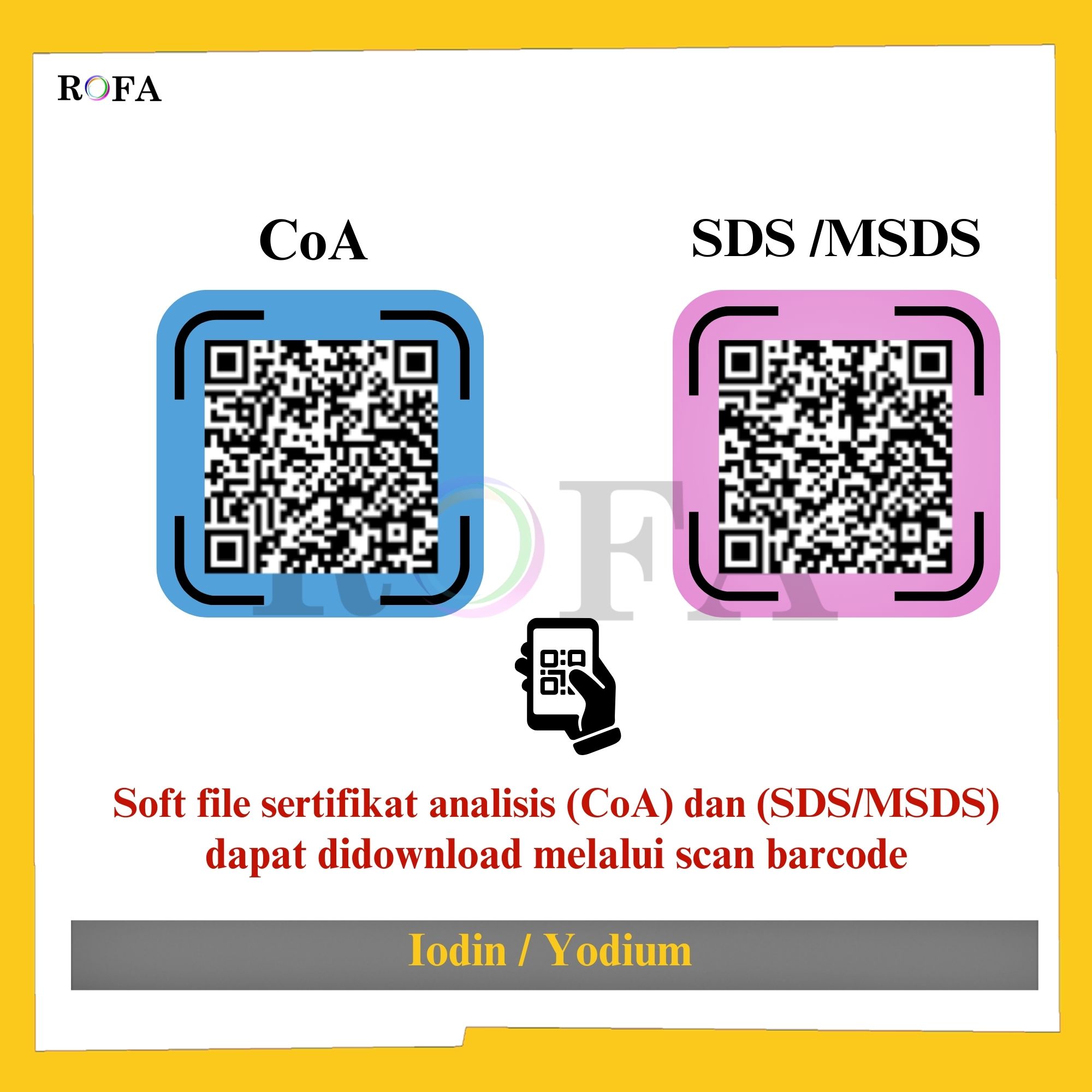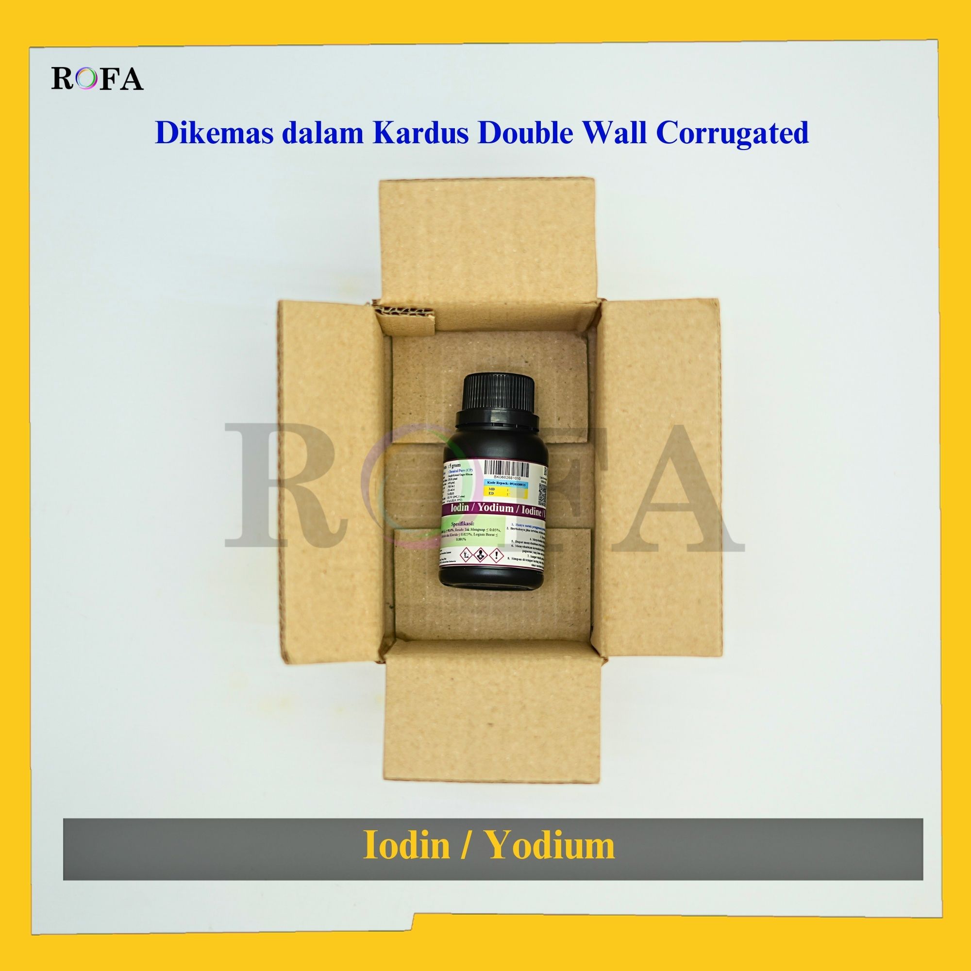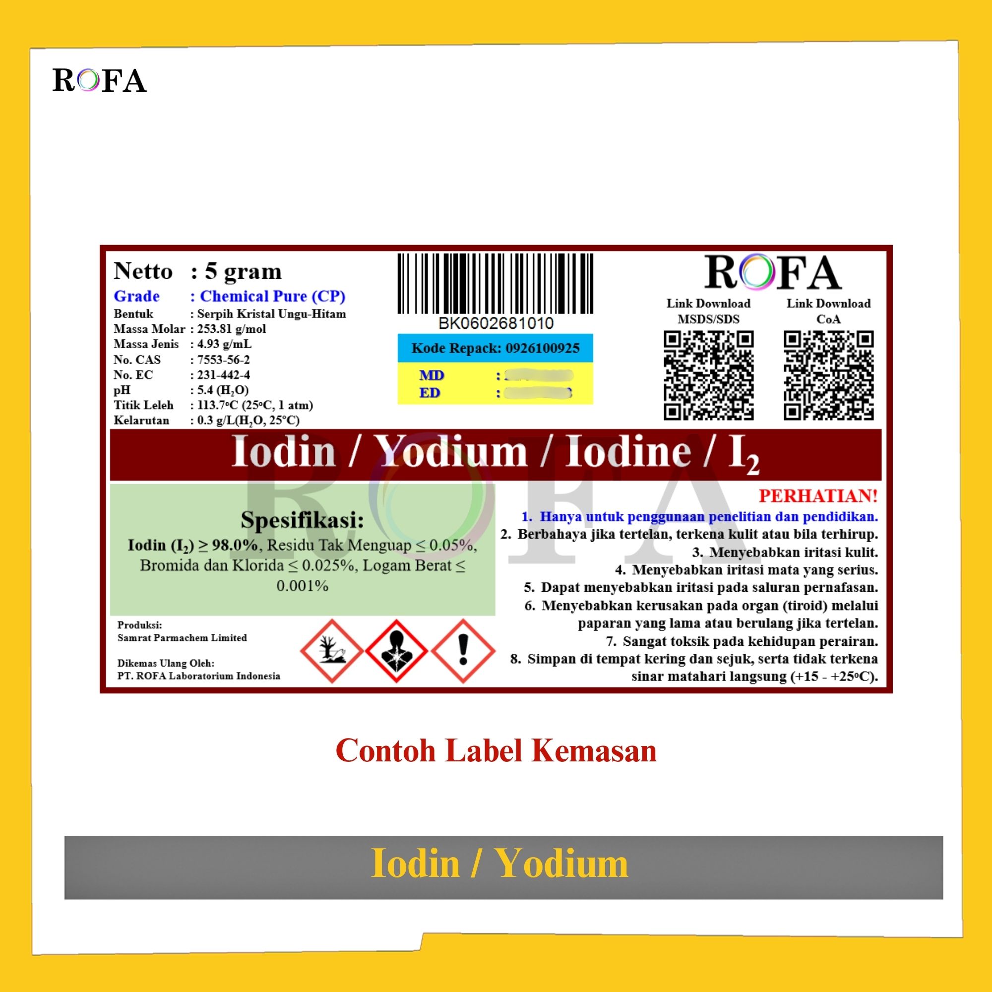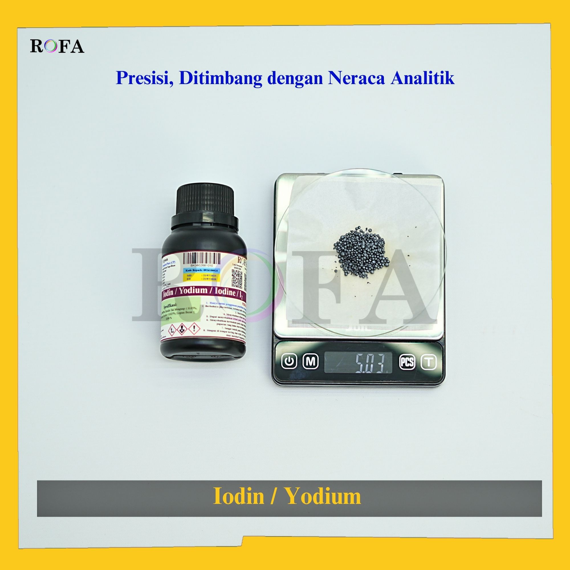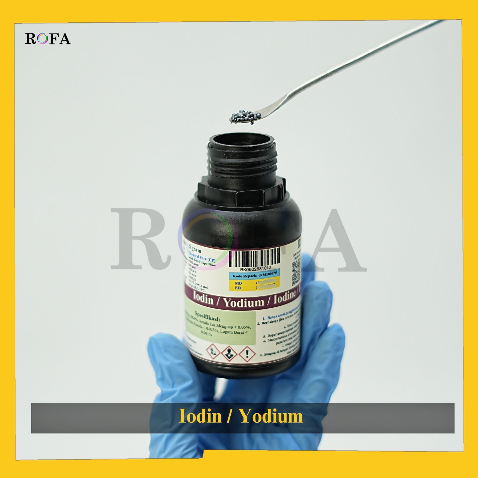 Nama Produk: ROFA Iodin / Iodine / Yodium / Iodium CP Eceran 1 Gram Brand / Merek: ROFA, Bandung Lengkap dengan dokumen sertifikat analisis (CoA) dan MSDS / SDS (dikirim bersama barang atau bisa scan...