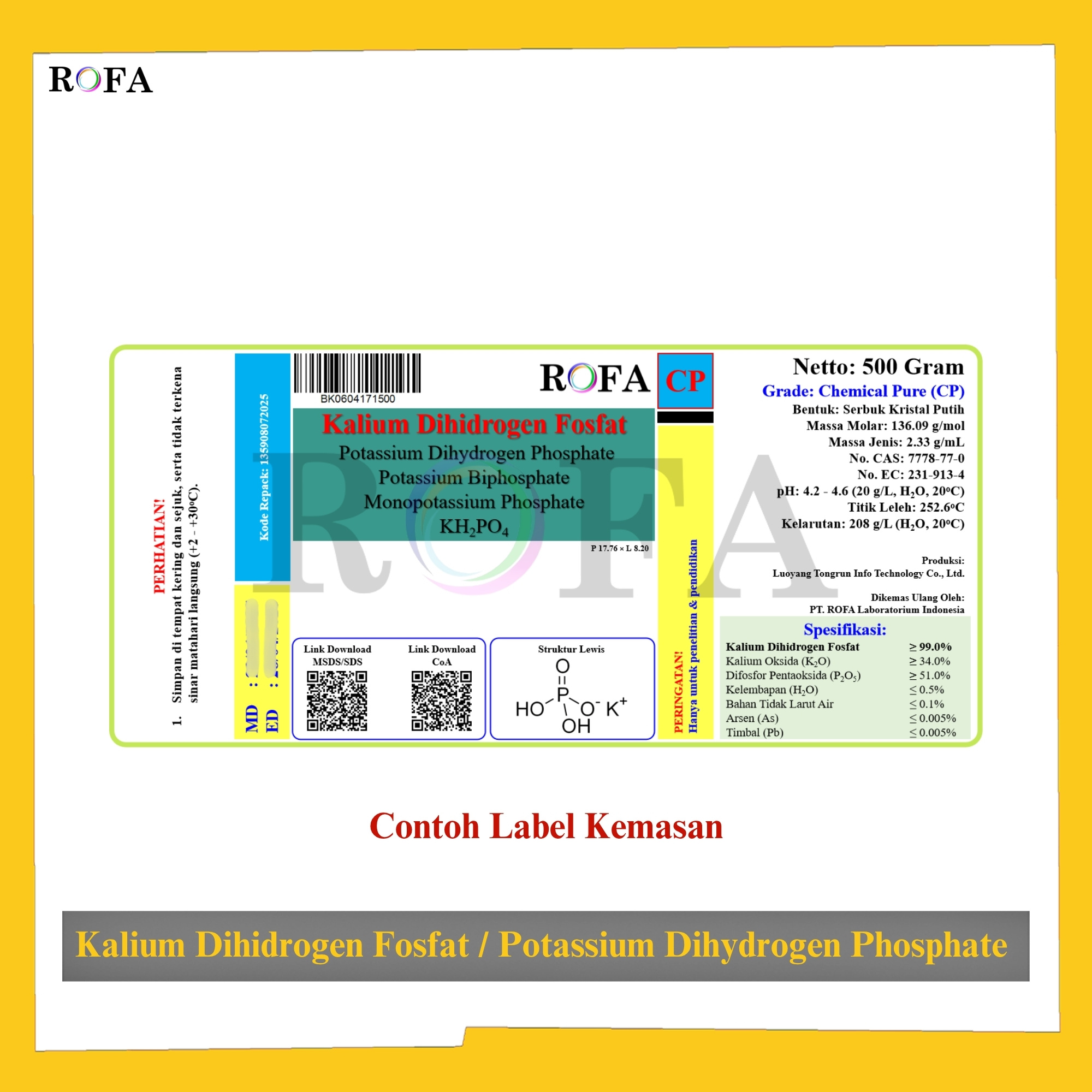 Nama Produk: ROFA Kalium Dihidrogen Fosfat / Potassium Dihydrogen Phosphate / KH2PO4 CP 500 Gram Brand / Merek: ROFA, Bandung Lengkap dengan dokumen sertifikat analisis (CoA) dan MSDS / SDS (dikirim bersama barang atau bisa...