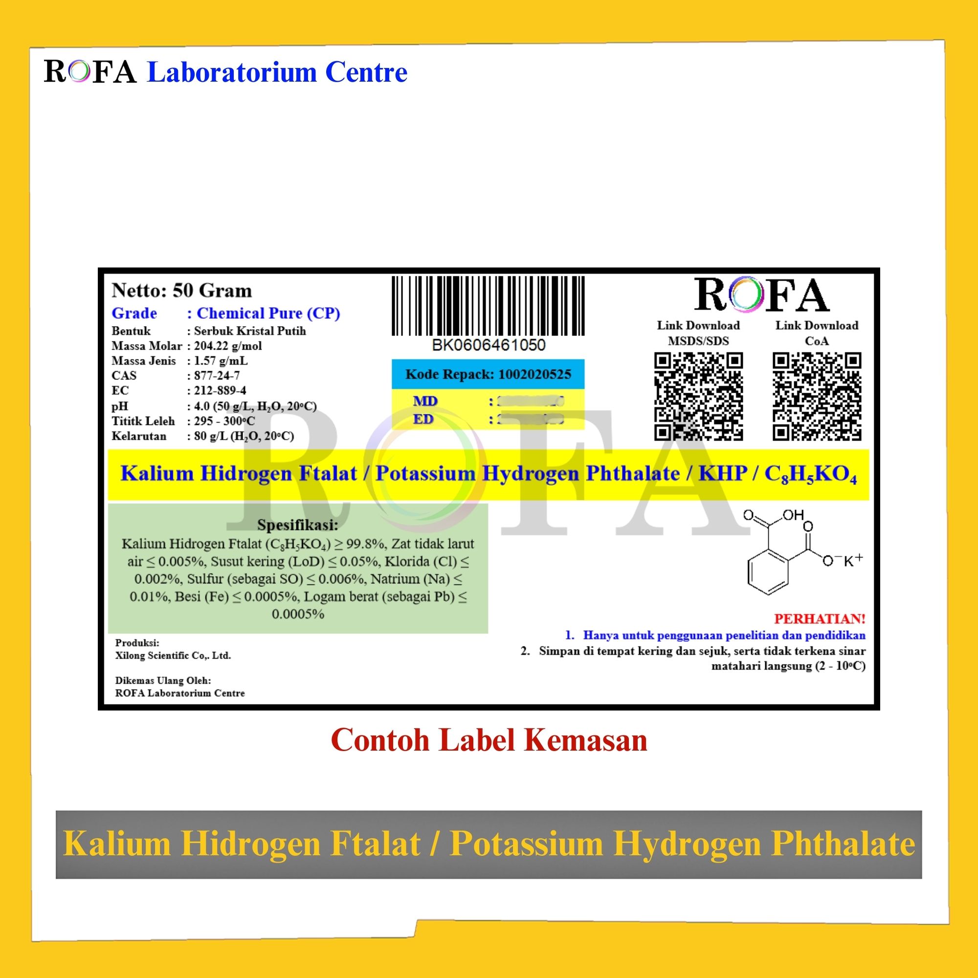 Nama Produk: ROFA Kalium Hidrogen Ftalat / Potassium Hydrogen Phthalate / KHP / C8H5KO4 CP 50 Gram