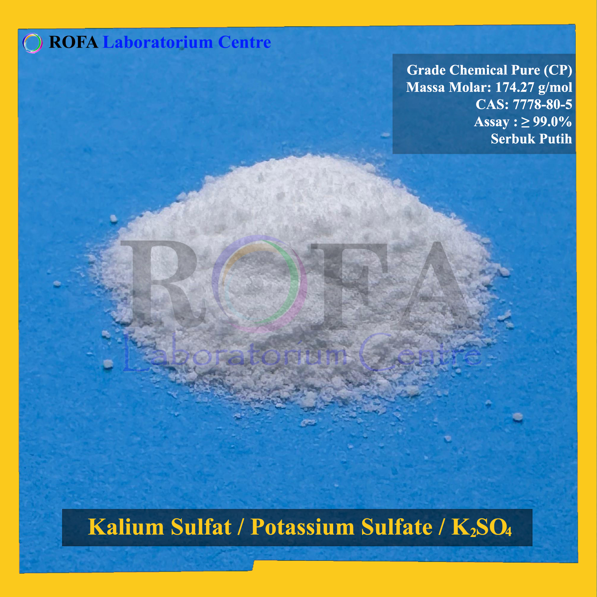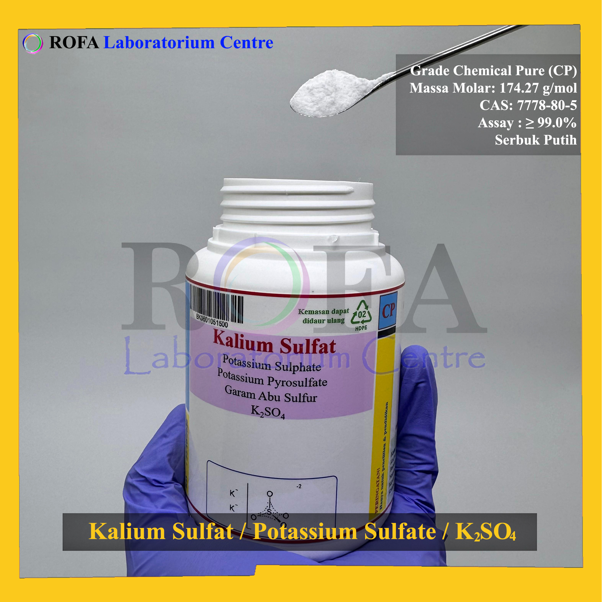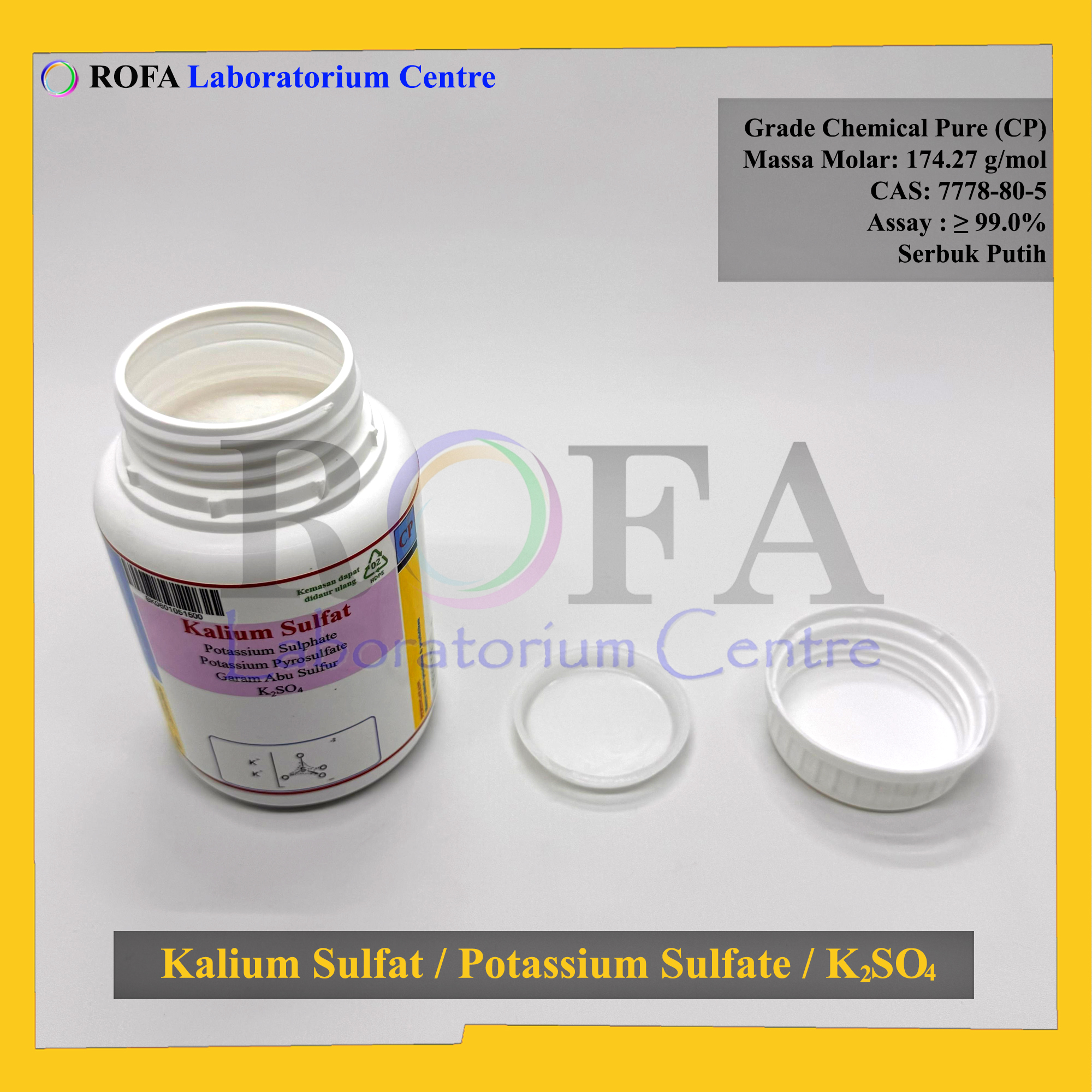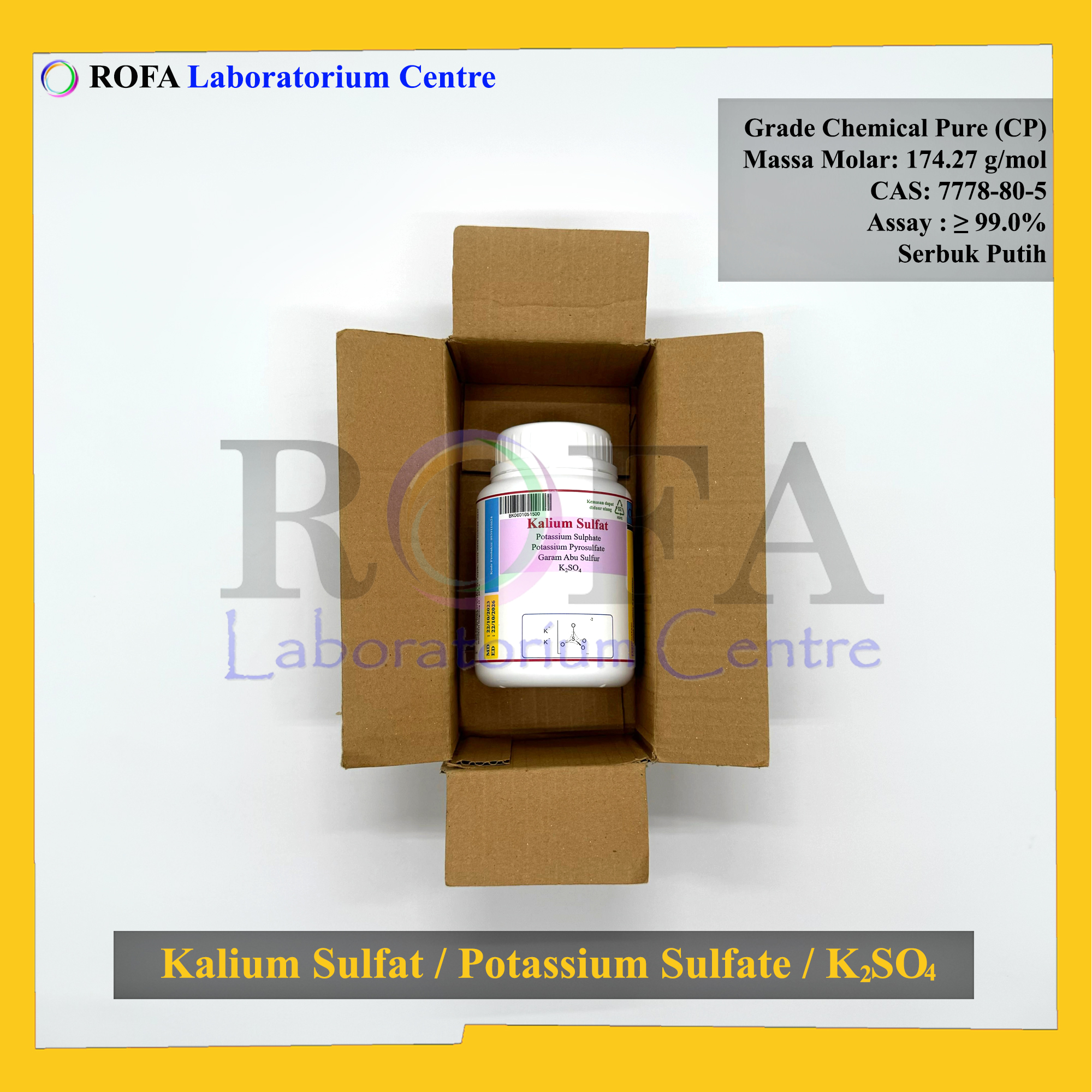 Nama Produk: Kalium Sulfat / Potassium Sulfate / K2SO4 CP 500 Gram Brand / Merek: ROFA, Bandung NON CoA NON MSDS SPESIFIKASI: Rumus: K2SO4 Netto: 500 gram/botol Grade: CP (Chemical Pure) Bentuk: Serbuk Putih Massa...
