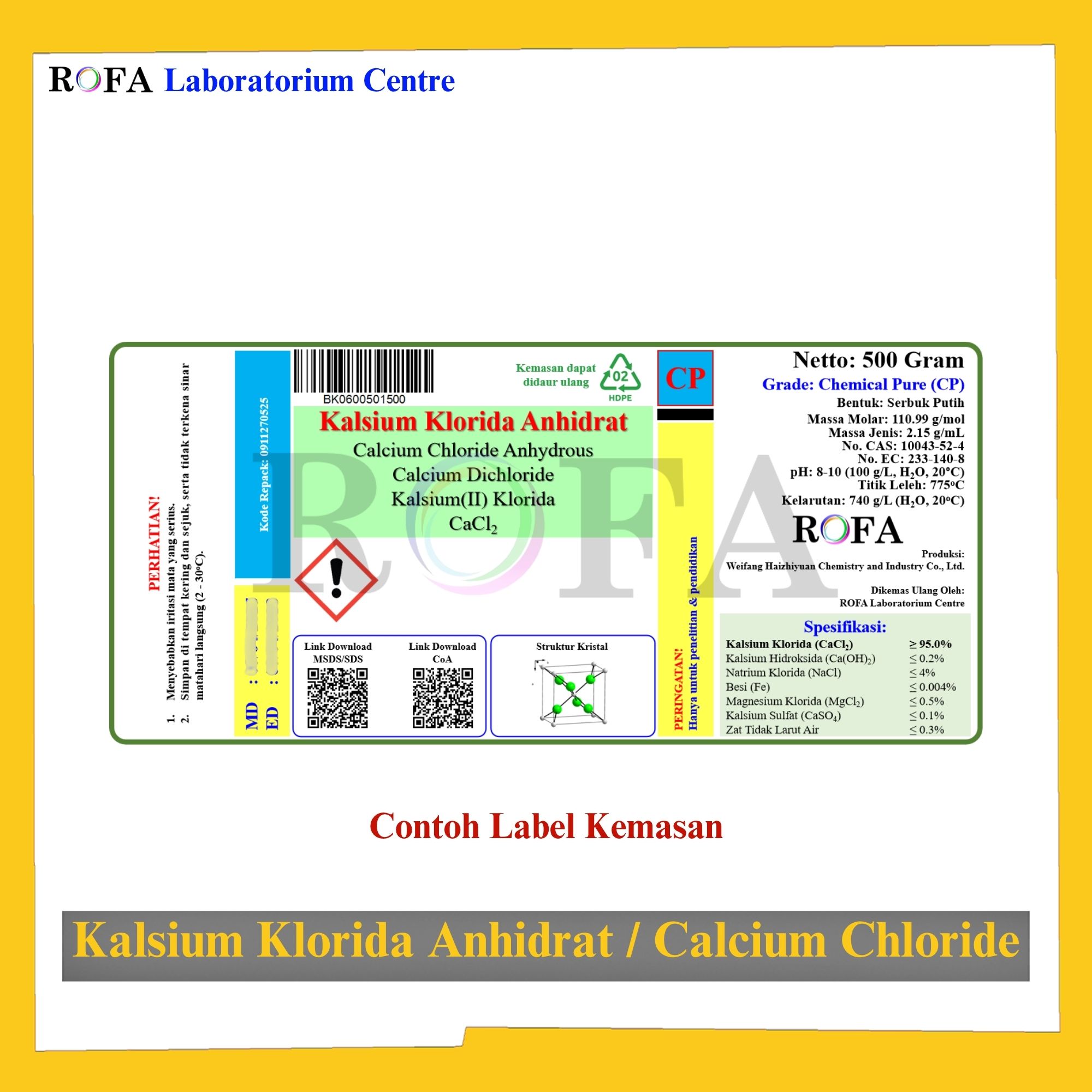 Nama Produk: ROFA Kalsium Klorida Anhidrat / Calcium Chloride Anhydrous / CaCl2 CP 500 Gram