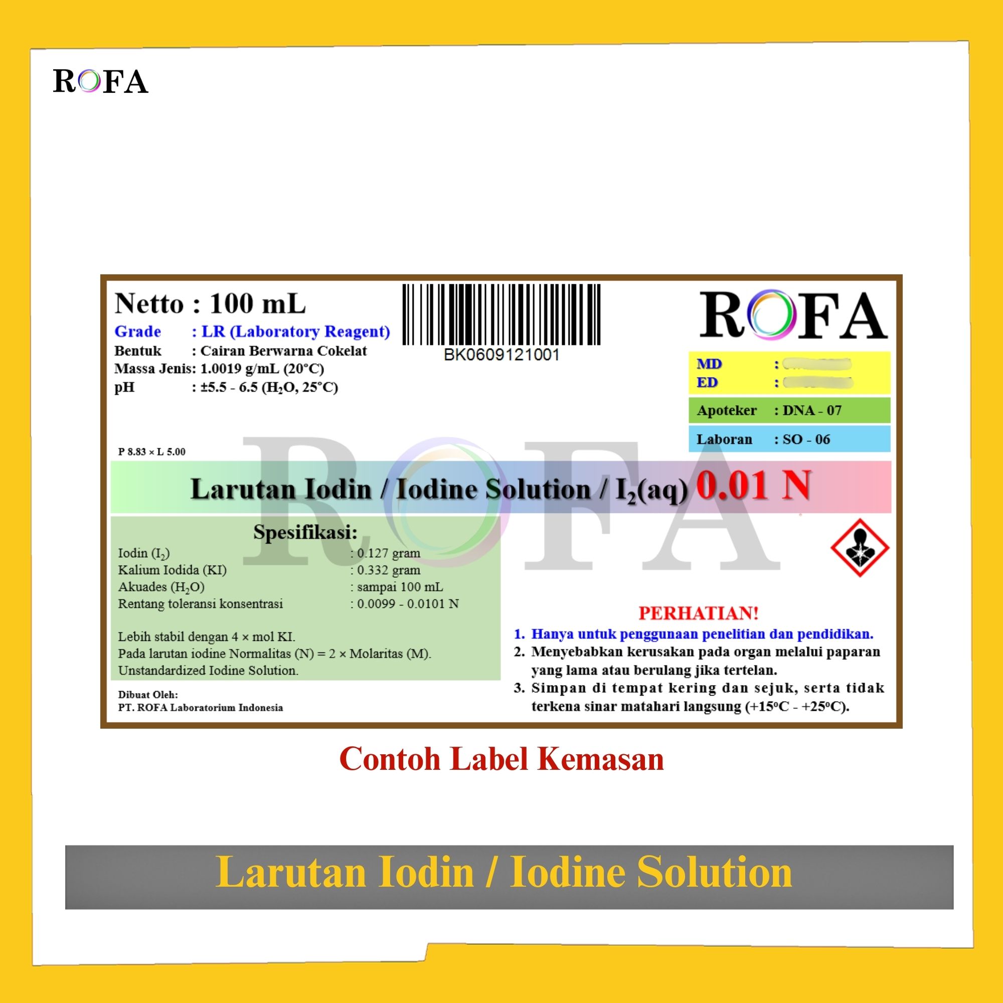 Nama Produk: ROFA Larutan Iodin / Iodine Solution / I2 0.01 N – 1.0 N 25 – 100 mL Merek / Brand: ROFA, Bandung NON CoA dan NON MSDS BELUM DISTANDARISASI FORMULA KHUSUS LEBIH STABIL,...