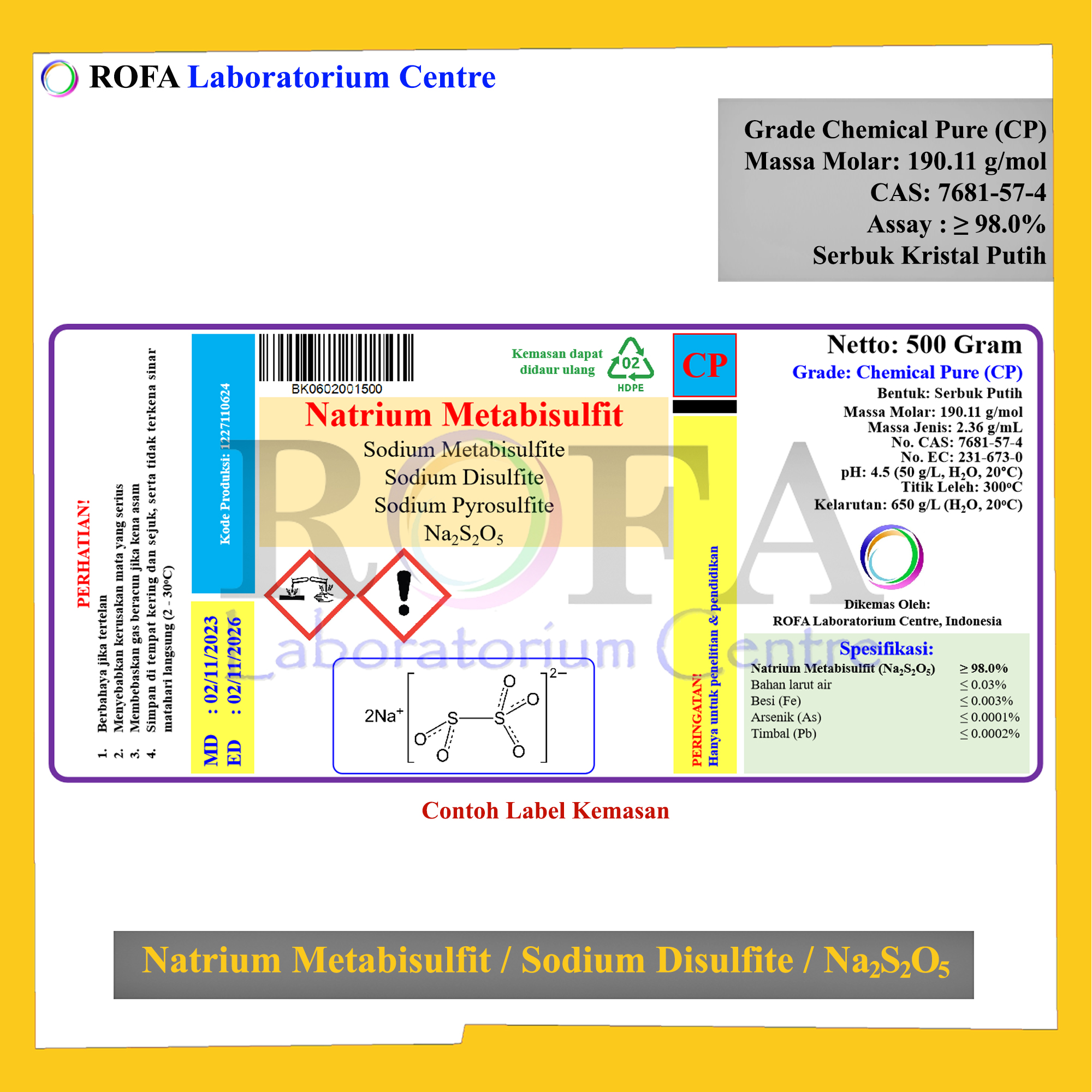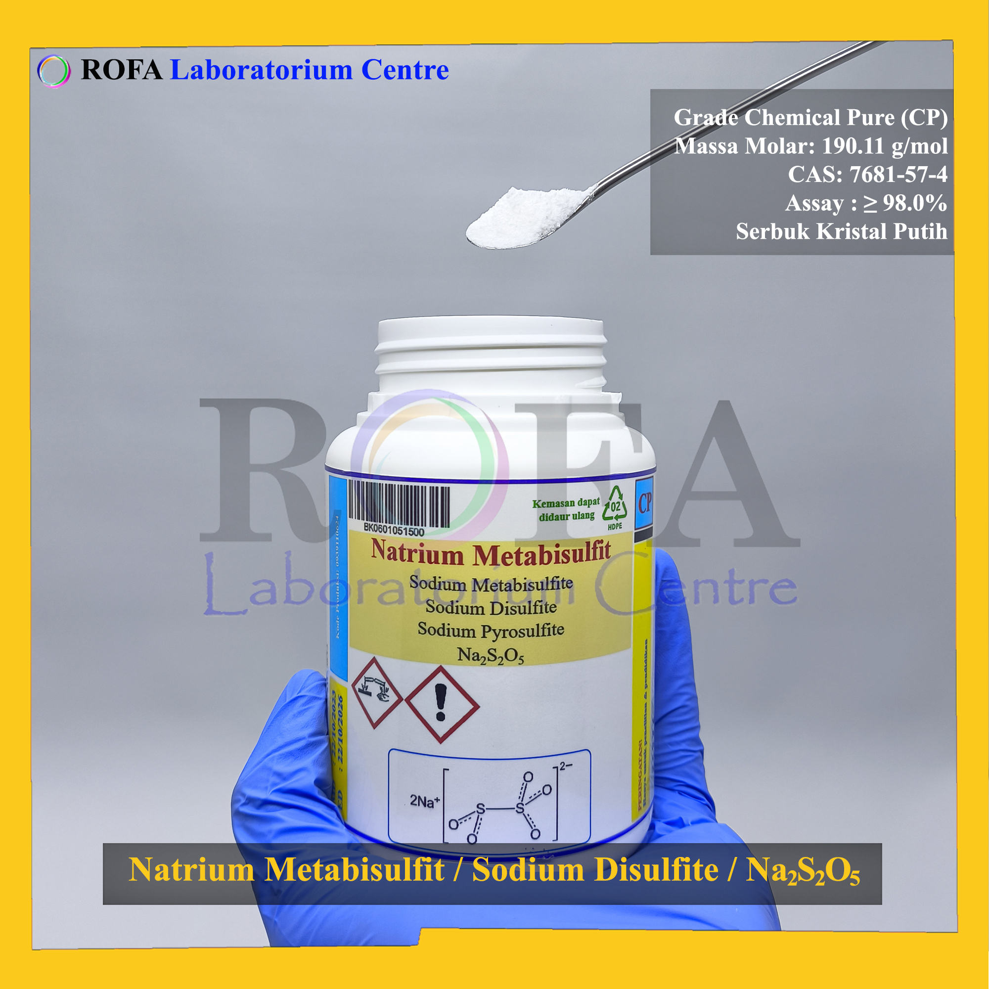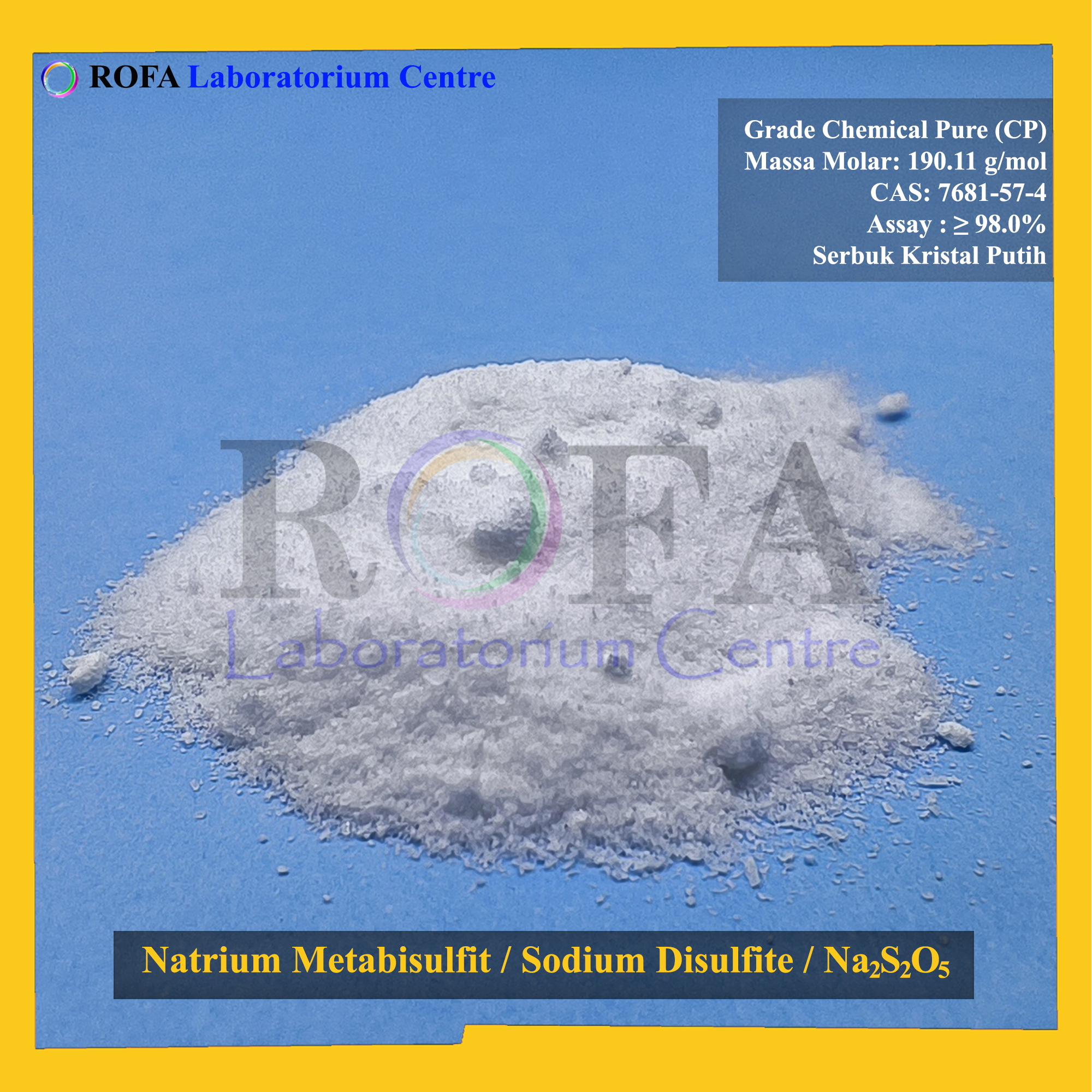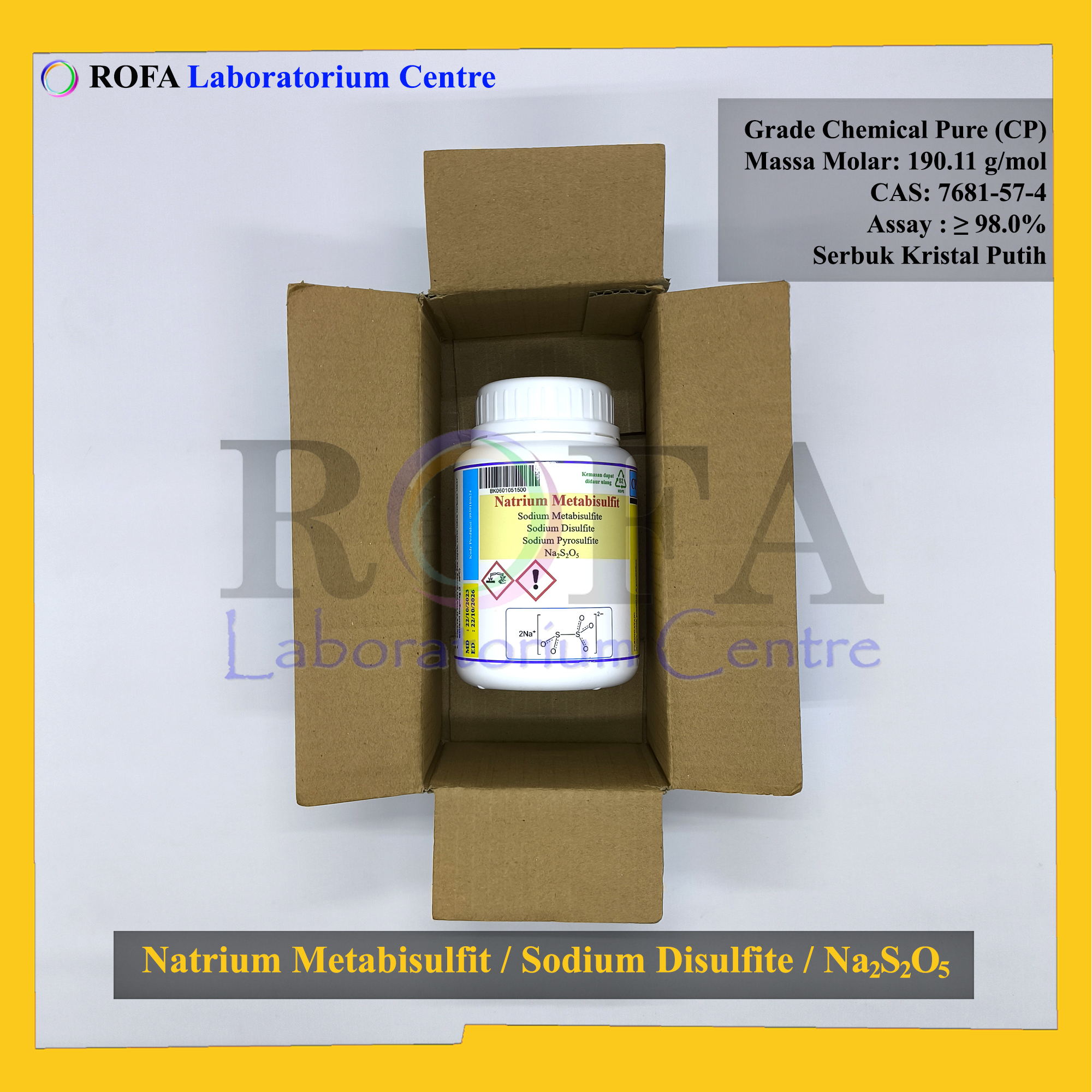 Nama Produk: ROFA Natrium Metabisulfit / Sodium Metabisulfite / Sodium Disulfite / Na2S2O5 CP 500 Gram