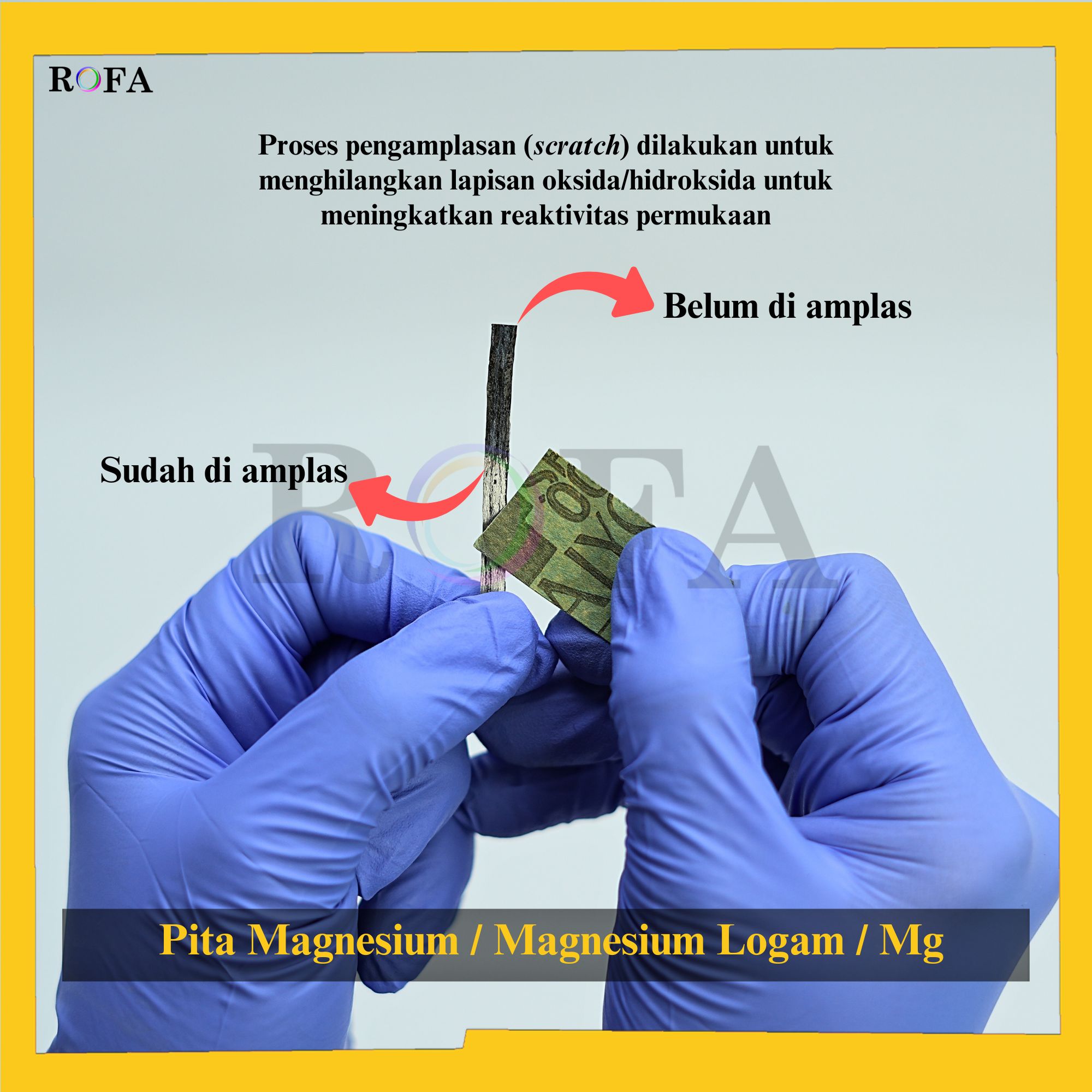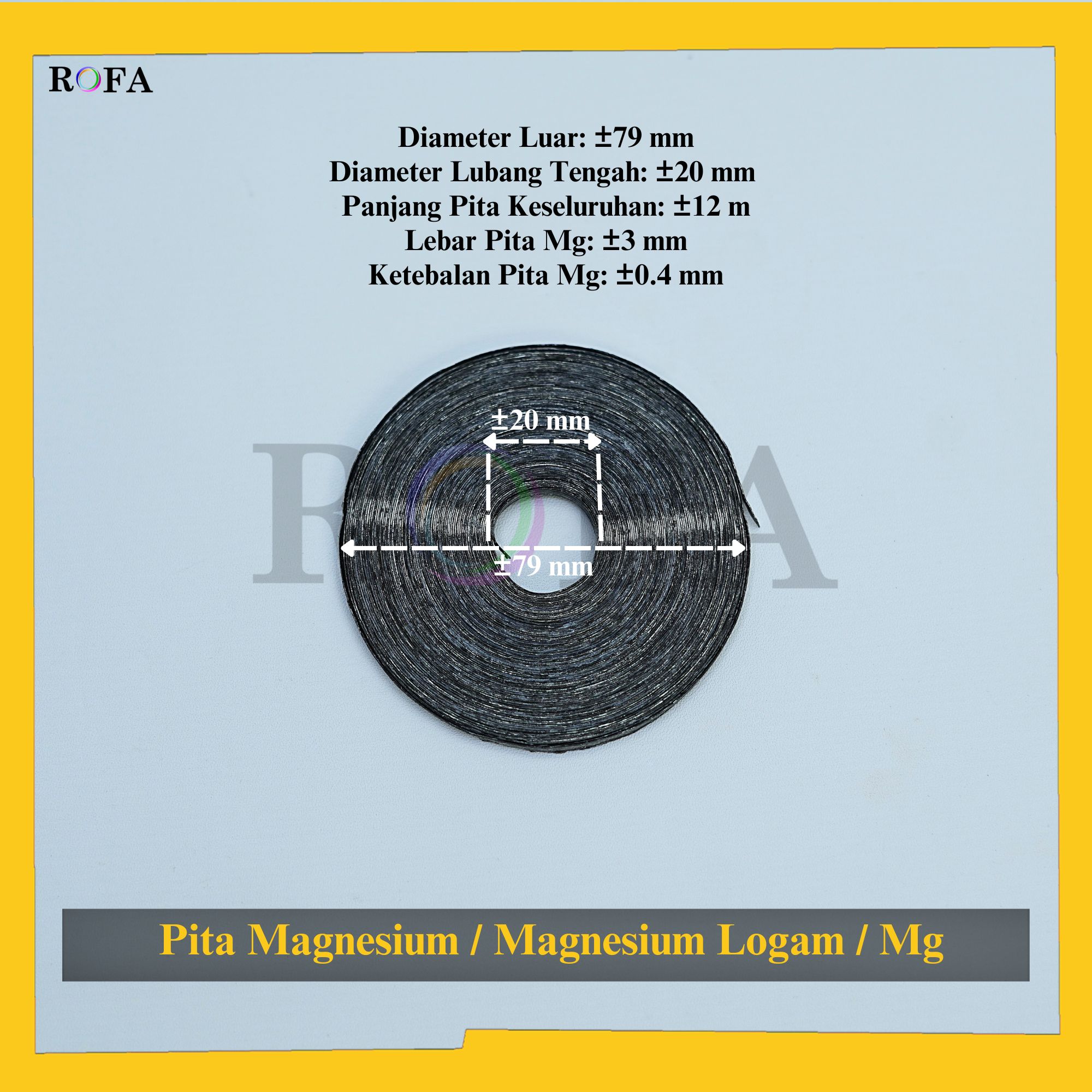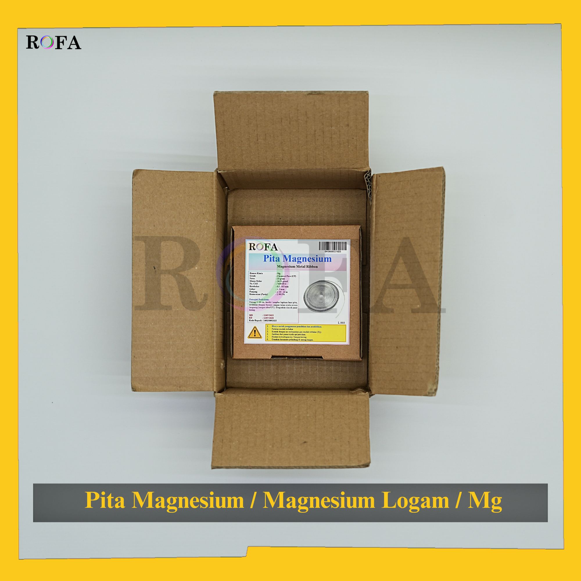 Nama Produk: ROFA Pita Magnesium / Mg / Magnesium Logam / Magnesium Ribbon CP 25 Gram Merek / Brand: ROFA   SPESIFIKASI: Rumus Kimia: Mg Grade: Chemical Pure (CP) Netto: ±25 gram Massa Molar :...