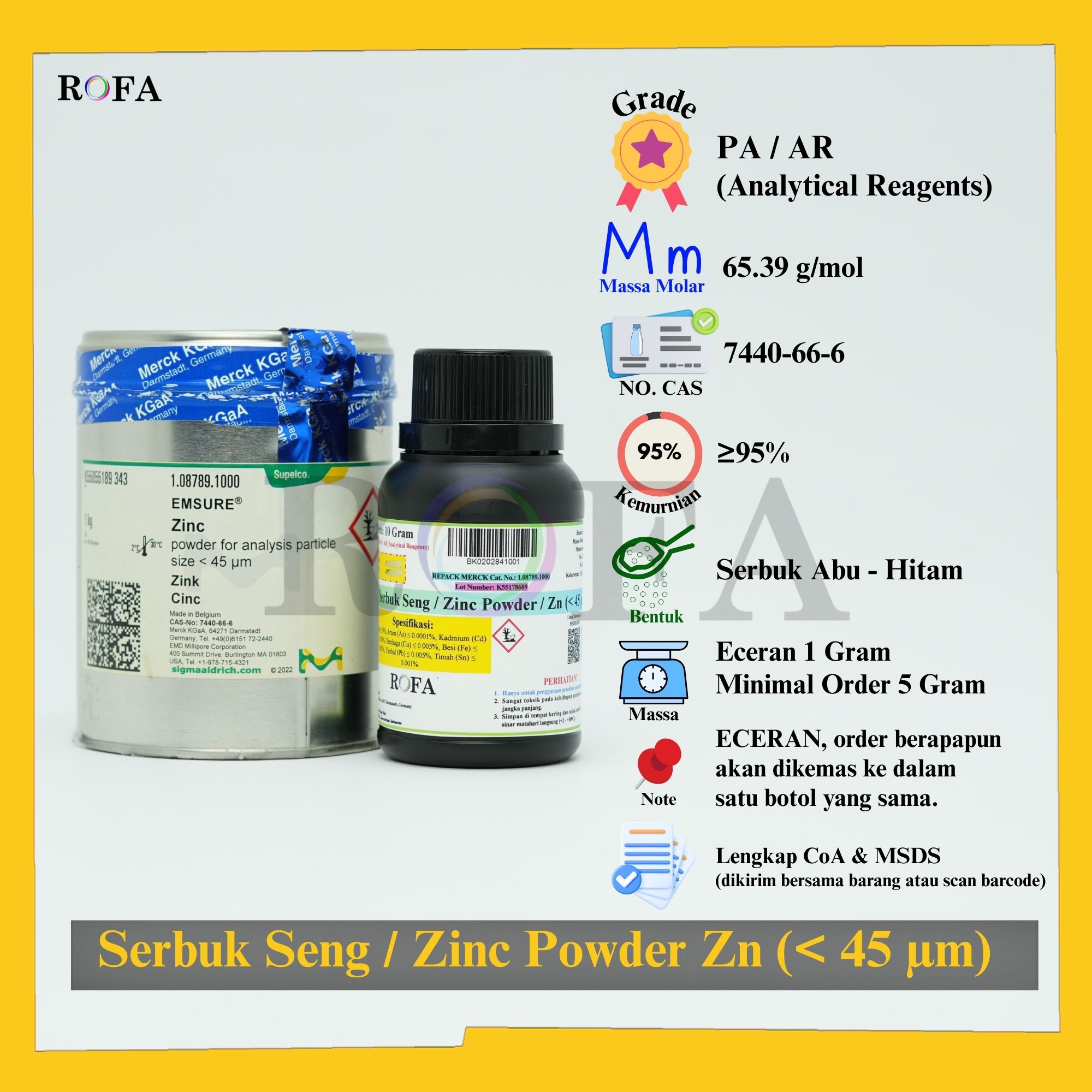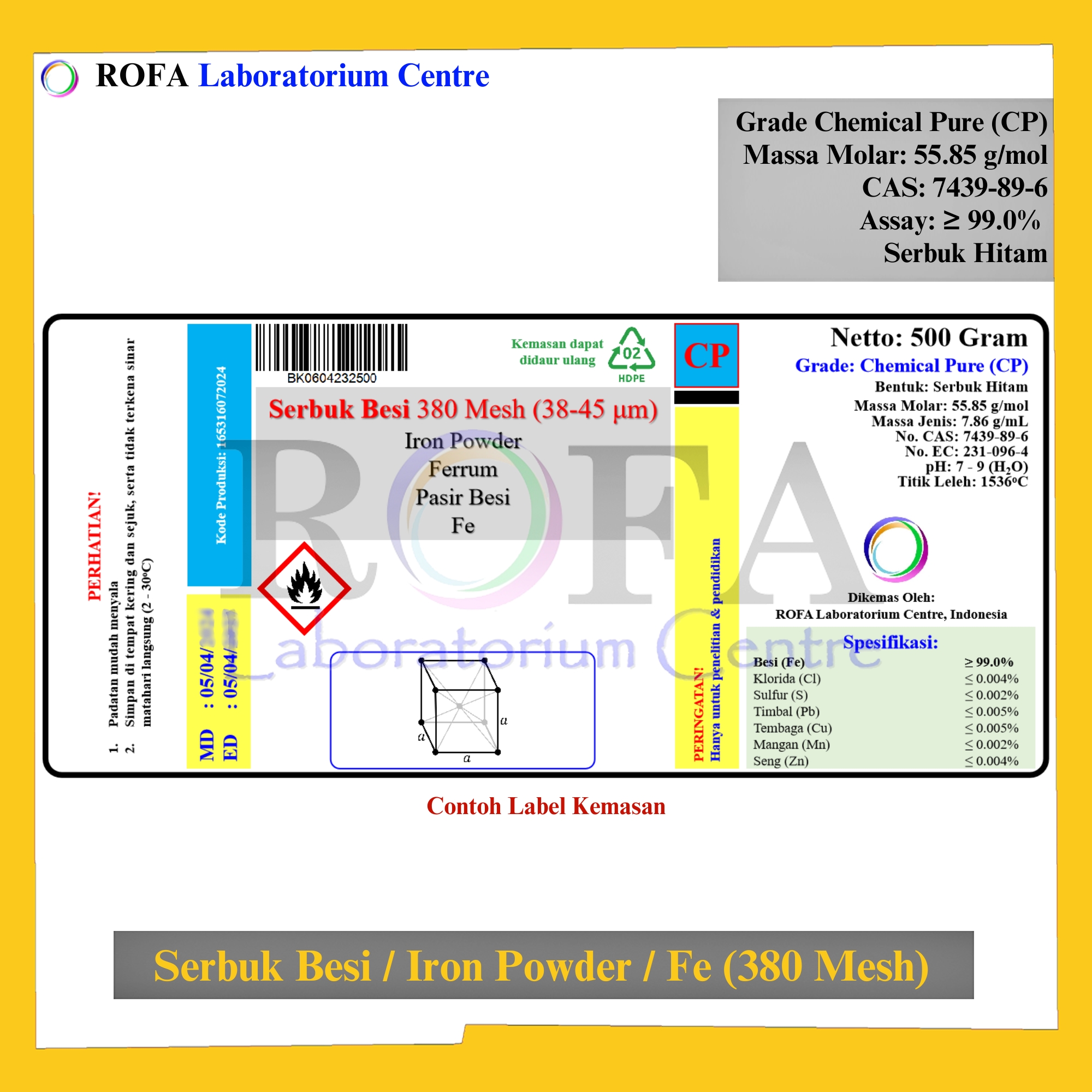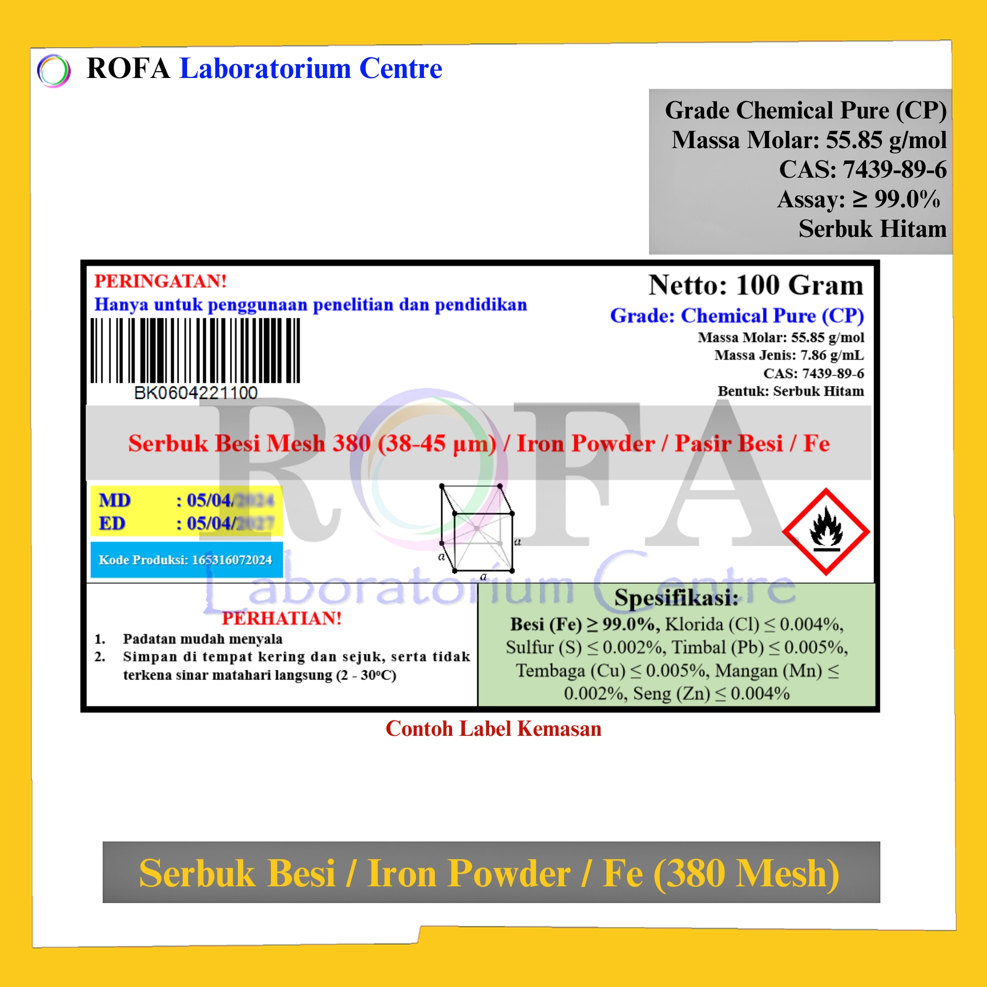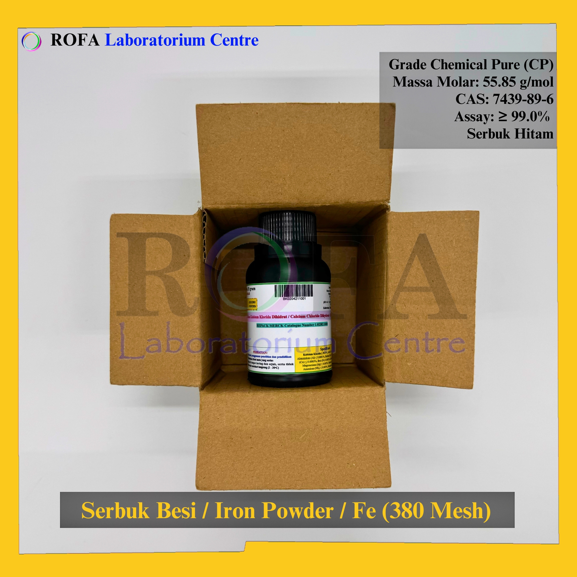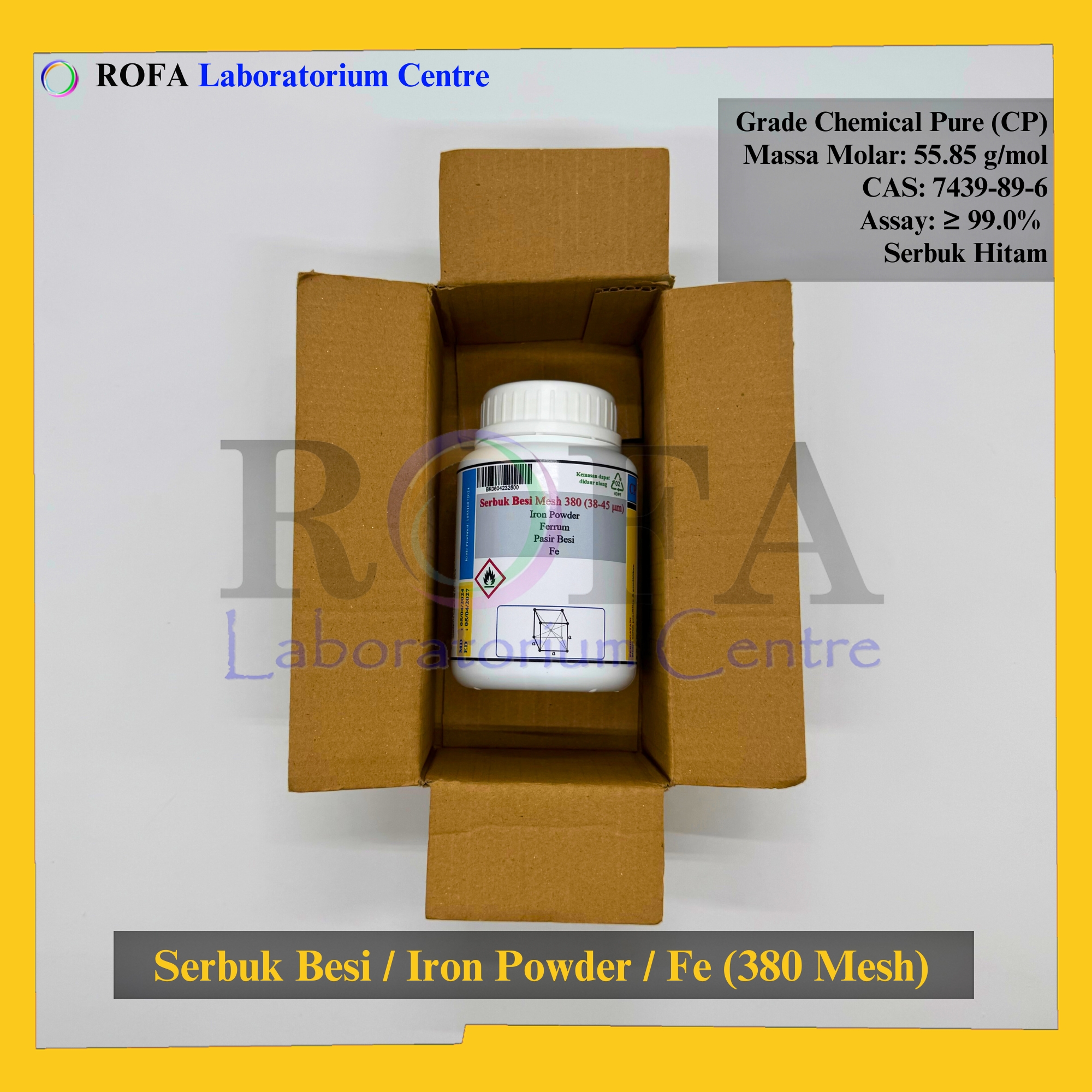 Nama Produk: ROFA Serbuk Besi 380 Mesh / Iron Powder / Pasir Besi / Ferrum / Fe CP 100 – 500 Gram Brand / Merek: ROFA, Bandung NON (CoA) dan NON MSDS / SDS Dikemas...