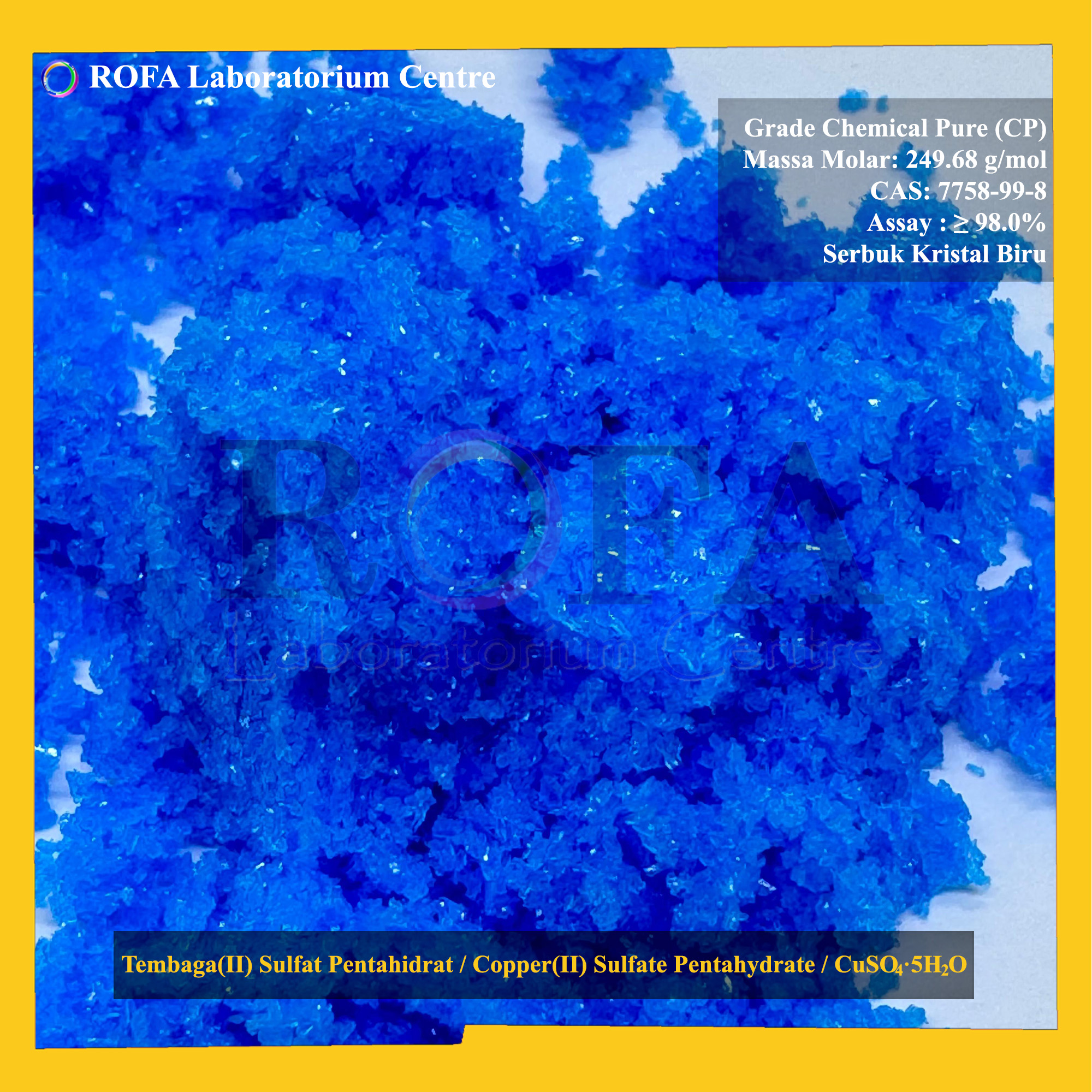 Nama Produk: ROFA Tembaga(II) Sulfat Pentahidrat / Copper(II) Sulfate Pentahydrate / Terusi / CuSO4.5H2O Serbuk CP 500 Gram