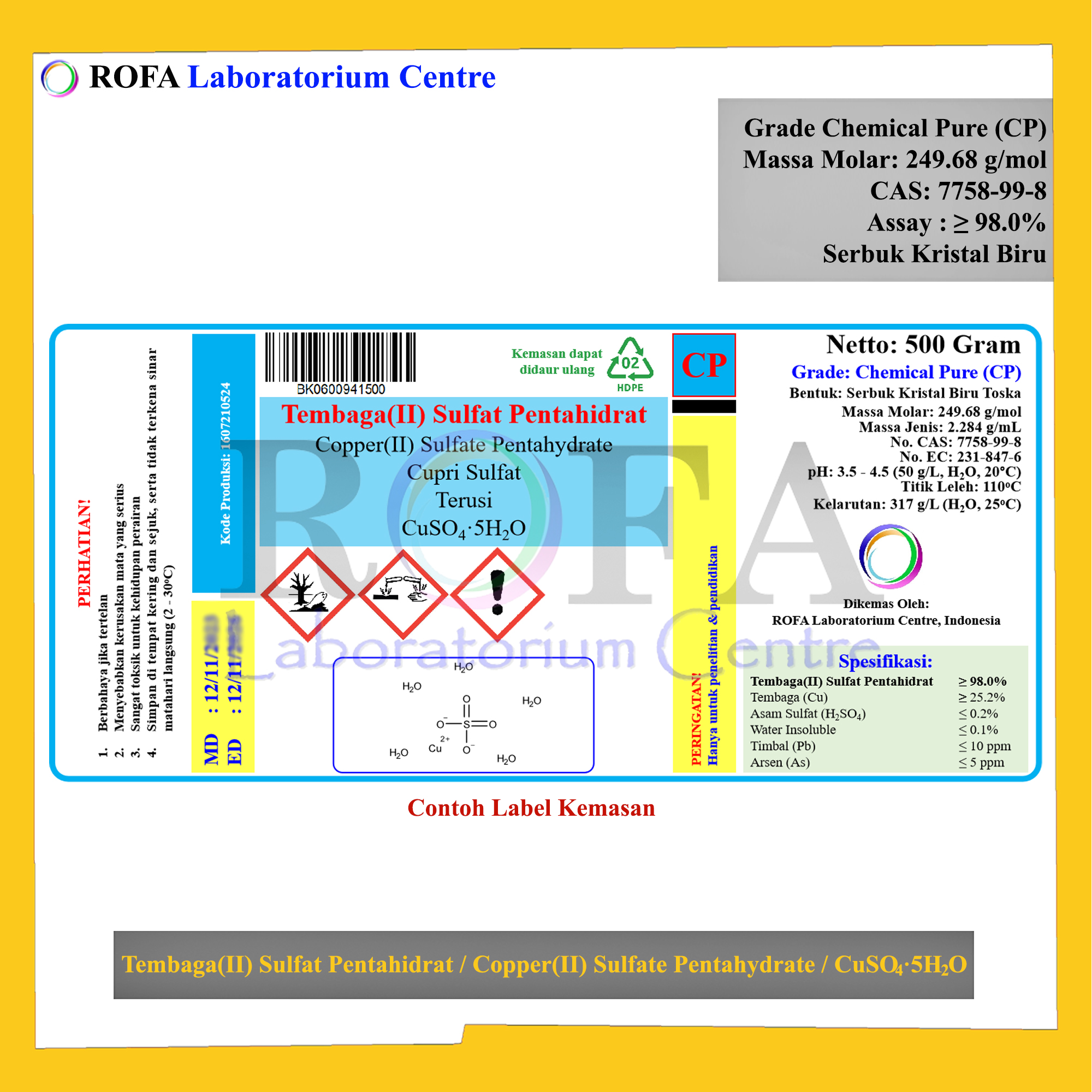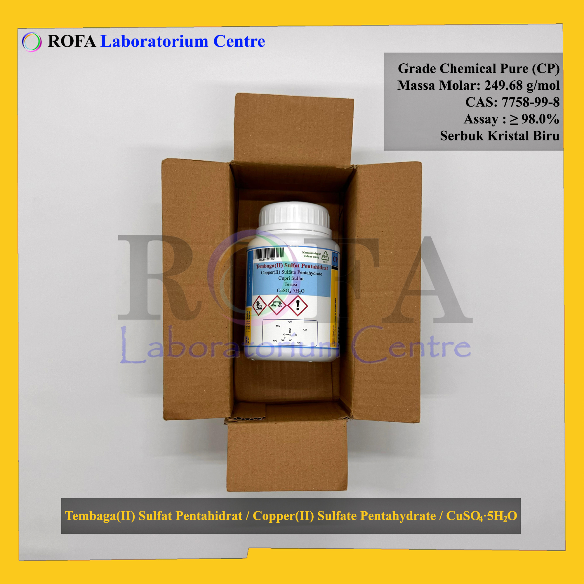 Nama Produk: ROFA Tembaga(II) Sulfat Pentahidrat / Copper(II) Sulfate Pentahydrate / Terusi / CuSO4.5H2O Serbuk CP 500 Gram Brand / Merek: ROFA, Bandung NON (CoA) dan NON MSDS / SDS Dikemas dalam botol Plastik HDPE,...