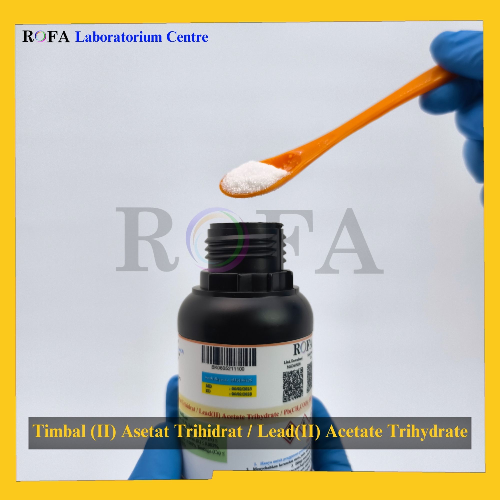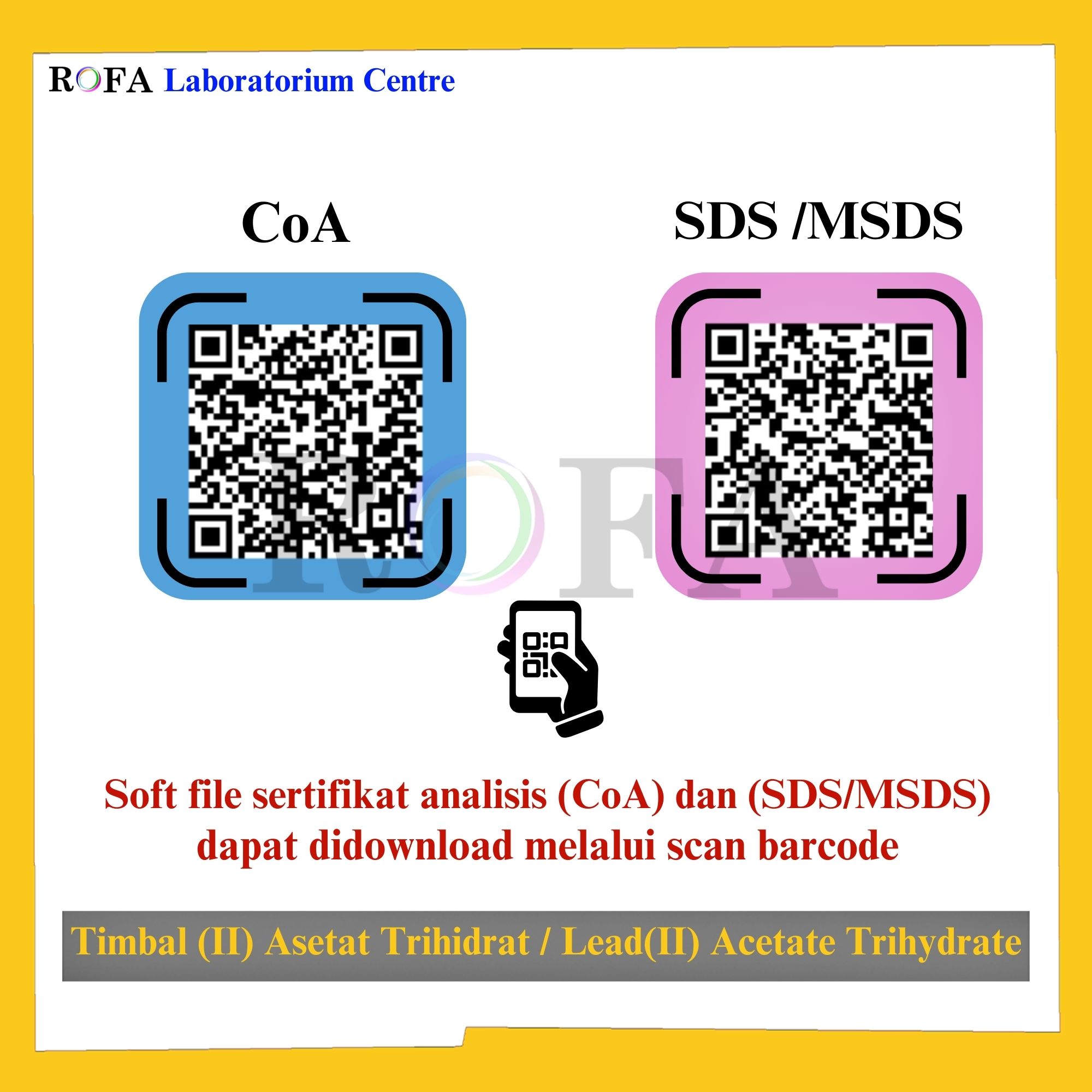 Nama Produk: ROFA Timbal(II) Asetat Trihidrat / Lead(II) Acetate Trihydrate / Pb(CH3COO)2.3H2O CP 50 – 500 Gram   Lengkap dengan dokumen sertifikat analisis (CoA) dan MSDS / SDS (dikirim bersama barang atau bisa scan barcode)....